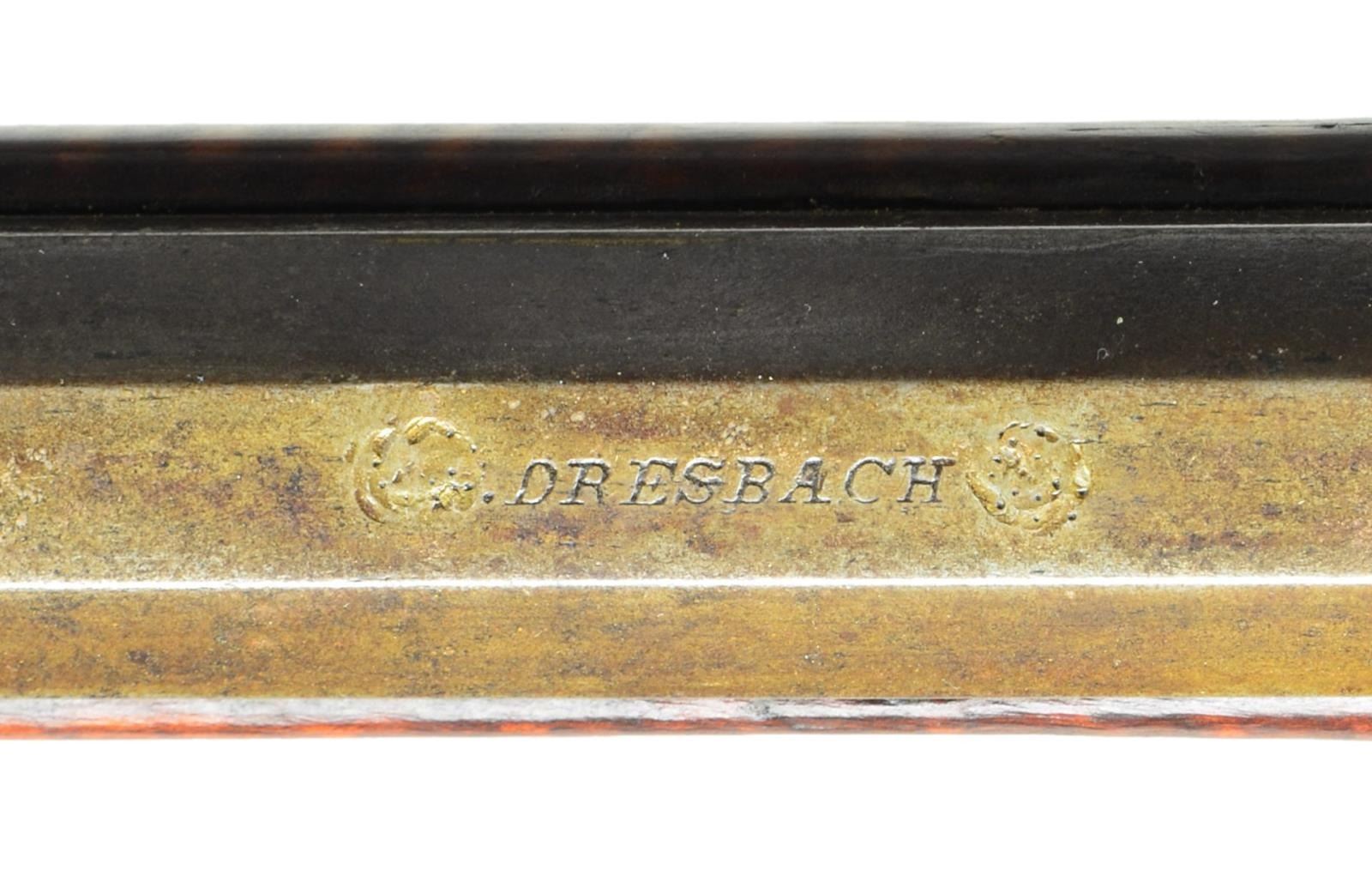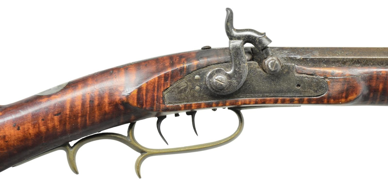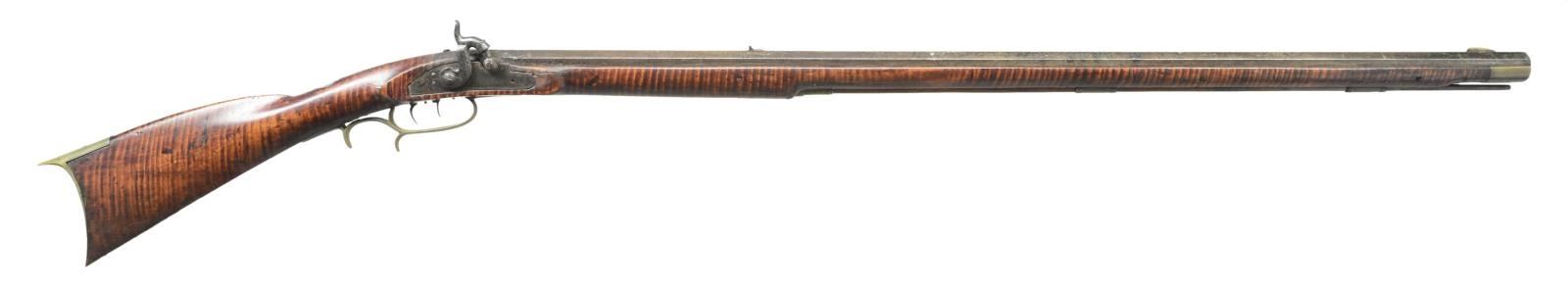 DREISBACH. Cal. 34. NSN. 38 1/2" bbl. is fitted w/ U-notch rear & long brass blade front sights. Top flat stamped "DRESBACH" w/ pinwheel stampings either end (John Dreisbach 1814-1861 Mifflinburg, PA.?). Trade percussion lock marked "Atkinson(?) warranted" & has bird engraving on tail & scroll on flat faced serpentine hammer. Triggers are dbl. set. Full length stock of dramatic curly maple has 1 1/2" brass nosecap & is brass mounted w/ chamfered trigger guard having finger spur & secondary spur forming grip. Crescent buttplate w/ 4" return & nicely shaped sideplate. A silver oval is on top of grip. A simple classic cheekpiece is present on left side. A hickory ramrod is held by 2 faceted & beaded pipes w/ matching tailpipe. CONDITION: fair to good. Bbl. w/ old cleaning is now gray brown patina w/ considerable pitting toward muzzle. Brass well toned. Stock w/ old oil finish is quite striking. Dark bore, rifling evident. Lock & triggers operable. PROVENANCE: Collection of Dr. John Persing. (01-19577/MGM). ANTIQUE. $1,500-2,500.