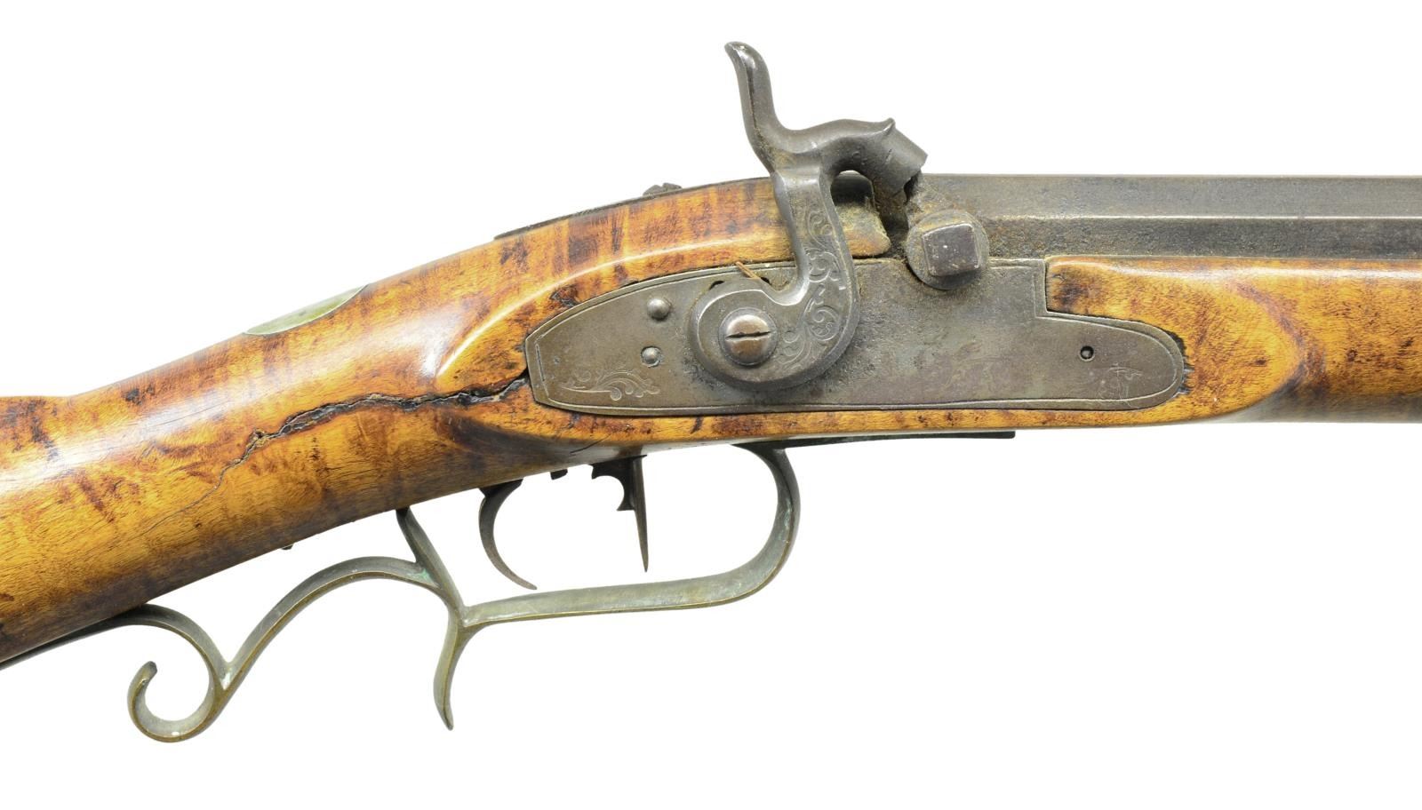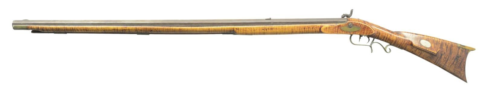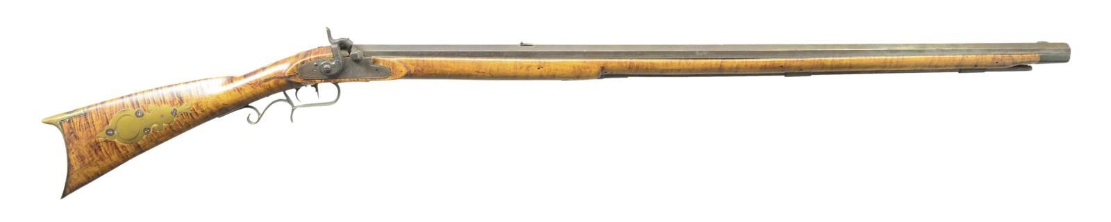 FISHER(?). Cal. 44. NSN. 36" octagon bbl. fitted w/ sm. U-notch & German silver blade front sights is engraved "P G F" on top flat (possibly Paul Fisher of Whitedeer, PA.). Percussion trade lock unmarked except for stamped engraving on tail & flat faced hammer. Triggers are dbl. set. Full length stock of attractive curly maple extends to muzzle w/ 2" brass tip & pinned to bbl. Stock is brass mounted. Trigger guard has finger spur forming grip. Crescent buttplate has 4" return. Circular patchbox on right side has shaped outline to housing. Lozenge shaped sideplate. German silver decorations include vacant ovals at top of grip & on face of sm. shadowline cheekpiece. Hickory ramrod is held by 2 beaded pipes & matching tailpipe. CONDITION: iron parts cleaned to silver highlighted brown. Brass w/ good toning. Stock w/ old oil refinish. Sharp edges rounded w/ a considerable number of bumps & knocks. There are noted flaws in wood at rear of lock which were in the original blank. Bore is good, lightly pitted throughout. Rifling is strong. Lock & triggers are operable. PROVENANCE: Collection of Dr. John Persing. (01-19610/MGM). ANTIQUE. $1,500-2,500.