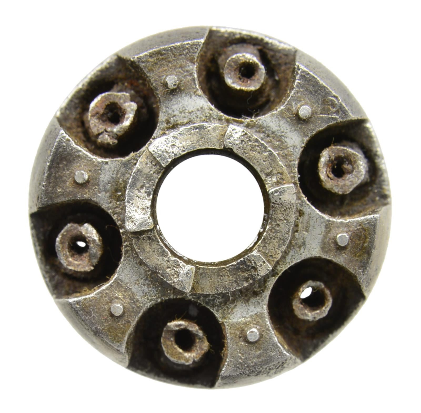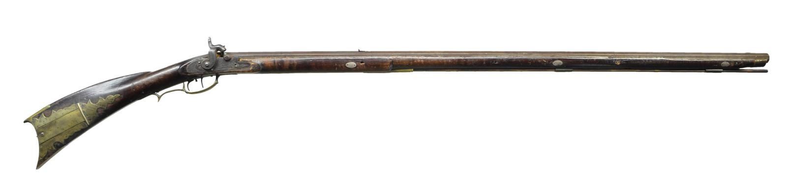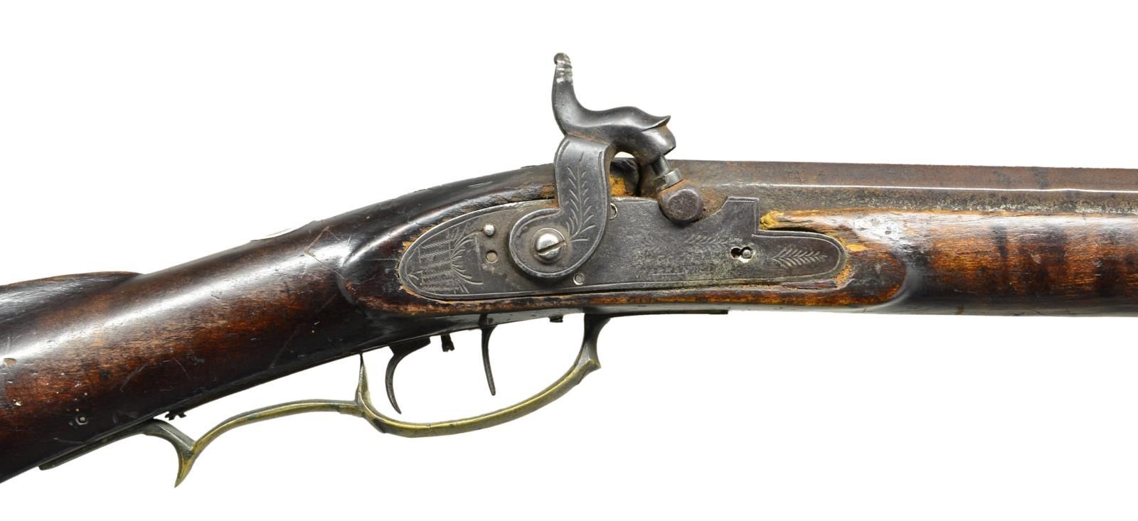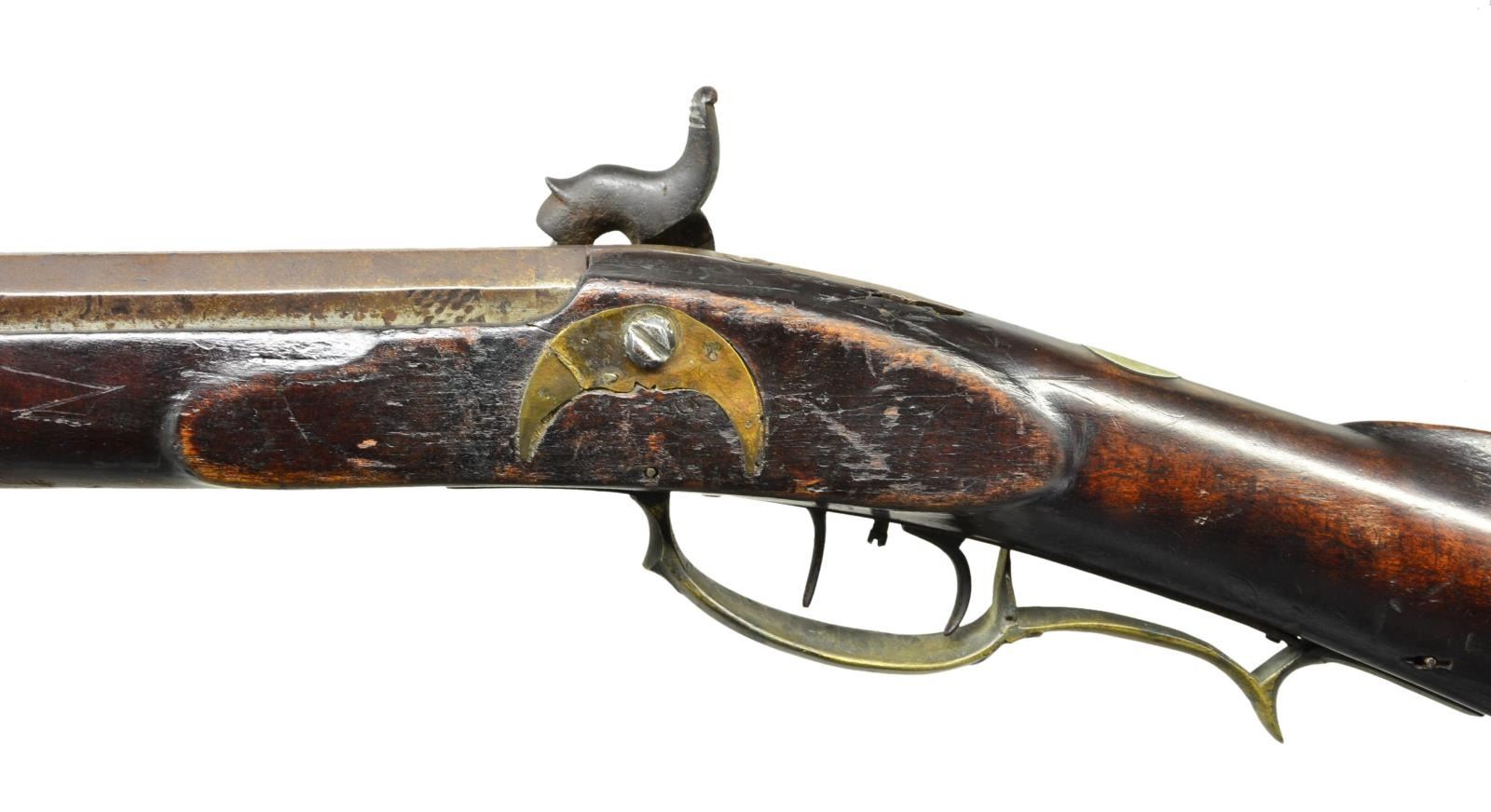 Cal. 40. NSN. Unmarked 41 1/2" octagon bbl. Blade front sight w/ fixed V notch rear sight. Bolster style percussion conversion. Converted engraved trade lock is marked “JAS. GOLCHER/WARRANTED”. Double set triggers. Pin fastened full length walnut stock w/ Roman nose. Segmented rectangular lid patchbox. Other brass fittings include crescent buttplate, toe plate, finger curl trigger guard, old man in the moon side plate, thimble, 2 faceted pipes & nose cap. German silver ornamentation includes old man in the moon cheek piece plate, oval wrist plate w/ 3 sets of ovals on the forearm. Replacement hardwood ramrod. CONDITION: metal finish has faded to a mottled brown w/ scattered pitting becoming heavier in breech area. Stock has worn aged darkened appearance w/ scratches & marks. Area above lock shows wood erosion. Forearm has chips around pin holes w/ cracks & chips along bbl. channel. Lock & trigger are not functioning properly. Hammer spur has freshly cut grooves. Dark pitted bore. PROVENANCE: Collection of Dr. John Persing. (01-22307/DS). ANTIQUE. $700-1,000.