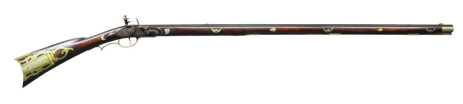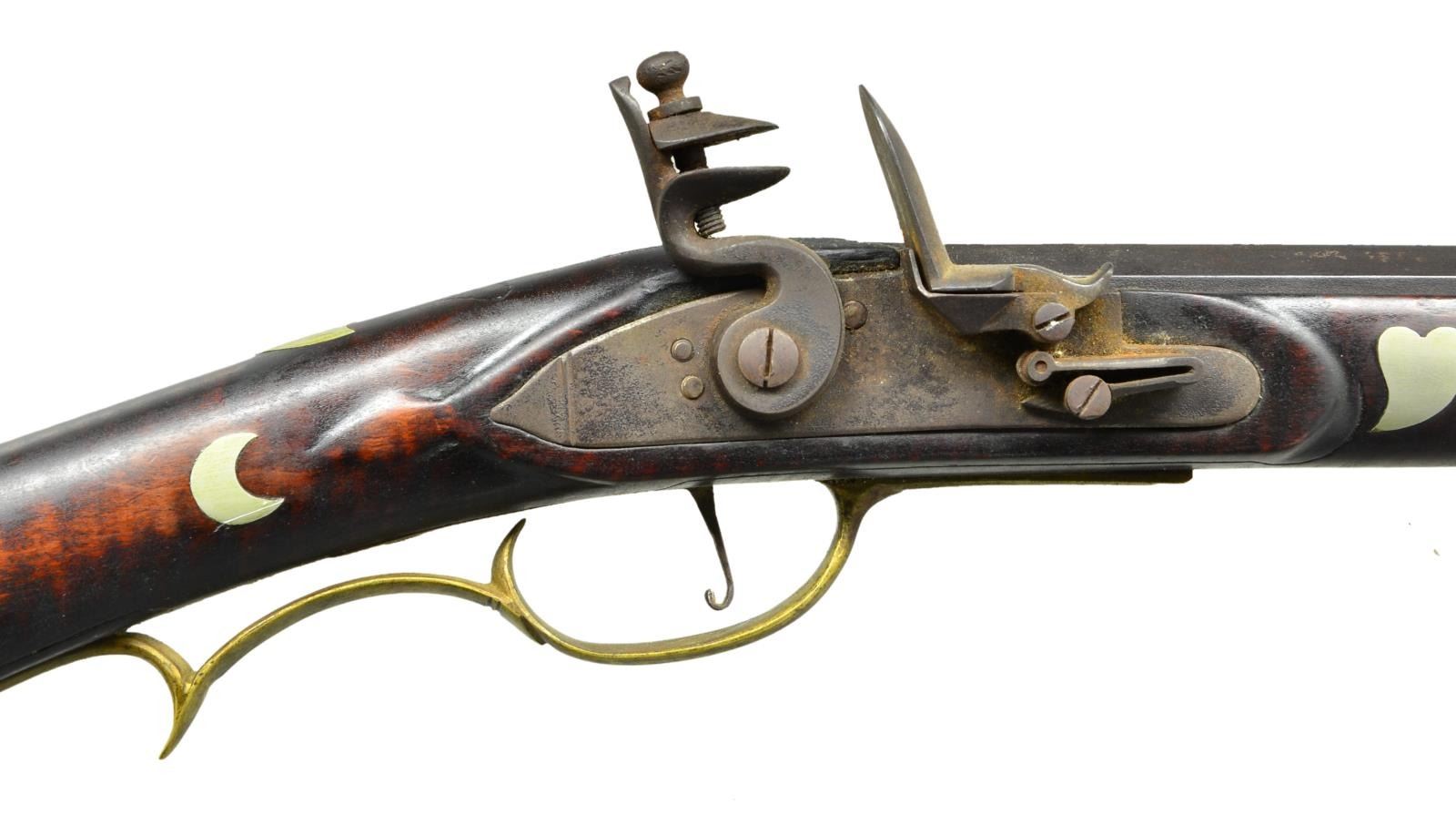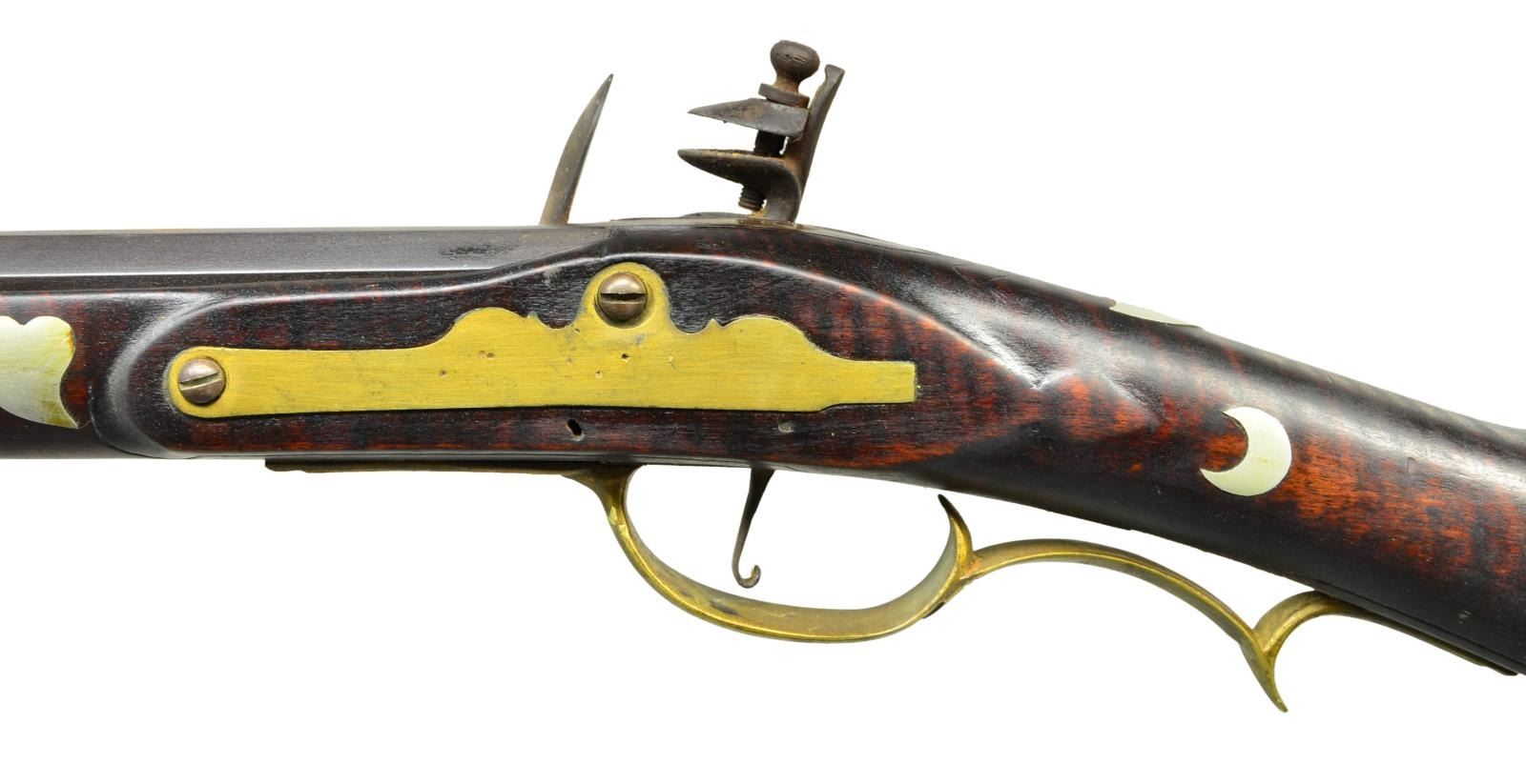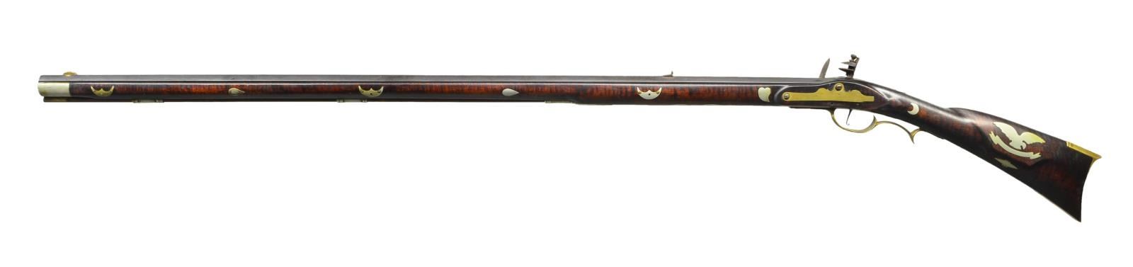 Cal. about 42. NSN. Bbl. 39 3/4" octagon measuring 13/16" across flats at muzzle. Top flat engraved “S Baum East Buffalo PA”. Brass blade front sight w/ fixed V notch rear sight. Unmarked trade lock. Plain trigger. Trim pin fastened full length curly maple cheekpiece stock. Incise carving is found around toeline, lock, sideplate & top tang. Left side has German silver plain non engraved rectangular lid pierced & segmented patchbox. Brass fittings include crescent buttplate, toeplate, finger curl trigger guard & sideplate. German silver ornamentation includes eagle, banner & eight point star in cheekpiece area w/ two half moons & shield around wrist. Forearm ornamentation includes fancy forearm plate bordered by tear drops w/ hearts forward of lock area, three sets of old man in the moon form the pin escutcheons w/ 2 sets of tear drops between them. Additional silver forearm fittings include faceted thimble, 2 faceted pipes & nose cap. Brass tipped hardwood ramrod. American Gunsmiths by Frank Sellers gives the name Samuel Baum in three different listings for Pennsylvanian makers of original Kentucky rifles. WEIGHT: 7 lbs. 2.6 oz. CONDITION: bbl. & lock have a dark brown appearance w/ surface corrosion on lock. Brass & German silver have an applied patina. Stock has a very good intentionally aged finish. Sound lock. Bore is bright w/ strong rifling. (01-21720/DS). ANTIQUE. $1,000-2,000.