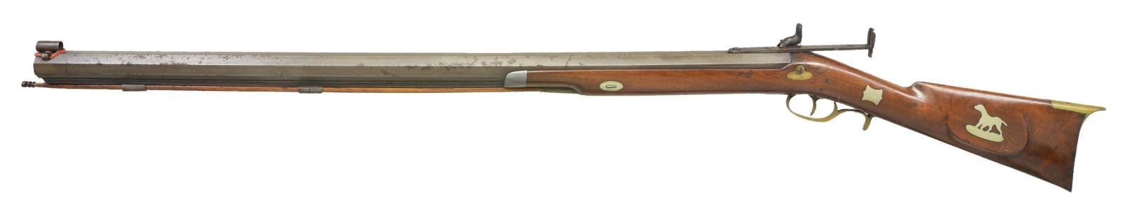 PERCUSSION RIFLE. Cal. 36. NSN. Bbl. 33 1/2" oct. measuring 1.16" across flats & has holes for starter. Globe post front sight & extended aperture receiver sight: 37" between sights. Back action hammer lock w/ light engraving. Half length wedge fastened stock. Brass crescent buttplate, toeplate, thimble, sideplate & finger curl triggerguard. Pewter nose cap. German silver ornamentation includes wedge escutcheons, 3 stars on left side, 2 wrist plates & dog on cheekpiece. Hardwood ramrod held on underrib & 2 plain pipes. UNATTACHED ACCESSORIES: muzzle starter. CONDITION: bbl. has fair appearance of brown/gray patina w/ areas of cleaning oxidation & pitting. Front sight dovetail shows red epoxy filler. Wood has good heavy varnish showing filled & exposed gouges, impressions & sm. crack in front of lock. Brass & German silver show pleasing patina. Very good shiny bore. (01-21746/MD). $400-600.