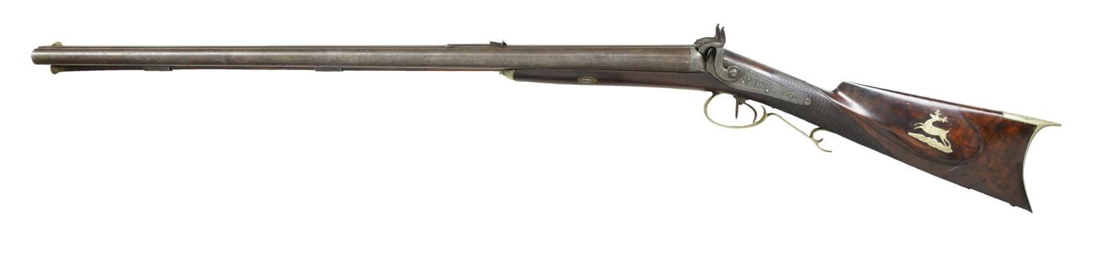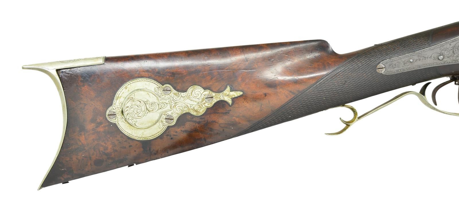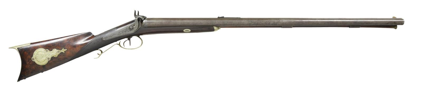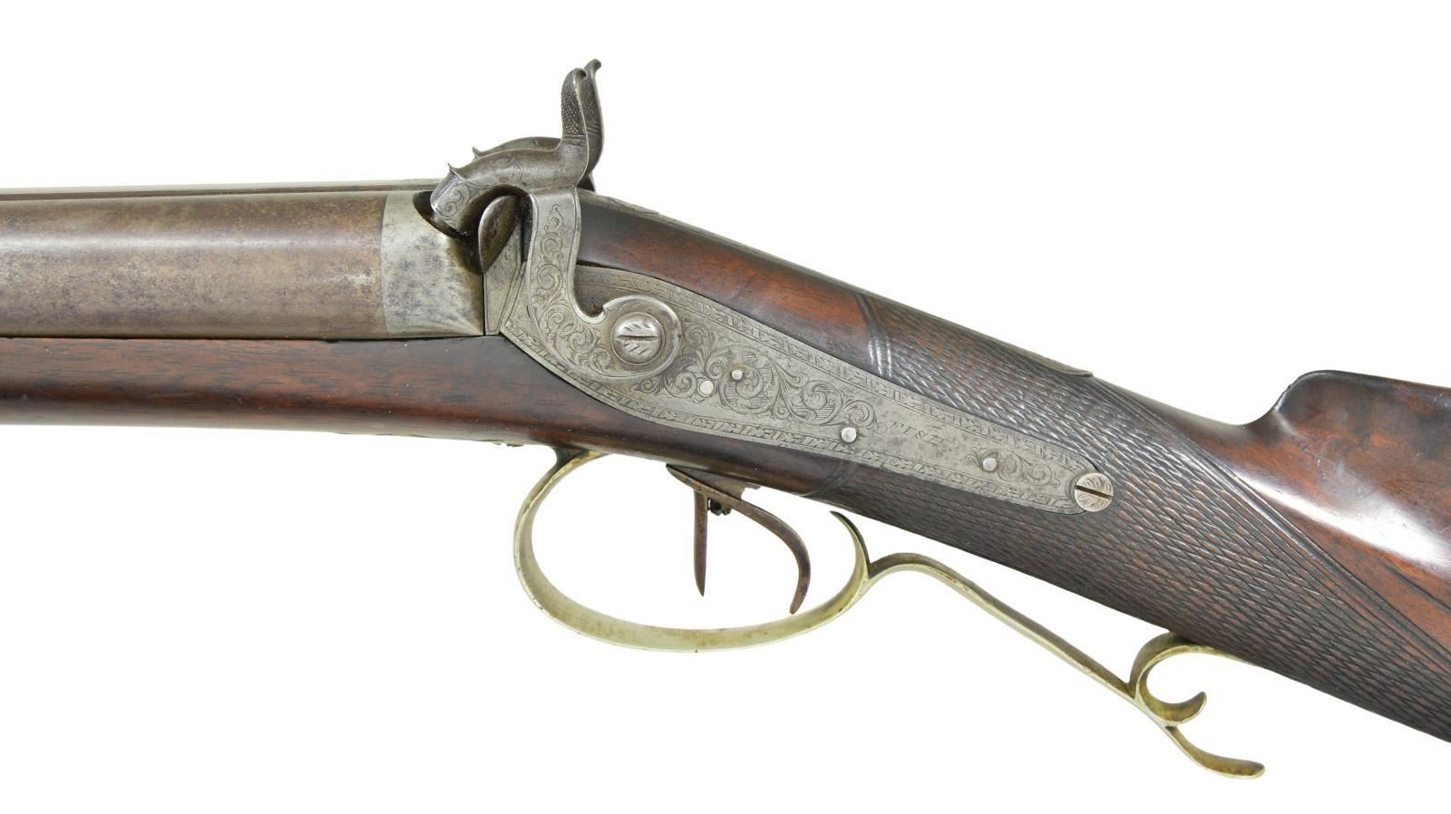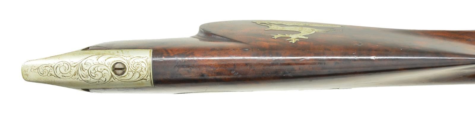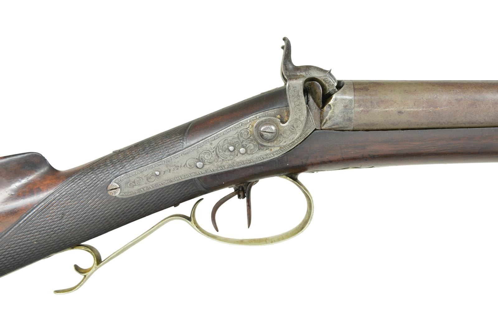 YORK. Cal. 12 Ga. / 40, left to right. NSN. Bbl. 30 1/4", rifled right side, signed "D. FISH NEW YORK." The finely engraved back action percussion locks are simply signed "Fish". The stock is nicely checkered at the wrist, & the silver cap box is finely engraved. The cheek piece features an inlay depicting a running stag & is also very nicely engraved. The top of the silver buttplate is engraved as is the 5" long bbl. tang. The silver ramrod entrance furl & the silver trigger guard are also elaborately engraved. "Daniel Fish, a gun maker in New York City, is identified as having been arrested for treason in late April 1861 for 'having sent of large quantities of arms for the use of the Southern traitors. The correspondence and bills of lading found in his possession abundantly sustain the charge.' Fish appears to have been active c.1840-1870. He was listed at 68 West Broadway in 1842 and 374 Pearl Street in 1845. One of his trade labels listed him as a gun and rifle maker at 66 Fulton Street in New York, and he was still listed at that address as a gunsmith in 1865. He appears to have lived 1805-1873 based on a grave in Green-Wood Cemetery in Brooklyn." (The Rebellion Record edited by Moore). CONDITION: gun is in fine condition throughout. Engraving is all sharp & outstanding. 4-3/4" Long toeplate which would assumedly also be silver & engraved is missing. Trigger guard behind the bow seems to have been slightly bent out of shape. PROVENANCE: Estate of Frank Glenn Marsh. (01-21261/RG). ANTIQUE. $800-1,200.
