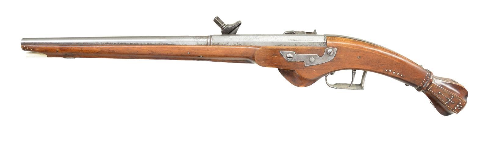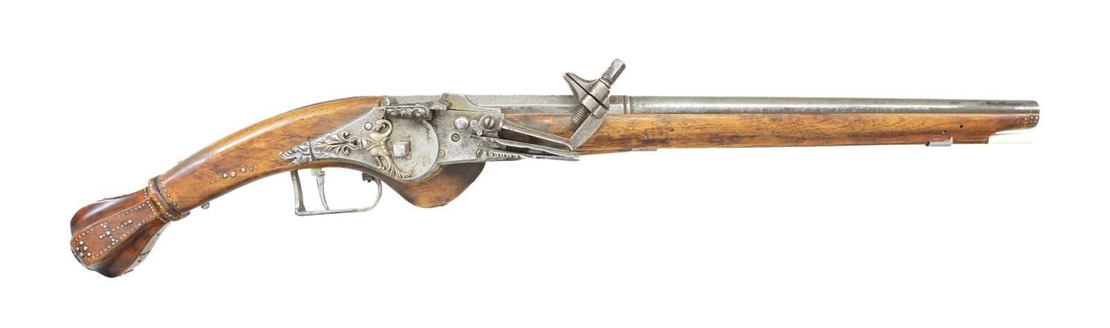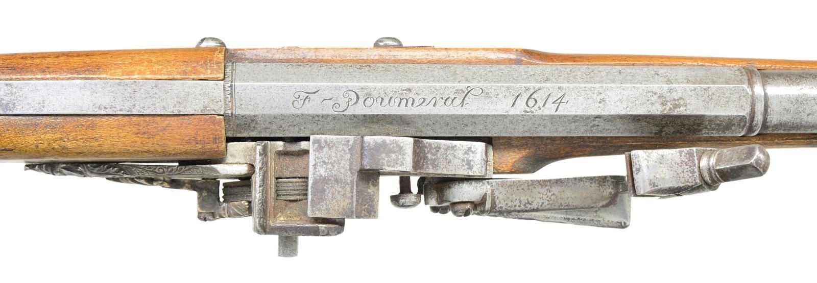 Cal. 44. NSN. Bbl. 16 3/8" round w/ transition to octagon shank. Top flat is script engraved “F-Poumeral” followed by date “1614”. Ornate wheellock w/ dragon’s head at lock's tail & dragon motif silver cover over the wheel. Iron trigger plate & trigger guard. Pin fastened stock w/ moldered border along ramrod channel. Fluted butt w/ steel cap. Butt section & forearm tip have studded tack ornamentation. Hardwood ramrod has white tip. CONDITION: bbl. & lock have cleaned gray appearance showing scattered corrosion. Wood has unusually good finish for its age showing scattered scratches & marks. Dark pitted bore. (01-23072/DS). ANTIQUE. $1,500-2,500.
