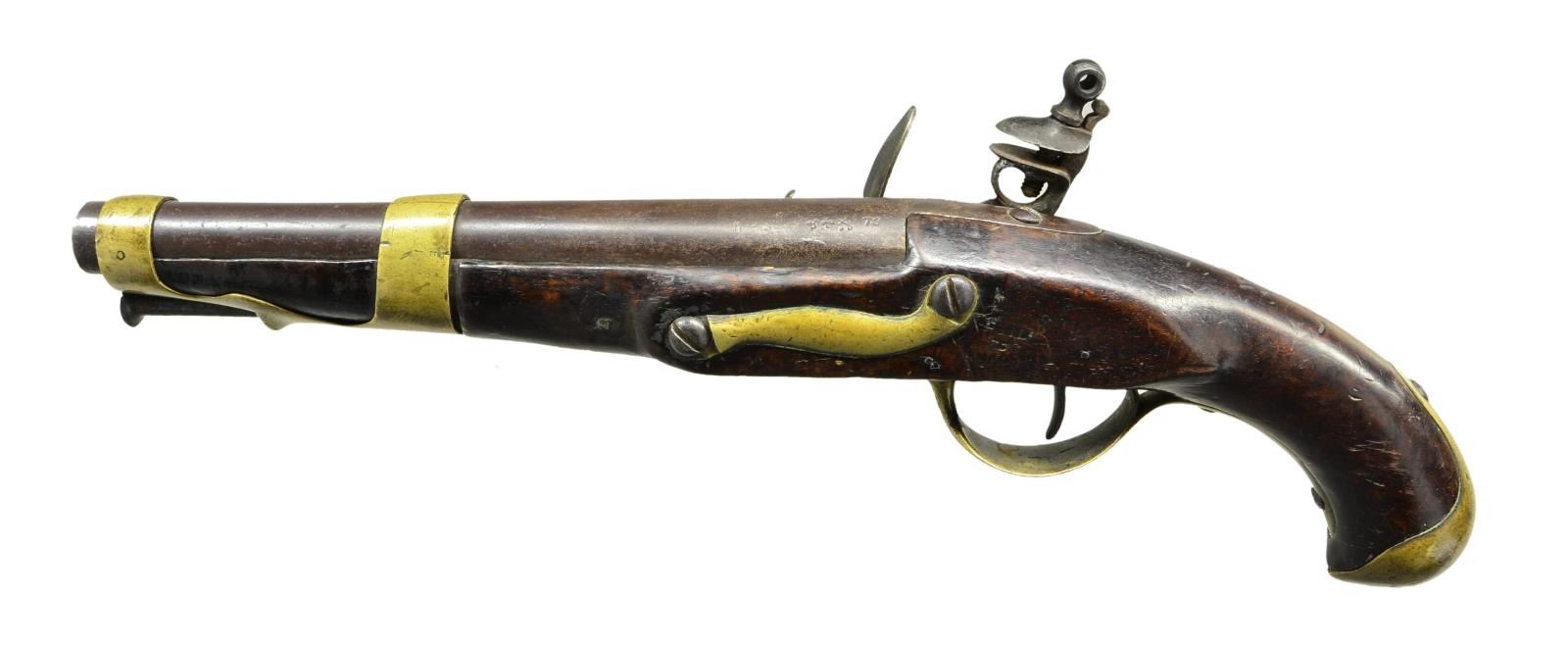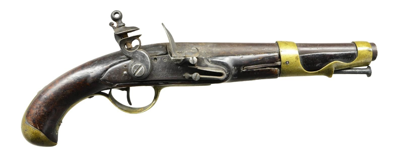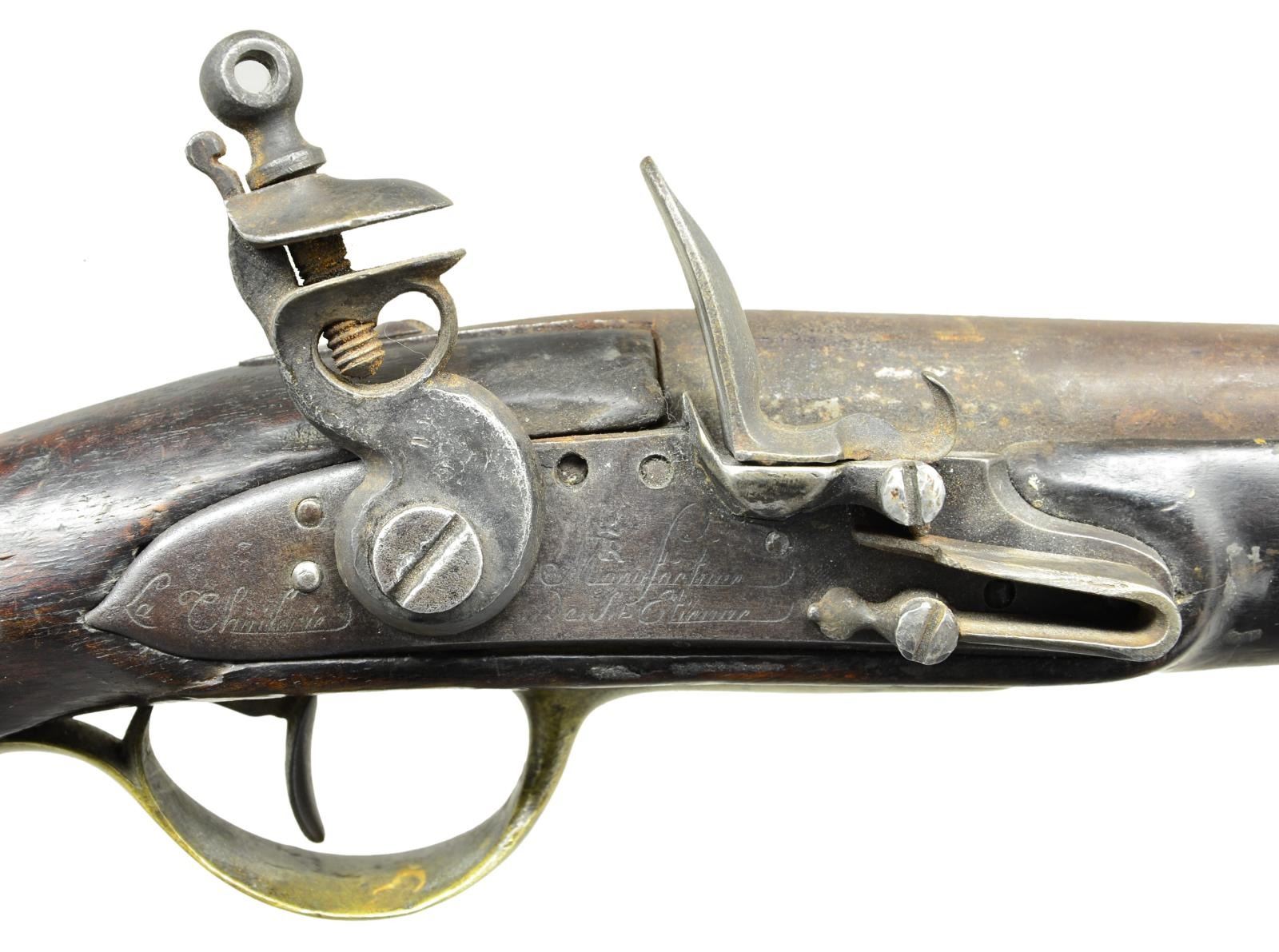 Cal. 65. NSN. Bbl. 9 1/8" w/ smoothbore. Left side of breech end has three French proof marks followed by a date of “75”. Lock has a crown “R” over “Manufacture de St. Entienne”. Behind hammer the lock is marked “Chuilerie”. Band fastened walnut stock. Left ear has several lightly visible markings. Brass fittings include butt cap, trigger guard, side plate & forearm band. Button tip iron ramrod. CONDITION: metal has a dark brown patina showing rust & pitting in breech area. Brass has mottled aged patina. Wood has a dark appearance w/ numerous dents & marks having cracks & chips in forearm area. Sound lock. Dark lightly pitted bore. (01-23050/DS). ANTIQUE. $1,200-1,800.