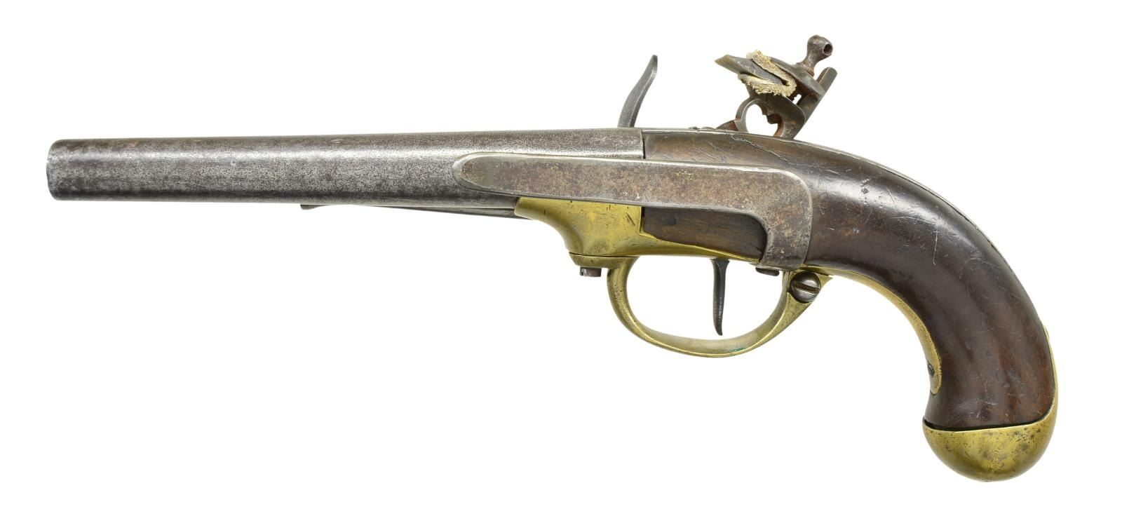 Cal. 62. NSN. Bbl. 7 1/2" round. Left side at breech is marked “82”. Brass boxlock action marked “St. Etienne” below the hammer w/ proof mark forward of hammer. Brass buttcap, iron backstrap, belt hook & trumpet tipped ramrod. CONDITION: metal parts have clean gray appearance w/ scattered light pitting. Brass shows cleaning w/ scattered handling marks. Sound lock. Walnut grips shows heavy wear w/ dents & marks having a crack left of top tang. Dark pitted bore. (01-23033/DS). ANTIQUE. $1,200-1,800.