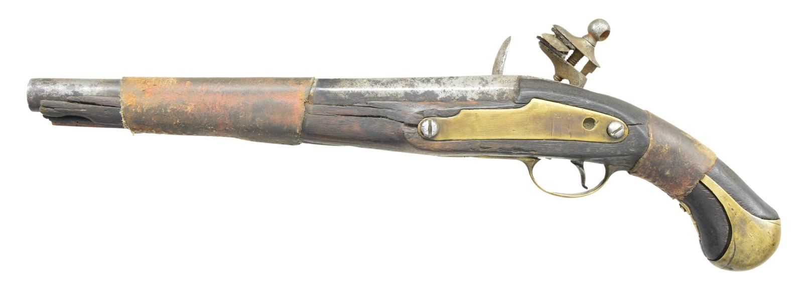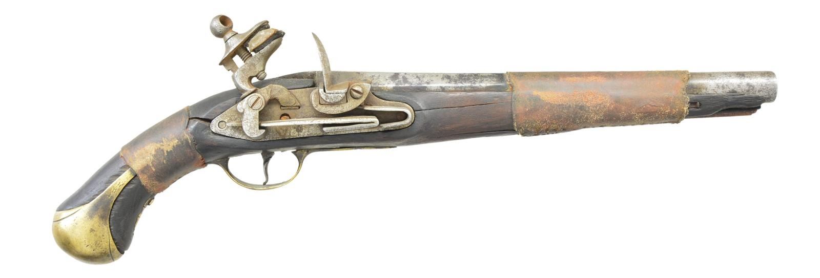 PISTOL. Cal. 65. NSN. Bbl. 11 3/4” round w/ octagon shank & smoothbore. Top flat of bbl. is dated 1811. Left flat has crown over “R” proof. Unmarked iron Miquelet lock. Walnut stock has added leather wrappings & wrist and forearm. Brass fittings consist of butt cap, trigger guard & side plate. CONDITION: metal has gray appearance showing scattered heavy pitting. Oil soaked stock is broken through wrist, side plate, lock & forearm areas & held together by leather bands. Functioning lock. Dark heavily pitted bore. (01-23039/DS). ANTIQUE. $800-1,200.