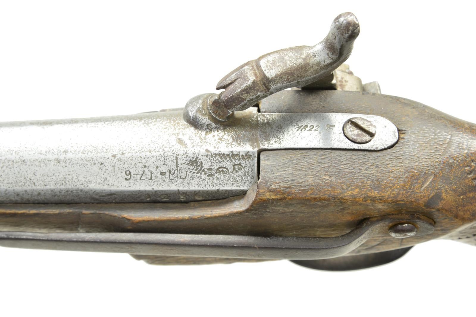 Cal. 70. S# 1236 (1822). Bbl. 7 7/8" smoothbore w/ swamped muzzle & engraved faceted transition. Breech section of bbl. has extensive cartouches including S# 1236 & "C de 17-6" appearing to indicate 17th Cavalry, 6th Trooper. Top tang marked "1822 C'. Hardwood stock w/ punch dot grip, iron button tipped ramrod, left side belt hook, bbl. band & buttcap. CONDITION: metal has gray patina appearance w/ heavy pitting around nipple, at muzzle & on top of ramrod. Worn stock has notable gouge at wrist along w/ sm. gouges, marks & scratches. Belt hook shows loose play. Dark pitted bore. (01-23042/MD) . ANTIQUE. $700-1,000.