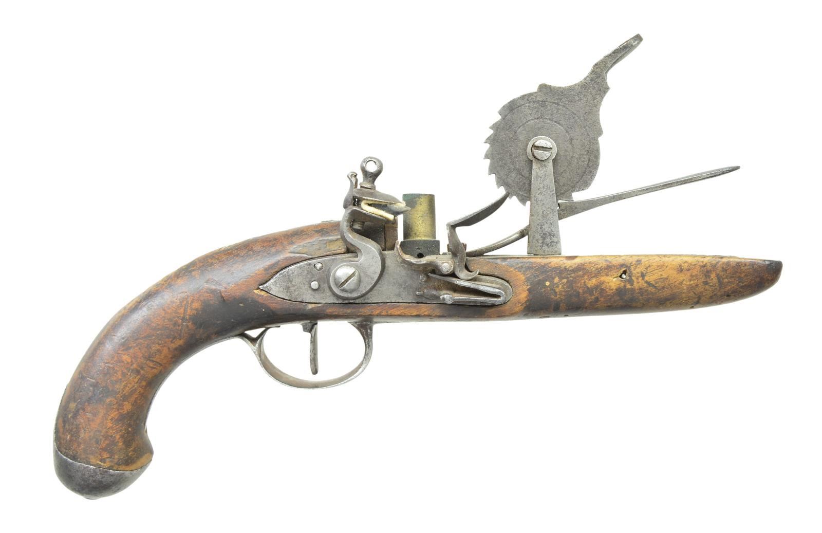 No bore diameter. NSN. No Bbl. No visible manufacturers marks on this possible? American mfg. tester that we believe is circa 18th century. Steel construction w/ brass “spout” or “vent” atop tester. Test wheel is marked “1 – 10”. Action doesn't hold at half or full “cock”. Plain smooth one piece stock w/ buttcap & sideplate. Well used example for testing the strength of gunpowder. CONDITION. metal shows light to moderate pitting & fine spots of rust throughout. Stock is heavily worn, dinged & dented. (01-23098/CW). ANTIQUE. $500-800.