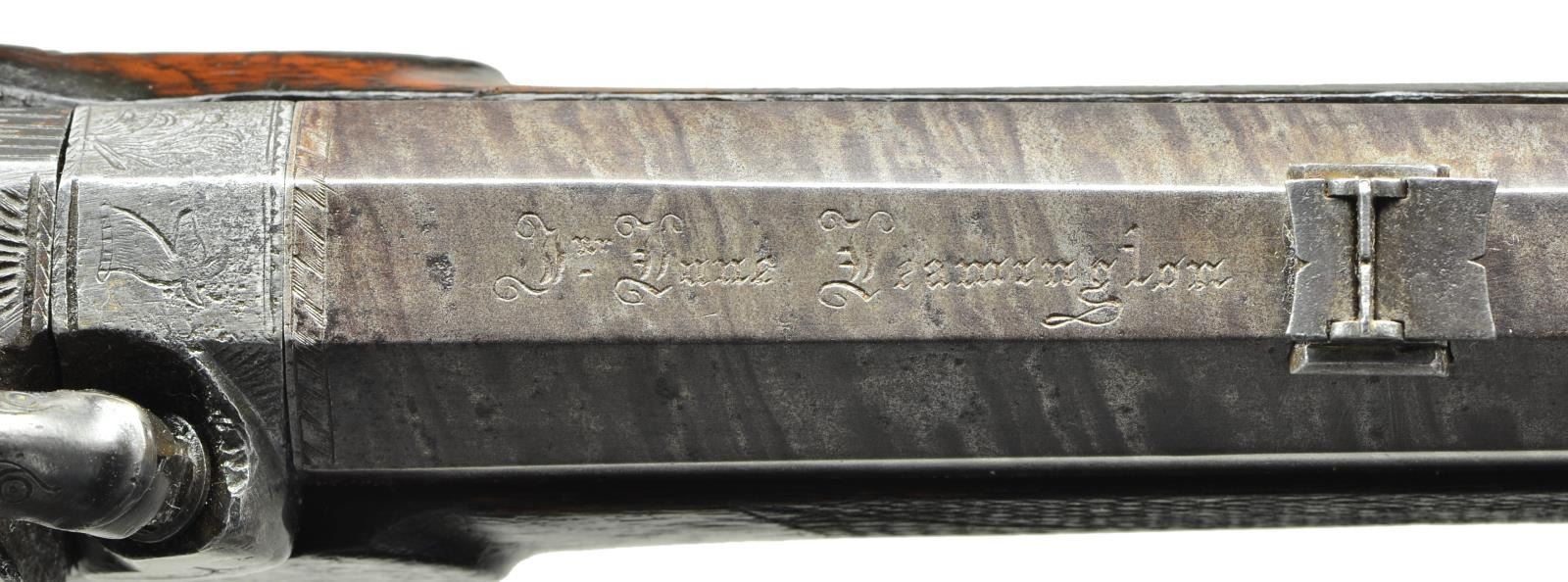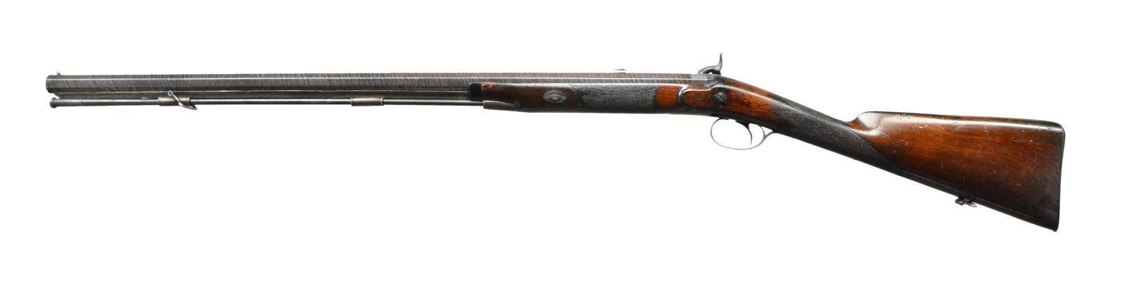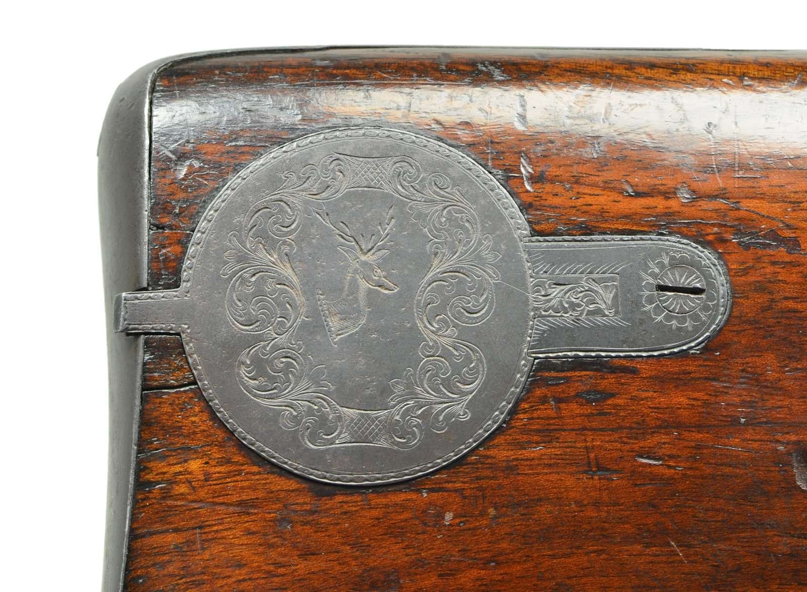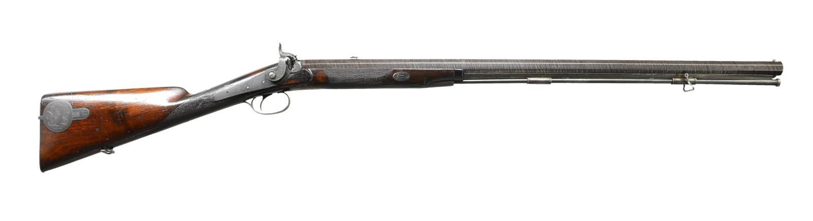 RIFLE. Cal. .577. NSN. Bbl. 29 1/2" double taper octagon of twist steel. Top flat has apparent Gothic style marking that may read “Drf Lune Leamington”? Bottom flat has Birmingham proof. Striking rifle w/ British & European features that may be of French Canadian mfg. Back action lock & hammer have vine type foliate scroll engraving & fancy borders. Complimenting engraving extends to long top tang & breech end of bbl. which features a deer’s head. Plain trigger. German silver blade front sight w/ rear sight having one standing & 2 folding leafs. Wedge fastened half length stock of American black walnut w/ ebony forearm tip. Right side has English style circular lid iron patchbox w/ engraved Stag’s head surrounded by foliate scroll engraving & chainlink borders. Iron shotgun butt has engraved long peak. Engraved long tang trigger guard has an English style finial. Forearm & wrist are hand checkered. Top of wrist has a German silver oval nameplate. Iron wedge escutcheons have border line engraving. Faceted iron thimble & 2 faceted twist steel pipes hold a button tipped iron ramrod to the twist steel under rib. Front sling swivel is under rib mounted w/ rear swivel mounted on stock toe line. CONDITION: very good. Bbl. retains lightly faded fine original brown finish showing attractive twist pattern. Iron lock & fittings have dark faded blue appearance retaining strong engraving. Stock has worn original finish showing dark wear spots w/ numerous scratches, marks & dents. Right side of stock has small cracks between patchbox & buttplate. An additional small crack extends from thimble point. Sound lock. Bore is unusually good for a rifle of this age having strong rifling w/ lightly frosted appearance & small spots of pitting. (01-22801/DS). ANTIQUE. $1,000-1,500.
