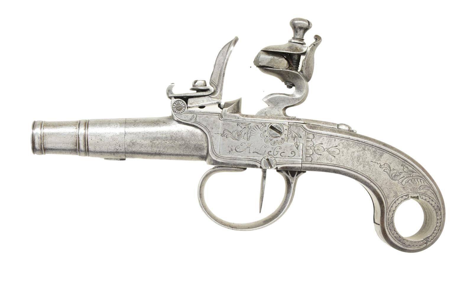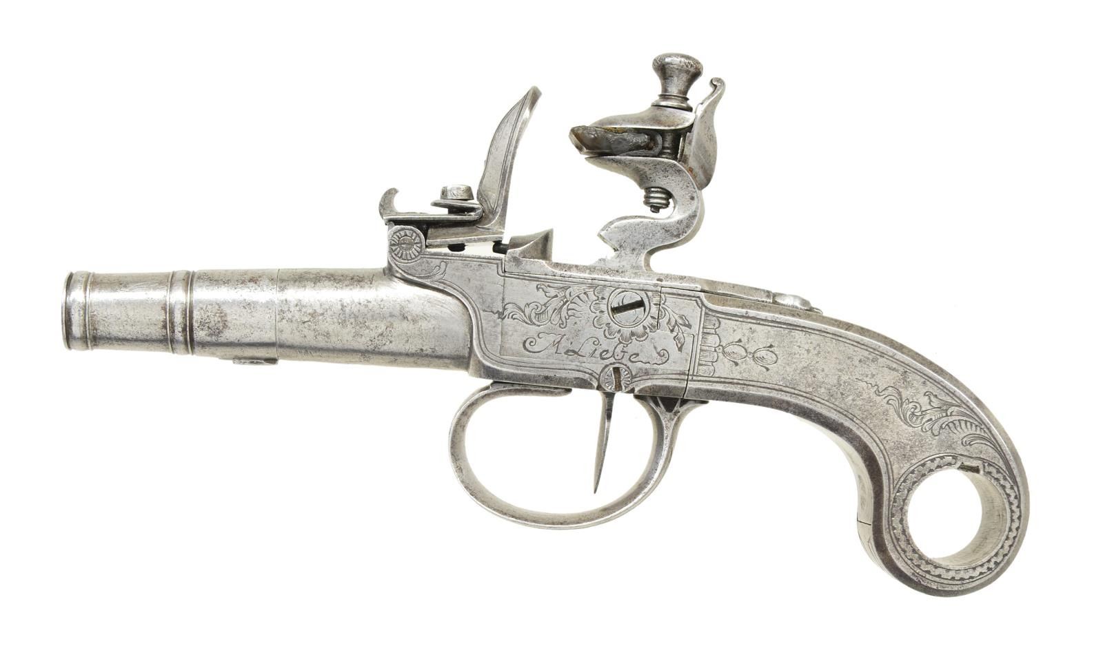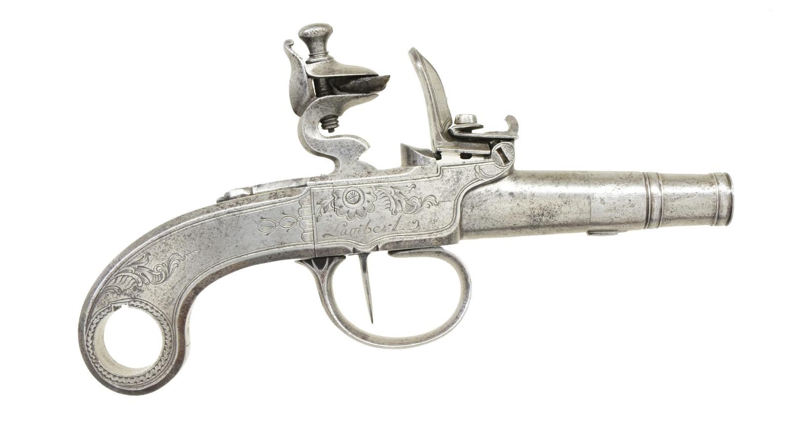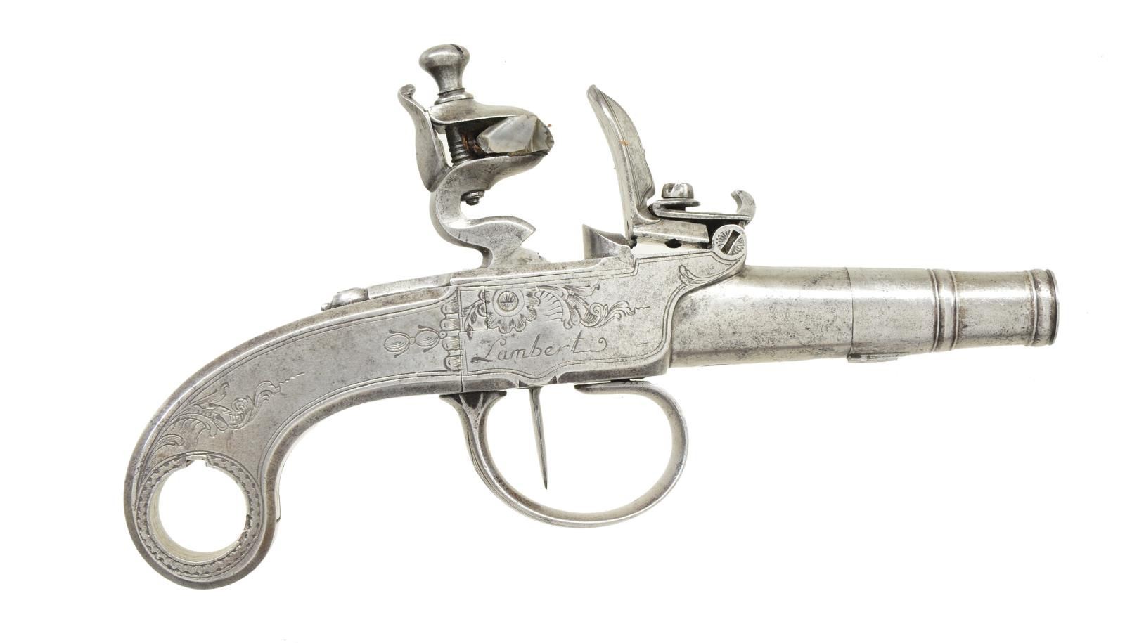 Cal. 40. NSN. 1 1/2" screw bbls. w/ cannonade muzzle & faceted transitions have rifled bores. Boxlock action w/ integral round butt grip. Holes in grips serve as bbl. wrenches. Actions have highlights of foliate scroll engraving. Right side is marked “Lambert”. Left side is marked “A Liege”. Sliding trigger guard safeties. Bottom forward of trigger guard is marked w/ British proofs. CONDITION: metal has cleaned gray appearance showing scattered light pitting. Locks are sound. Bores are good showing some very light pitting. (01-23097/DS). ANTIQUE. $1,000-2,000.