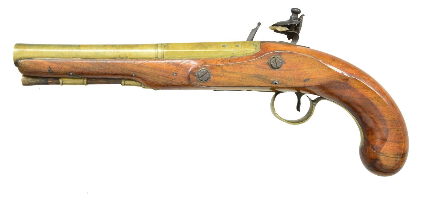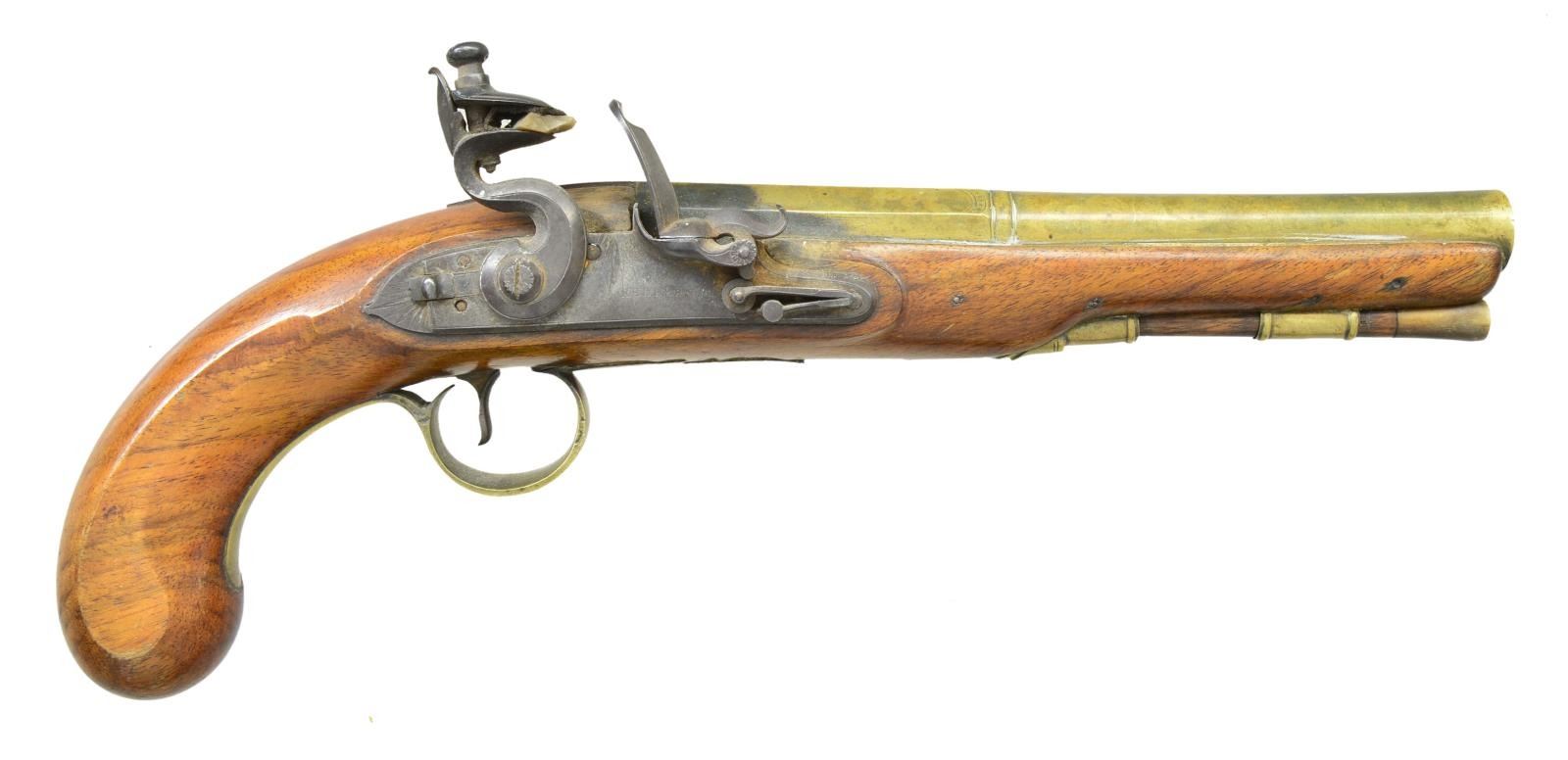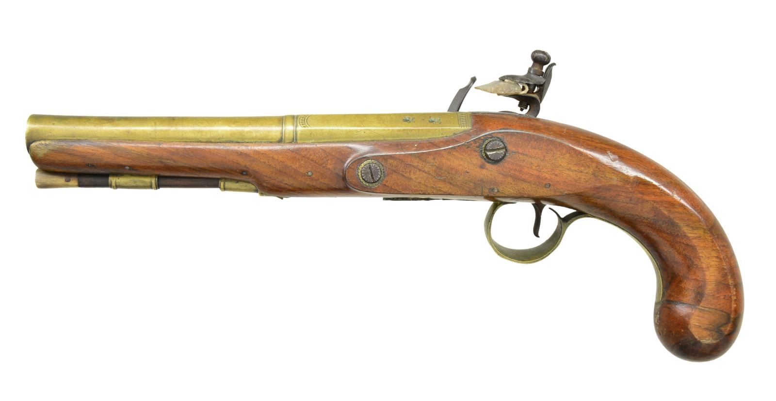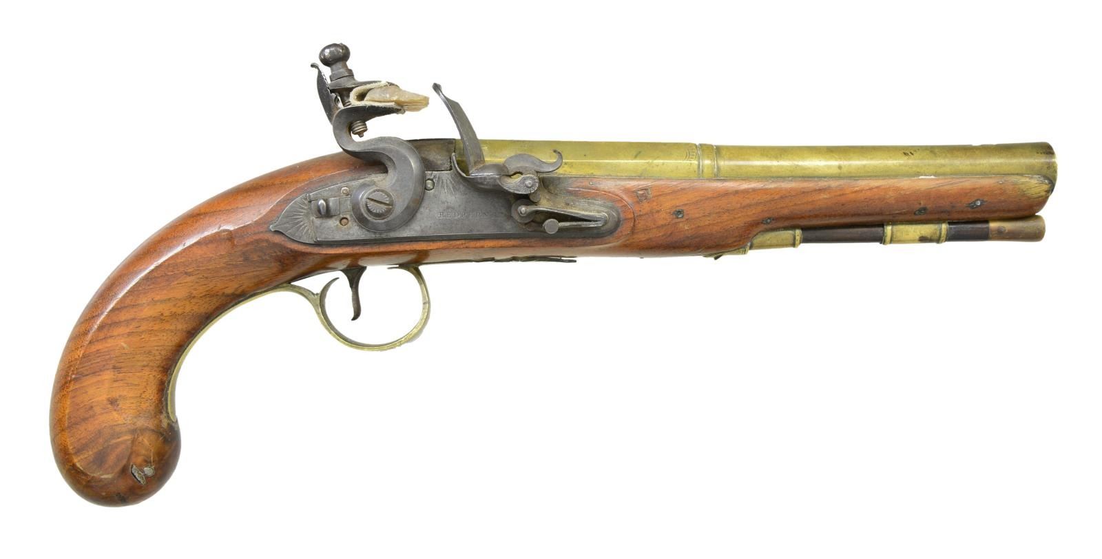 FLINTLOCK PISTOLS. Cal. 54. NSN. Bbl. 7 7/8" smoothbore of brass w/ octagon breech sections having a faceted transition to round front sections w/ slightly flared muzzles. Top flats are marked “London”. Left flats have British proofs. Lightly engraved lock plates have sliding safeties & are marked w/ builder’s name “REDFERN’S”. Pin fastened round butt walnut stocks. Brass fittings include pineapple finial trigger guards, faceted thimbles & single pipes. Horn tip hardwood ramrods. CONDITION: very good. Brass bbls. have acquired a spotted mild tarnish. One pistol has dark appearance in flash hole area. Locks are sound. Stocks show moderate wear w/ numerous scratches, marks & small dents. Dark bores. (01-23031/DS). ANTIQUE. $1,500-2,250.
