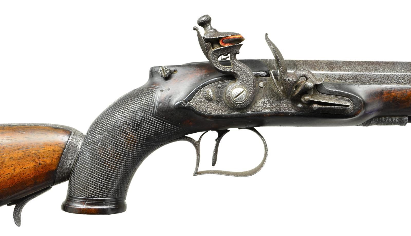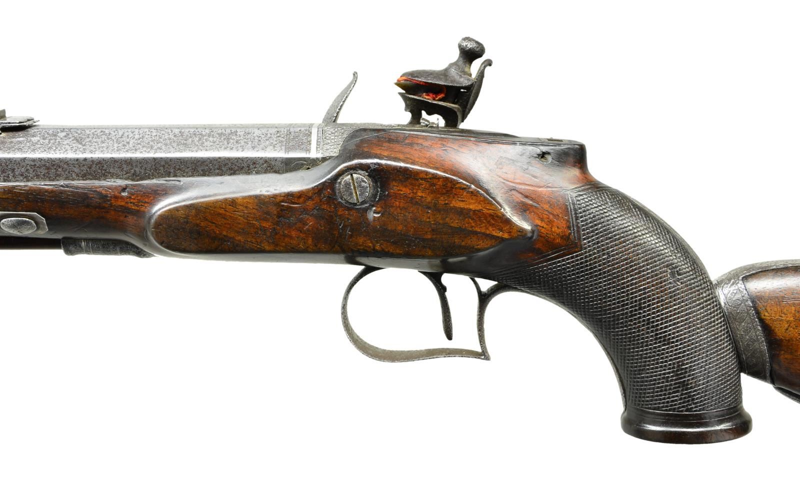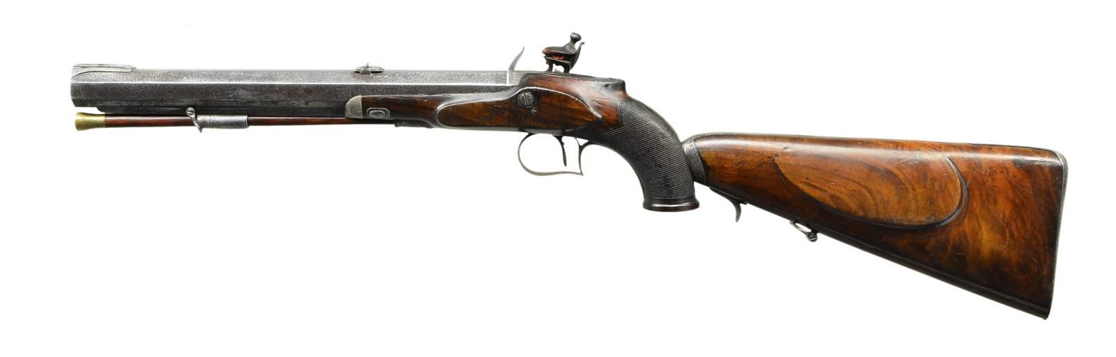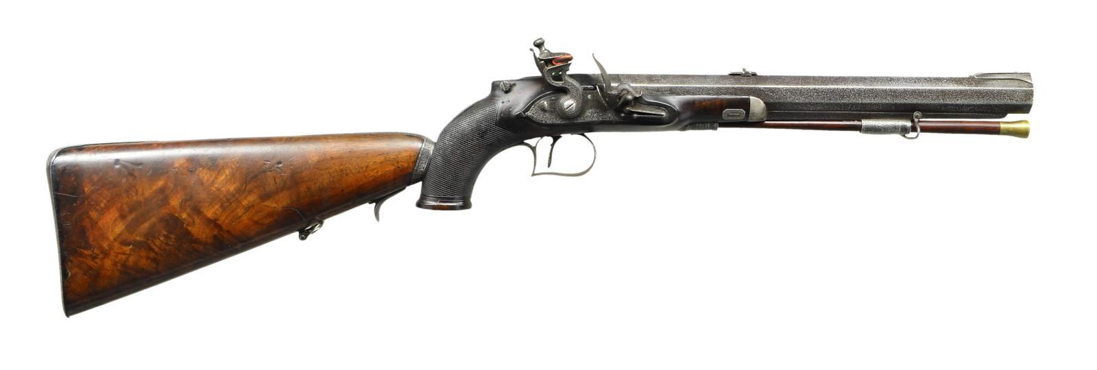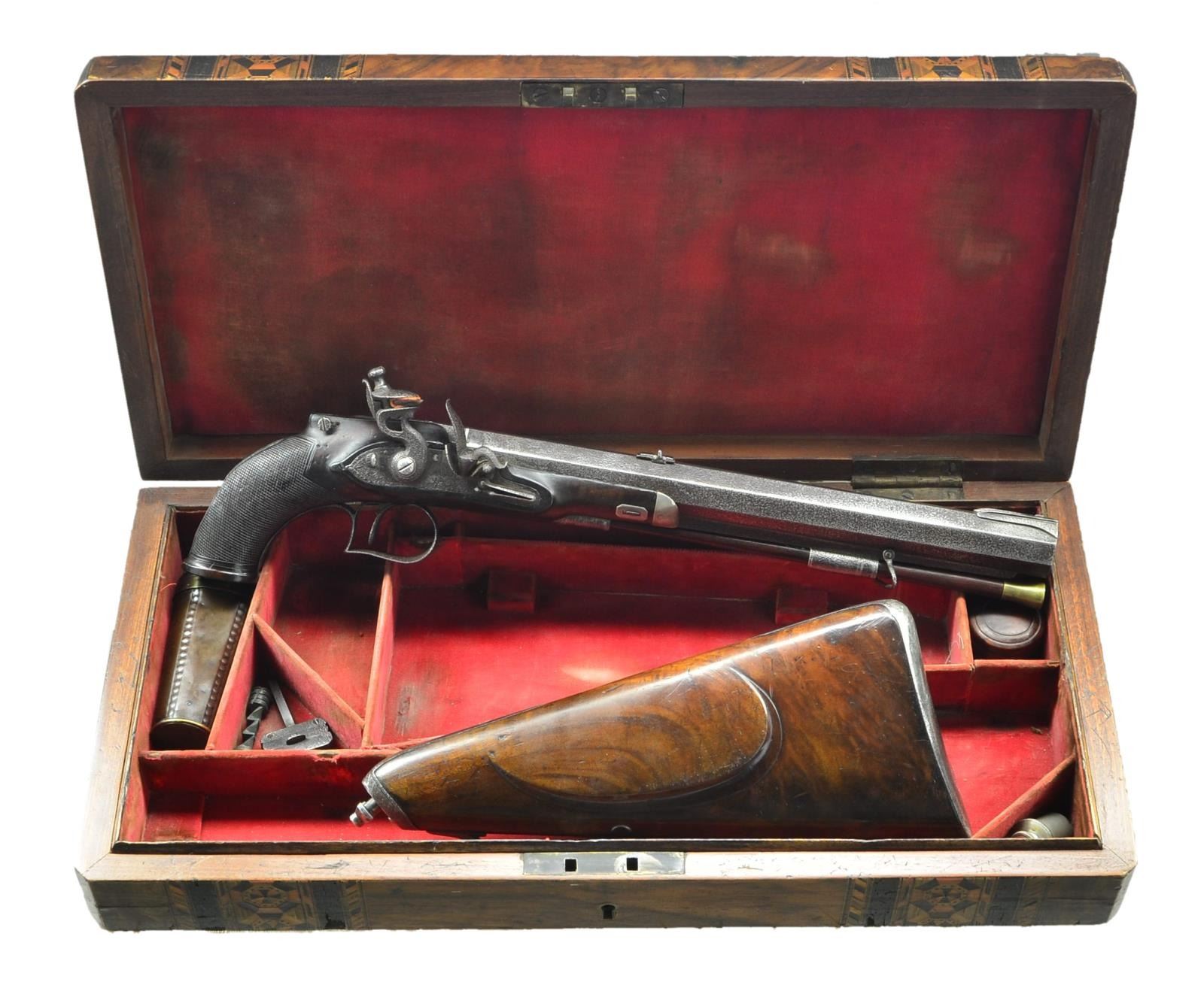 Cal. 62 multi groove rifling. NSN. This really cool pistol has unfortunately suffered the ravages of time and makers name is illegible both on barrel and lock. The 12" octagon rifled barrel with patent breech and platinum touch hole is fitted with four nested leaf rear sight and front bead on nicely filed ramp. Barrel is fitted with under rib with sling loop. Breech iron is also fitted with sights. Good quality flintlock with flat plate features back sliding safety, reinforced cock, waterproof pan, bridled frizzen and roller feather spring with spear finial. Trigger is set. Stock with small checkered flared grip has silver forend tip. Trigger plate has pineapple finial. Top of grip is raised and has mount for special windage and elevation adjustable lollipop type rear sight. Rear of grip has shaped slot to accept detachable buttstock with bayonet type mount and trigger latch. Stock is of crotch figured European walnut and has steel buttplate, shadow line right hand cheekpiece and sling loop. UNATTACHED ACCESSORIES: pistol is housed in an old walnut veneered case with two intricate marquetry bands across top and sides. Interior is lined in scarlet velvet. Pistol fits bottom compartment quite well. Accessories include copper bodied powder ball and patch flask, rosewood and brass loading rod, nutcracker ball mould, small pewter oil bottle and turned walnut flint bottle. CONDITION: fair. Iron parts show extreme pitting overall with cleaned silver highlights. Wood retains most of what appears to be original finish. Checkering considerably worn. Bore is good with strong rifling. Lock is operable. Safety inoperable. Trigger does set. Case is fair to good with old finish on exterior but missing many pieces of inlay. Interior cloth shows fading, stains and rubs, but not commensurate with the condition of this pistol. (01-23018/MGM). ANTIQUE. $1,200-2,000.
