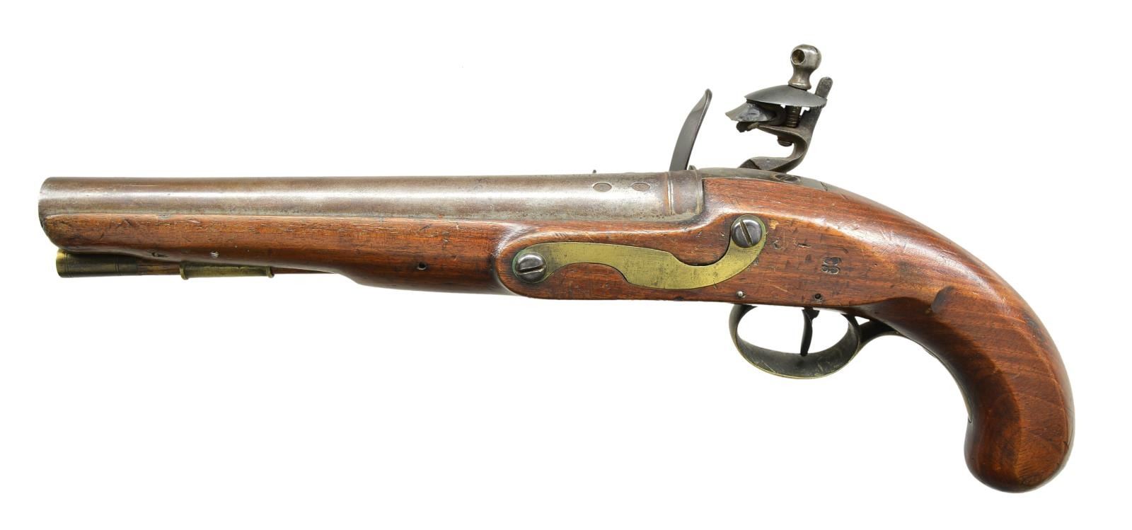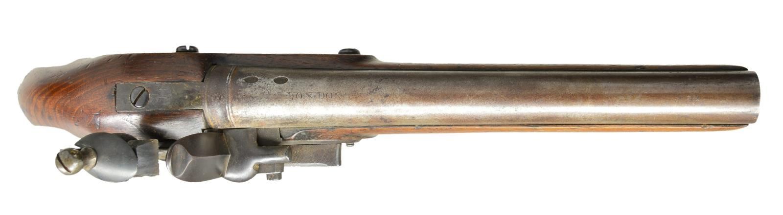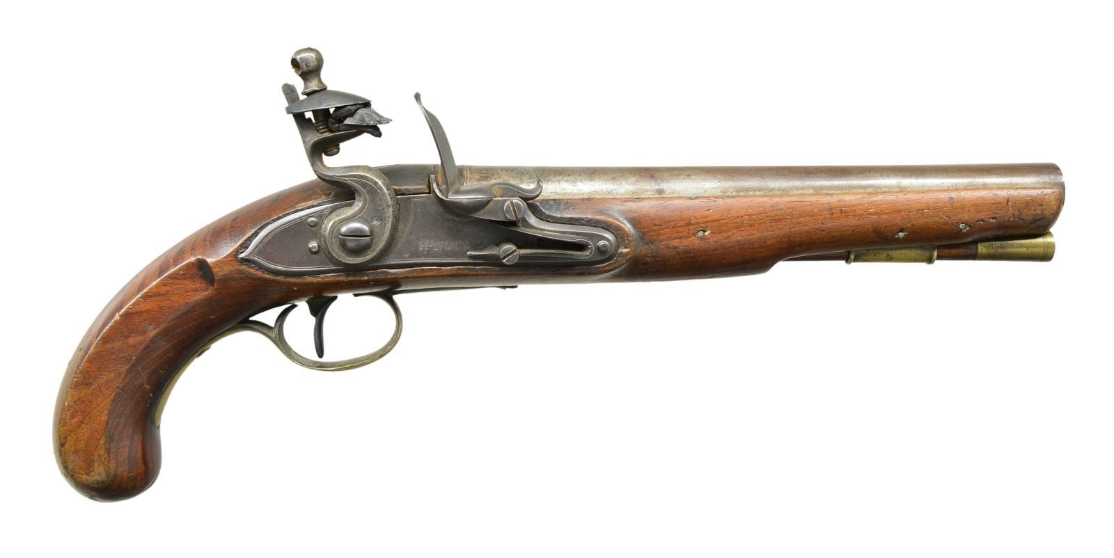 PISTOL. Cal. 65. NSN. Military flintlock style pistol with 9" tapered round barrel is engraved "LONDON" on top and has London black powder proofs at left rear. Lock with slightly arched beveled and pointed plate is fitted with serpentine cock, integral rounded pan, bridled friction frizzen and feather spring with dog nose finial. Lock is line border engraved; "H-NOCK" is at center. Stock with chamfered bag grip extends to muzzle and is pinned to barrel. What appears to be an inspectors mark "JS" (?) is on left side opposite lock. Trigger guard and sideplate are brass. Trigger guard with simple finial has rack # "263" engraved on bow. Hickory ramrod with brass tip is held by single beaded brass pipe and hole acting as thimble. CONDITION: very good. Iron parts show light cleaning and are mostly gray brown patina with some scattered minor pits. Brass is nicely toned. Stock retains most of what appears to be its original finish with many minor marks. Dark bore is lightly rusted. Lock is good. PROVENANCE: From the Lifelong Collection of Glen E. Mattox. (01-22578/MGM). ANTIQUE. $1,200-1,800.