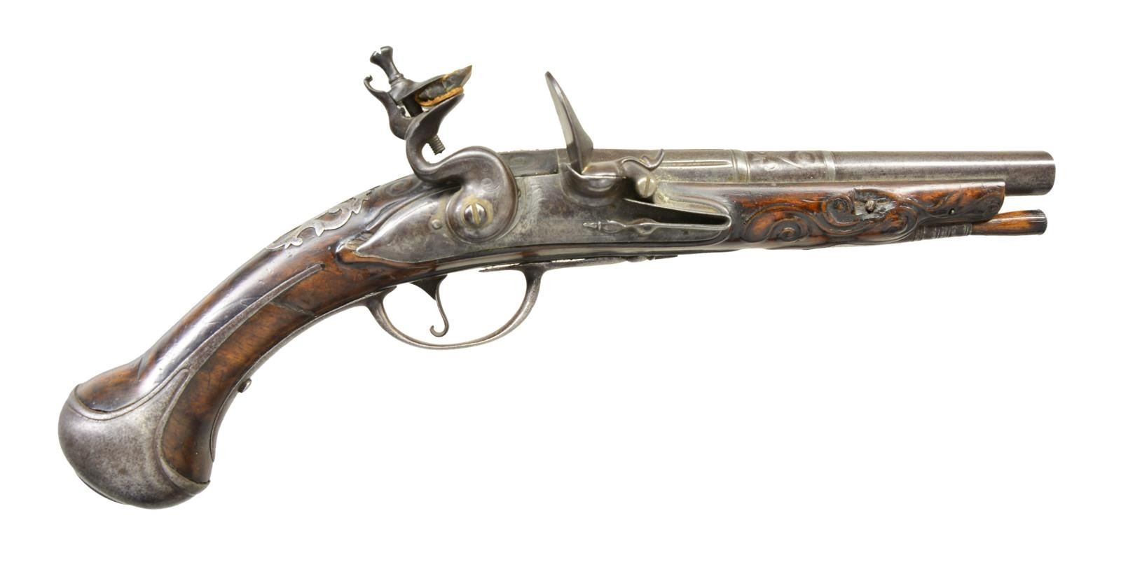 Cal. 56. NSN. Bbl. 7 9/16" w/ fluted octagon rear section & transitions to scroll sculpted mid section & round forward section. Smoothbore. Top of round section has added identification marking “DC 3604”. Lightly engraved lock is marked “PENTERMAN/UTRECHT”. Graceful pin fastened walnut stock w/ flared butt having vine type relief carving around top tang & in forearm areas. Ornate pierced vine type foliate side plate w/ pierced wrist plate having indistinguishable crest. Additional iron fittings consist of round butt cap, trigger guard & faceted thimble. Tapered hardwood ramrod. CONDITION: metal has a gray worn appearance showing very light pitting. Stock shows wear w/ aged darkened appearance having numerous handling marks. The forearm shows chips on both sides. Stock is cracked between trigger guard tang & butt cap extensions. Functioning lock. Lightly pitted bore. (01-23100/DS). ANTIQUE. $1,200-1,800.