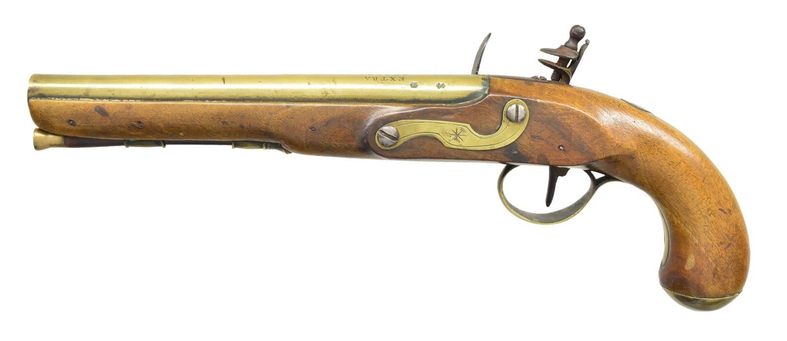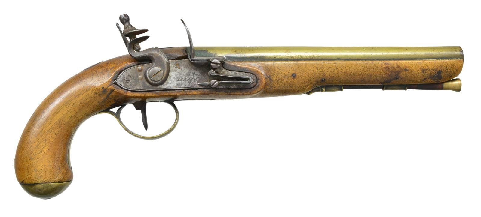 SHARPE. Cal. 55. NSN. The 9" tapered brass barrel is marked "EXTRA" "SHARPE" "PROOF" on top. Birmingham proofs are at left. Trade type lock with flat plate is fitted with serpentine cock, integral rounded pan, unbridled frizzen and roller feather spring with spear finial. "SHARPE" is marked at center (most likely John working in Birmingham 1811-17). Elmwood stock with brass capped knob grip is fitted with serpentine sideplate, simple brass trigger guard and a vacant pewter oval at top of grip. Simple starburst engraving is at center of trigger guard bow and sideplate. Stock extends to muzzle and is pinned to barrel. Rosewood ramrod with brass tip and steel worm tail mounts through single beaded brass pipe and matching thimble. CONDITION: good. Brass showing old cleaning has toned to golden brown. Lock shows cleaning to silver highlights. Stock show many light marks in old possibly original finish. Bore is dark but smooth. Lock is good. PROVENANCE: From the Lifelong Collection of Glen E. Mattox. (01-22580/MGM). ANTIQUE. $1,200-1,500.