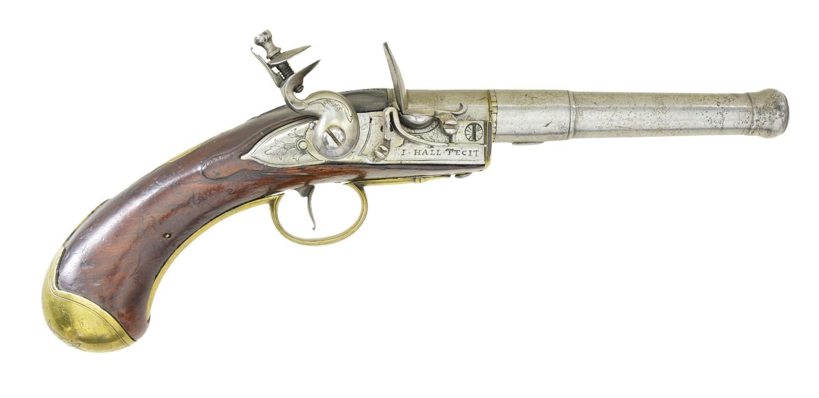 Cal. 54. NSN. 4 7/8" screw bbl. w/ cannonade muzzle & faceted transition. Left side has a London definitive black powder proof over a “JH” mfg. mark followed by London view mark. Right side of lock below frizzen spring is marked “I. HALL TECIT”. Lock & top tang are lightly engraved. Flared butt walnut stock w/ relief carving around top tang & tear drop points. Brass fittings include trigger guard, butt cap, nameplate on wrist, decorative side plate & engraved plate at front of half length stock. CONDITION: cleaned gray metal. Brass is bright from cleaning. Lock has light spring tension. Dark lightly pitted bore. (01-23103/DS). ANTIQUE. $1,000-1,500.