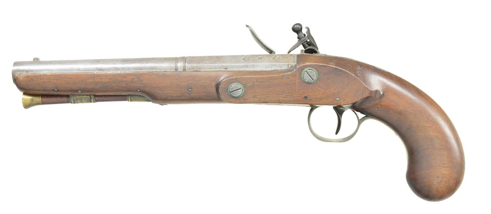Cal. 58. NSN. Bbl. 8 1/2" w/ faceted transition to octagon shank. Smoothbore. Semicircular front sight w/ fixed U notch rear sight. Top flat is marked “London”. Left flat has proof marks including Birmingham definitive black powder proof. Engraved lock w/ sliding safety marked “Sharpe”. Plain trigger. Pin fastened round butt walnut stock w/ German silver wrist plate. Engraved brass pineapple finial trigger guard. Brass thimble & single faceted pipe. Horn tipped hardwood ramrod. CONDITION: metal has gray faded appearance. Sound lock. Stock has lightly worn finish showing scattered marks. Lightly pitted bore. (01-23075/DS). ANTIQUE. $800-1,200.