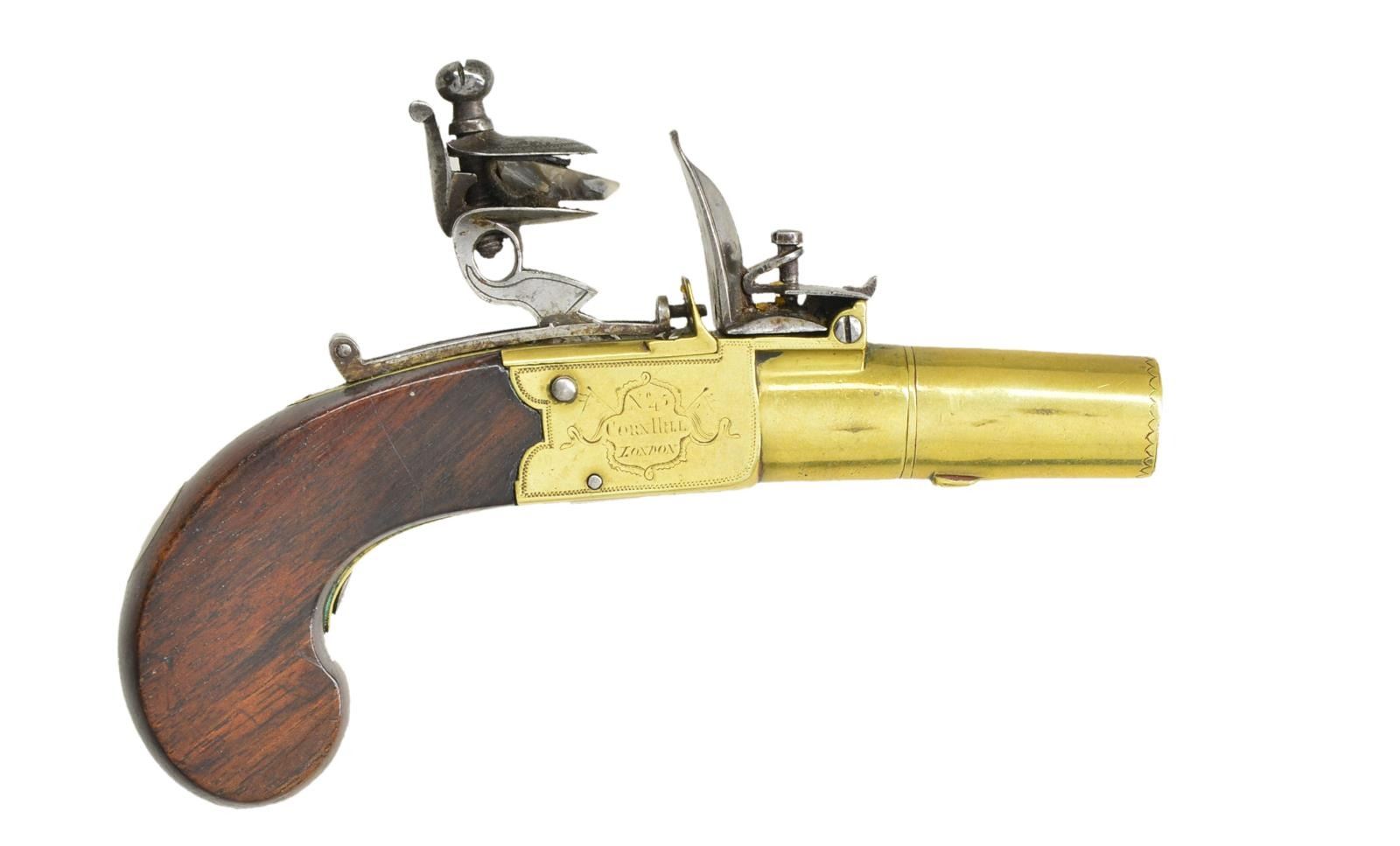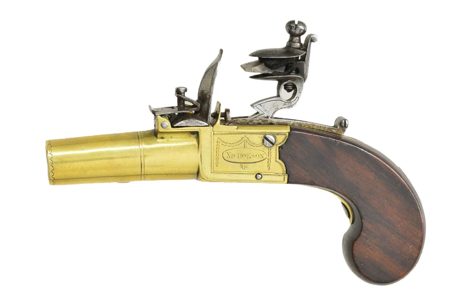BOXLOCK POCKET PISTOLS WITH FOLDING TRIGGERS BY WILLIAM NICHOLSON. Cal. 53. NSN. The 1 3/8" round smooth bore bbls. have London proofs. Boxlock frames which are also brass, are stamped with London proofs on bottom. Steel cock has small reinforce and can be secured in half cocked position by a sliding safety at rear which also locks frizzen in closed position (when brought to full cock), the folding triggers are exposed. Actions are engraved with geometric borders surrounding "Nicholson" in oval on left sides and his Cornhill London address (1786-94) in flag flanked device on rights. Walnut flat sided bag grips have silver escutcheons at rears engraved "JH?". CONDITION: good. Brass with considerable cleaning has now turned gold. Steel parts are silver to gray patina. Stocks have most of an old oil finish. Mechanically good. One pistol has small chip missing on bottom of left side grip behind action. PROVENANCE: From the Collection of James B. Taylor. (01-20567/MGM). ANTIQUE. $800-1,200.