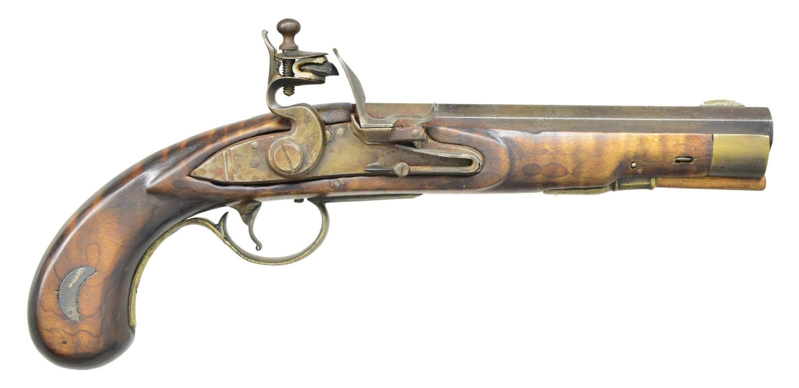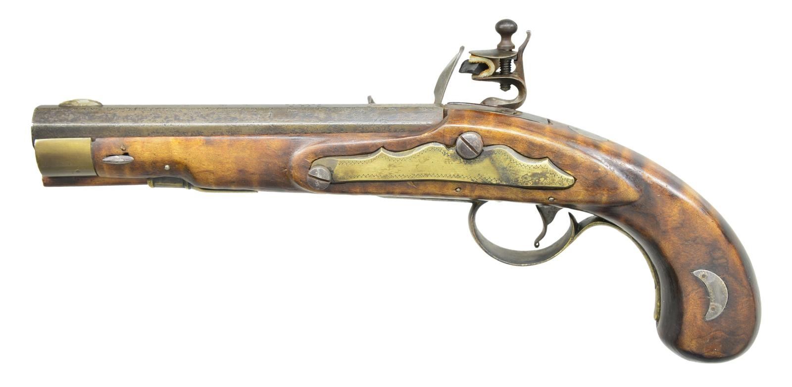 45 Cal. smooth full octagon 6 1/2" bbl. stamped "G.Bast PA.". Over all the pistol is 12" long, Hand forged flintlock & curly maple stock. This pistol was restocked using all original parts by G. Bass. Pistol has heavy beveled brass side plate. Pistol grip is decorated w/ 2 sliver half moon inlays. CONDITION: this pistol was made using a fine original hand forged flint lock, old original side plate & all original furniture.