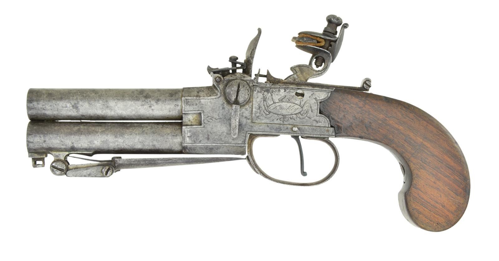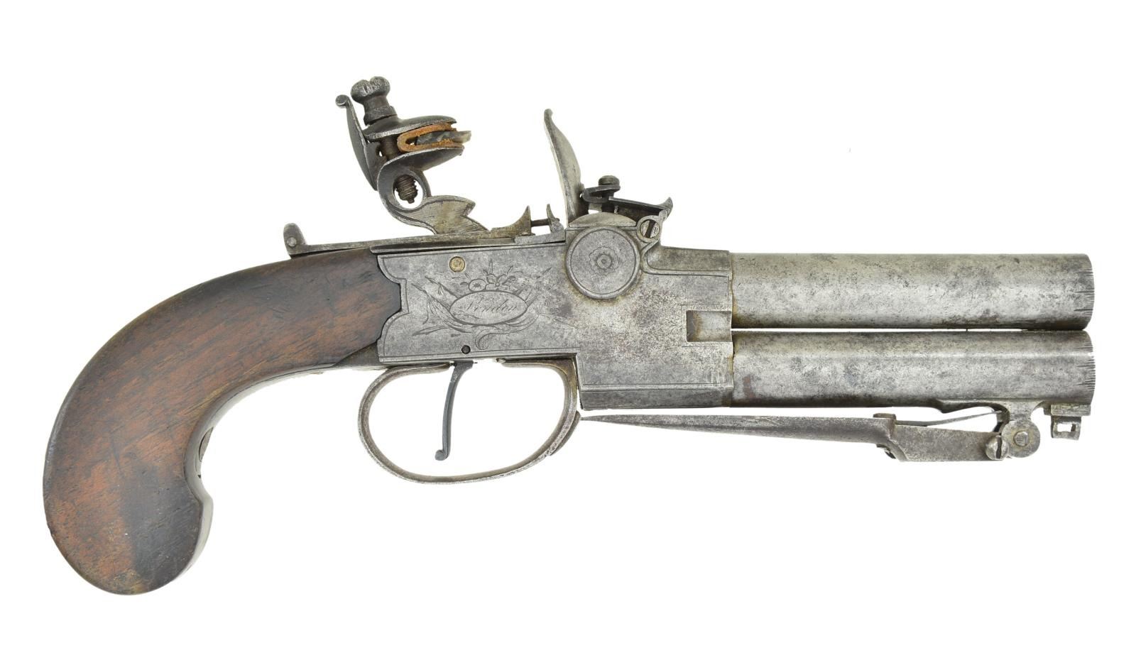 PISTOL. Cal. .45. NSN. Superposed 3" barrels numbered "1" & "2"; respectively numbered on left side frame. Spring loaded 3" bayonet retained by latch on triggerguard; triggerguard slides rearward to release bayonet tip. Boxlock center hammer action w/ toggle on left side corresponding to bottom barrel touch hole. Patriotic motifs on both sides of action marked "Knubley" on let side & "London" on right side. Top tang has sliding safety latch. Bag type walnut grip. CONDITION: metal has gray/brown patina appearance w/ light pitting & marks throughout; deeper pitting around left side pan. Grips have good varnish with deep impressions, scratches, gouges & sm. chip missing right side by triggerguard. Fair bores w/ light pitting. (01-23088/MD). ANTIQUE. $500-800.
