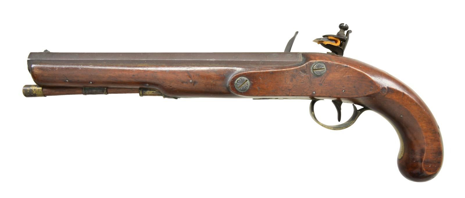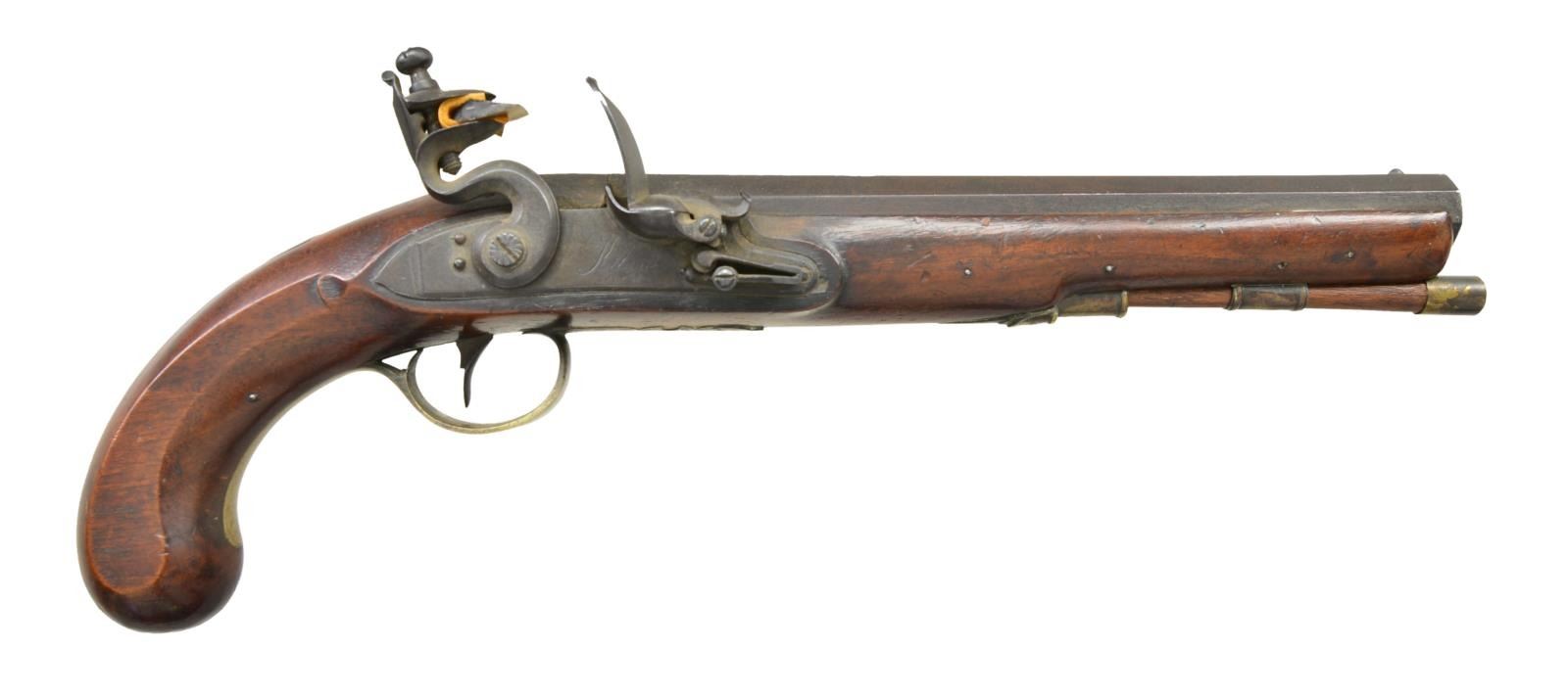 Cal. 58. NSN. Bbl. 9" oct. smoothbore, engraved "London" & stamped w/ crown V & P proofs. Screws have light engraving. Pinned walnut stock. Brass pineapple finial triggerguard w/ rolled edges; other brass furniture includes shield wrist plate, thimble, 2 pipes & ramrod tip. Left ear of stock has stamped "GF". CONDITION: bbl. & lock have brown patina appearance w/ brazed on blade front sight, one large dent on top flat. Intact stock has good varnish w/ numerous light impressions & scratches having a few that pierce finish along w/ a few sm. cracks & chips. Brass has pleasing patina w/ ramrod tip loose. Screws showing light scratches & distortion. Bbl. screw has improper fit to tang & ramrod has improper fit to channel. Lock appears to function when cycled by hand Fair lightly pitted bore. (01-21753/MD). ANTIQUE. $500-800.