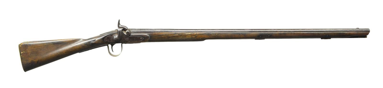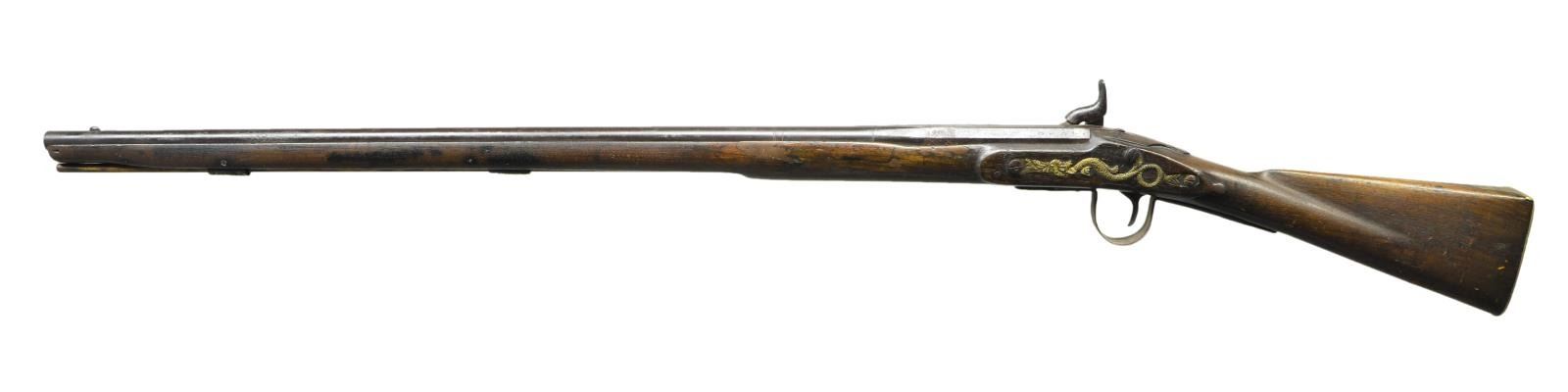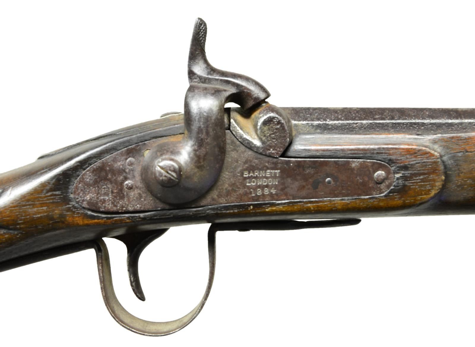 BARNETT. Cal. 56. NSN. The 36" octagon to round barrel has London proofs on top left flat at rear. Percussion lock with flat plate is stamped "BARNETT" "LONDON" "1884" at center. Tombstone fox stamp is on tail. Walnut stock extends to muzzle. Brass buttplate is held by five screws. Oversized trigger and trigger guard are steel. A classic brass sea monster sideplate is affixed by two large screws and one smaller to rear. Lockplate, sideplate and barrel tang are accented by carved moldings. Hickory ramrod mounts through two multi beaded brass pipes and simple hole in stock as thimble. CONDITION: fair to good. Barrel lock and trigger guard exhibit dark brown patina with considerable pitting. Stock shows old refinish with many repairs in front of lock with replaced wood and bondo infill. Bore is dark and pitted. Lock is operable. PROVENANCE: From the Lifelong Collection of Glen E. Mattox. (01-22556/MGM). ANTIQUE. $1,000-2,000.