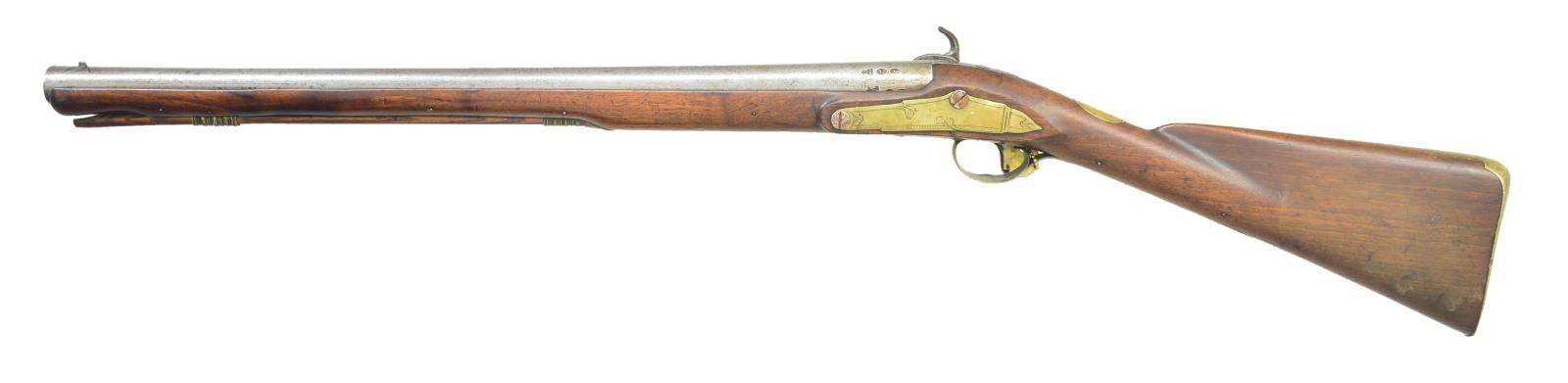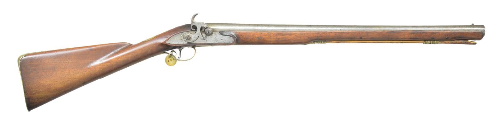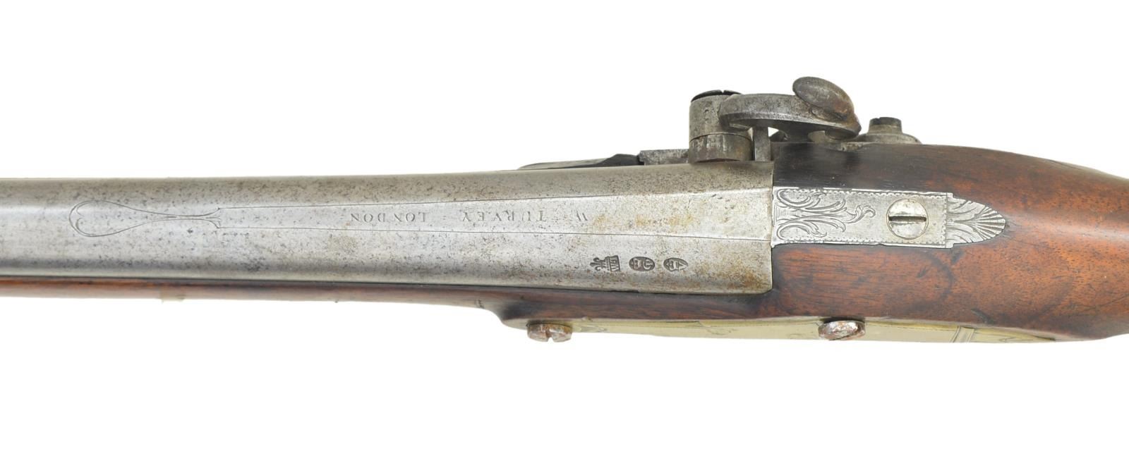 CARBINE. Cal. about 65. NSN. Bbl. 22 3/4” round w/ flared muzzle having 15/16” inside diameter. Top flat is marked “W. Turvey. London”. Left side has British proof marks including London black powder proof & view mark. Engraved top tang. Unmarked iron lock w/ bird-like hammer. Pill-lock bolster has rotating tumbler for loading. Pin fastened full length walnut stock. Engraved brass fittings include buttplate, wrist plate, trigger guard & side plate. Faceted brass thimble & single faceted pipe holding ramrod. CONDITION: metal has cleaned gray appearance showing general very light pitting. Stock shows scratches & marks. Sound lock. Dark pitted bore. (01-23105/DS). ANTIQUE. $1,200-1,800.