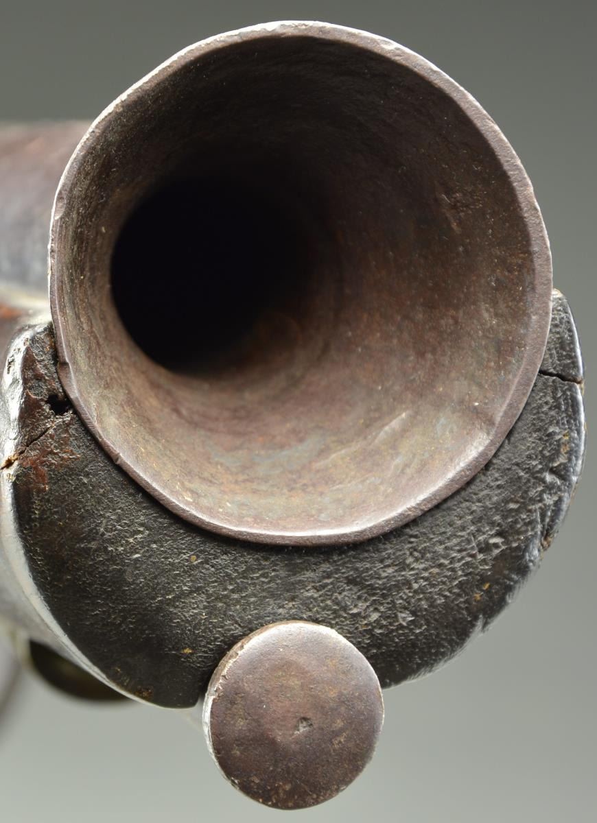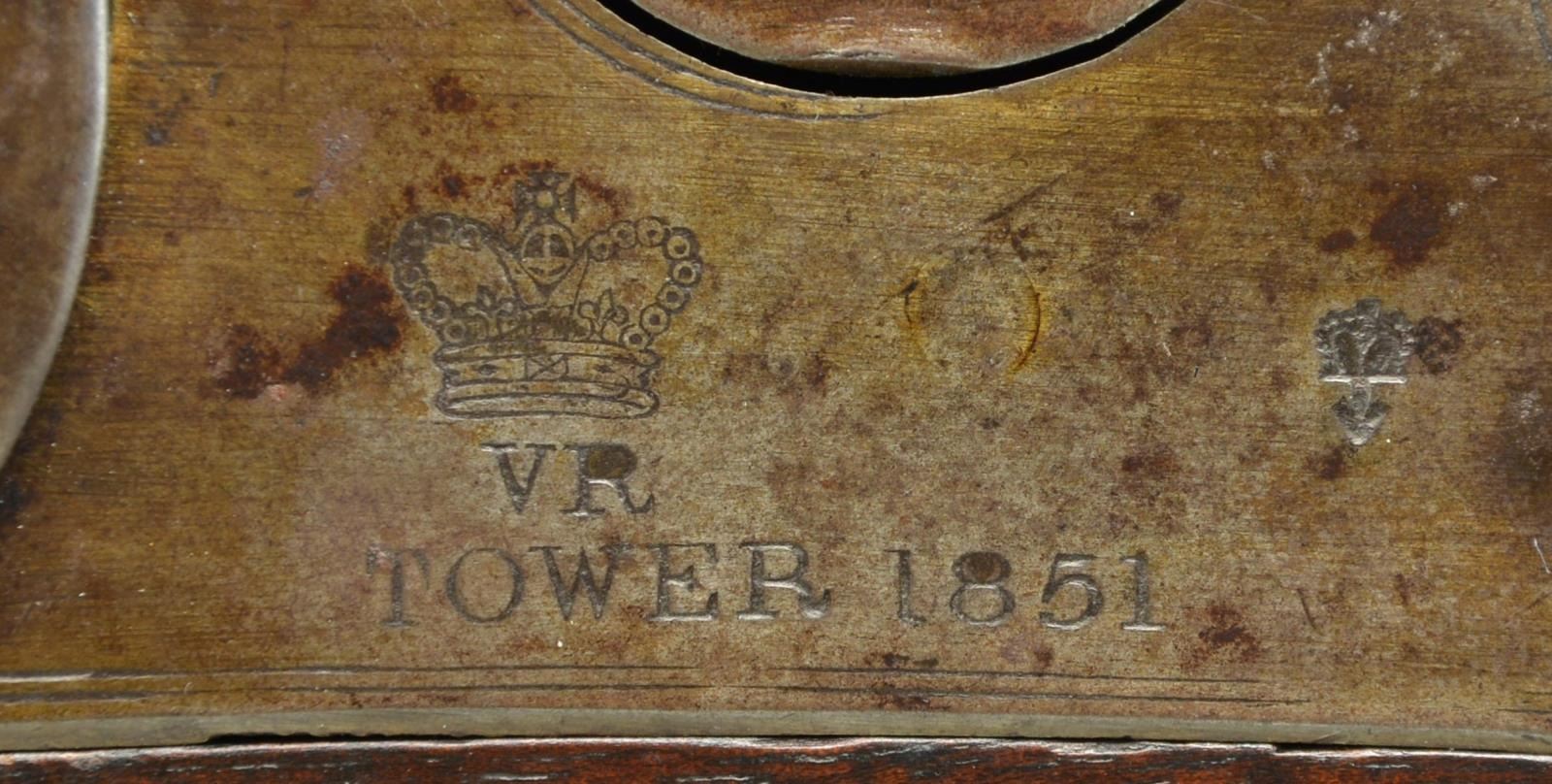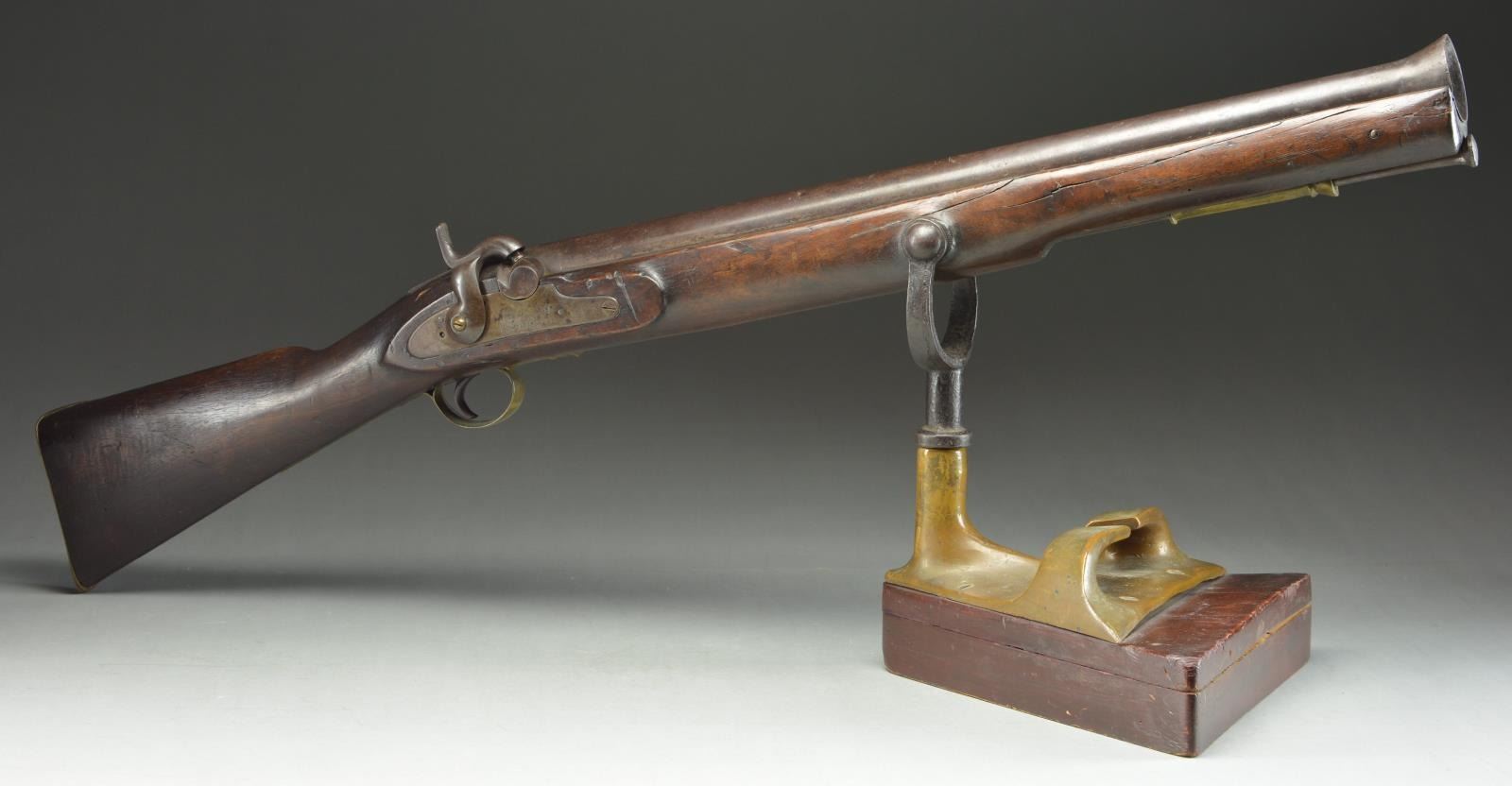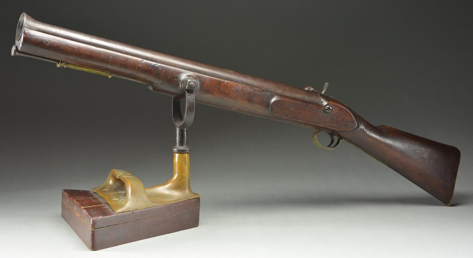 LOCK & BLUNDERBUSS BARREL RETAILED BY BARNETT OF LONDON WITH STAND. Cal. .90 2" at muzzle. NSN. The 26" tapered round barrel with flared muzzle measures over 2" at breech end which is stamped with London black powder proofs. Large percussion bolster is on right side. Lock with chamfered plate is fitted with large percussion hammer. Lock plate is stamped with a royal crown over "VR" "TOWER 1851" and with British broad arrow. Walnut stock extends to muzzle, is pinned to barrel and is fitted with swivel yoke resembling an oarlock. Mounts are brass. An oval stamp on right side of butt is marked "BARNETT" "GUNMAKERS" "LONDON". Heavy steel ramrod is held by large brass beaded pipe and hole in stock without metal thimble. Gun is accompanied by cast bronze mount screwed to triangular wooden base. CONDITION: good. Metal parts contain nearly all smooth brown patina. Wood is good with old finish, markings clear. Bore is rusted. Lock is good. PROVENANCE: From the Lifelong Collection of Glen E. Mattox. (01-22574/MGM). ANITQUE. $3,000-4000.
