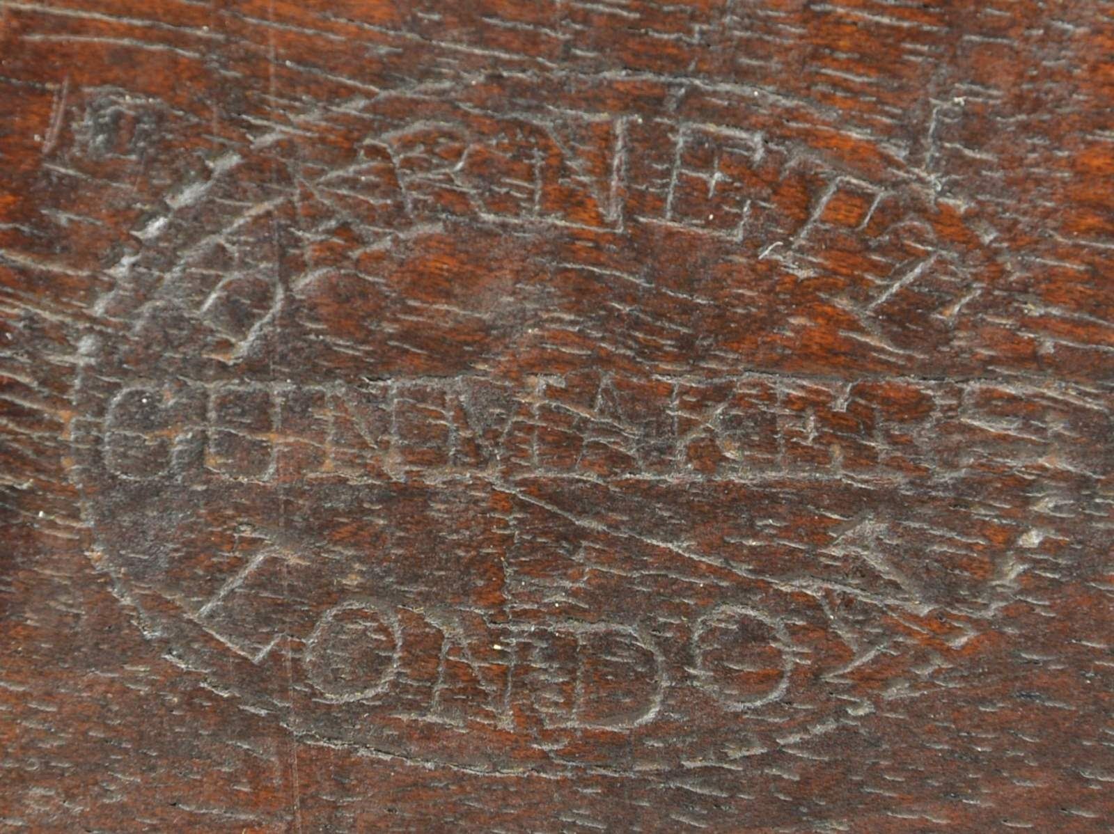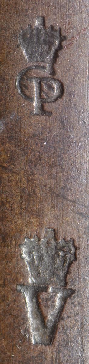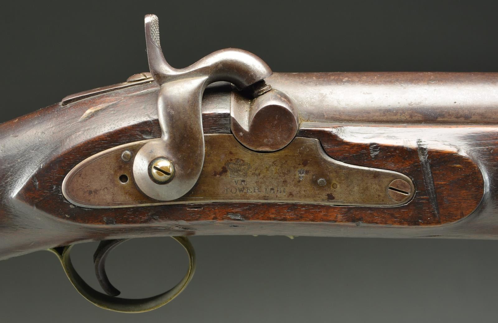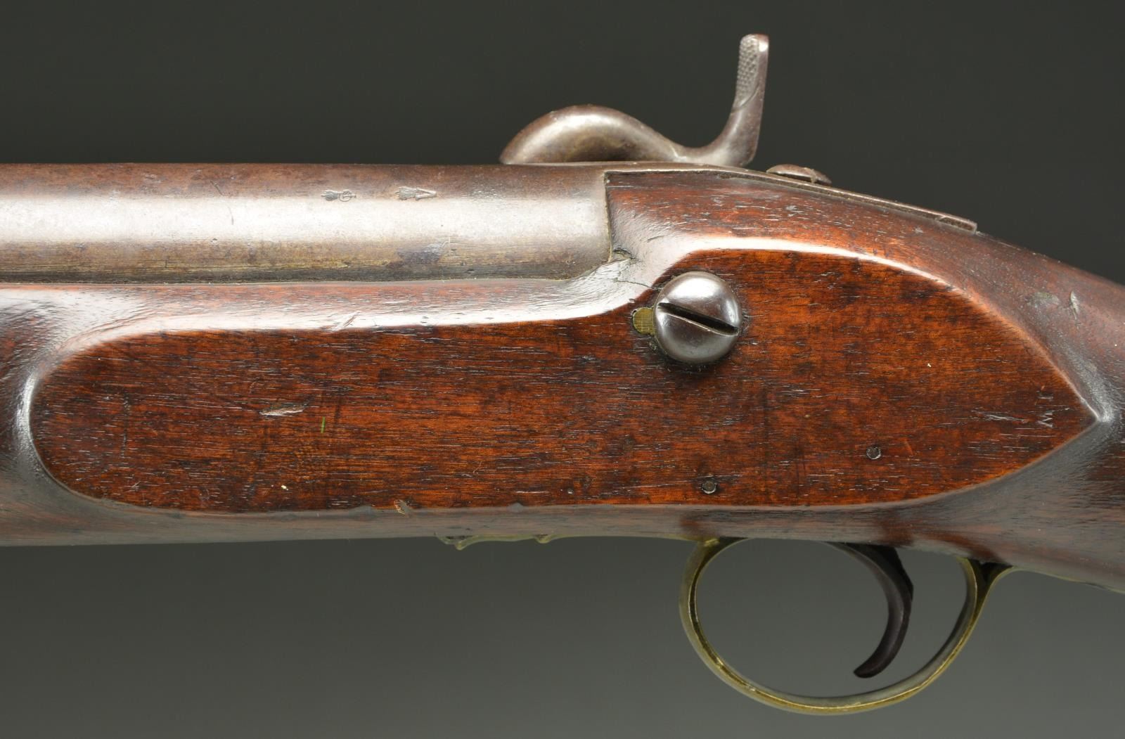 LOCK & BLUNDERBUSS BARREL RETAILED BY BARNETT OF LONDON WITH STAND. Cal. .90 2" at muzzle. NSN. The 26" tapered round barrel with flared muzzle measures over 2" at breech end which is stamped with London black powder proofs. Large percussion bolster is on right side. Lock with chamfered plate is fitted with large percussion hammer. Lock plate is stamped with a royal crown over "VR" "TOWER 1851" and with British broad arrow. Walnut stock extends to muzzle, is pinned to barrel and is fitted with swivel yoke resembling an oarlock. Mounts are brass. An oval stamp on right side of butt is marked "BARNETT" "GUNMAKERS" "LONDON". Heavy steel ramrod is held by large brass beaded pipe and hole in stock without metal thimble. Gun is accompanied by cast bronze mount screwed to triangular wooden base. CONDITION: good. Metal parts contain nearly all smooth brown patina. Wood is good with old finish, markings clear. Bore is rusted. Lock is good. PROVENANCE: From the Lifelong Collection of Glen E. Mattox. (01-22574/MGM). ANITQUE. $3,000-4000.