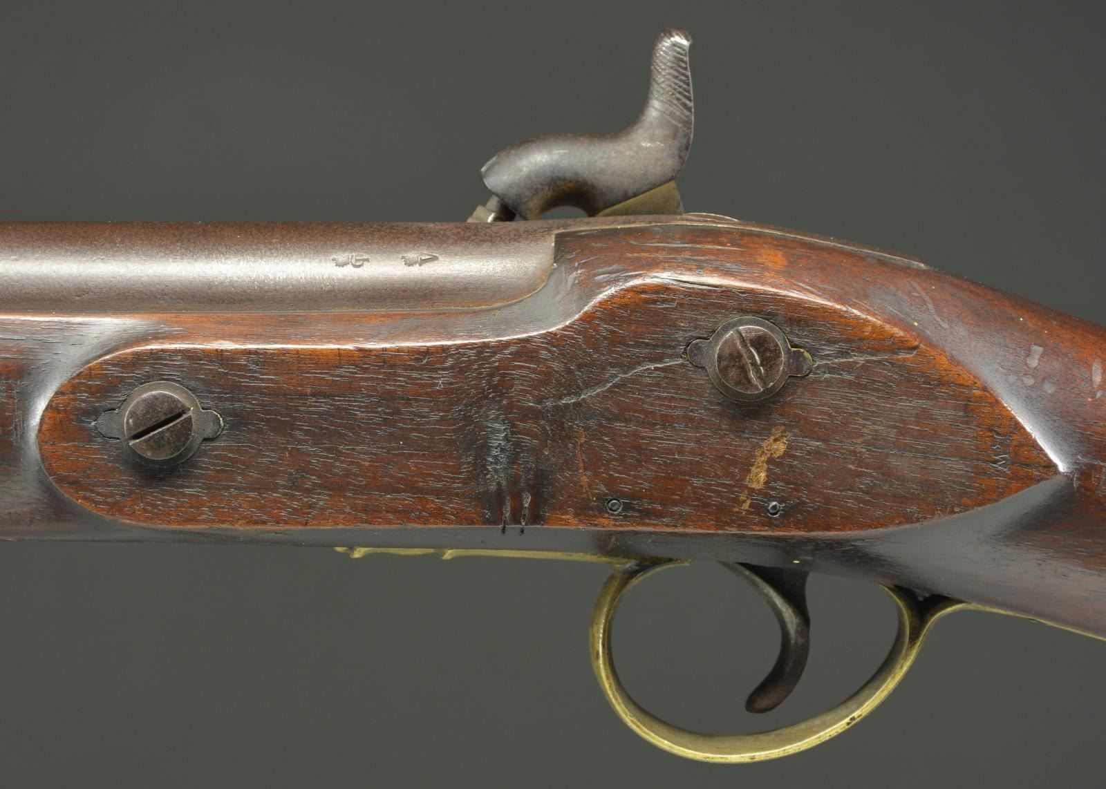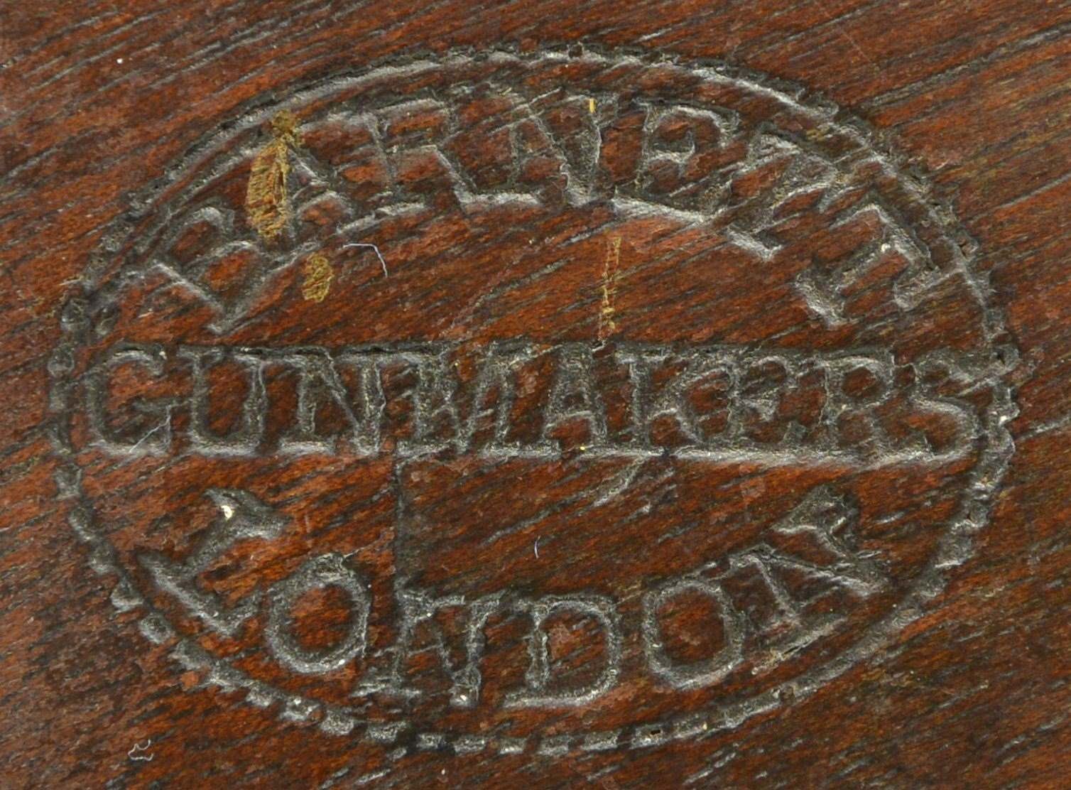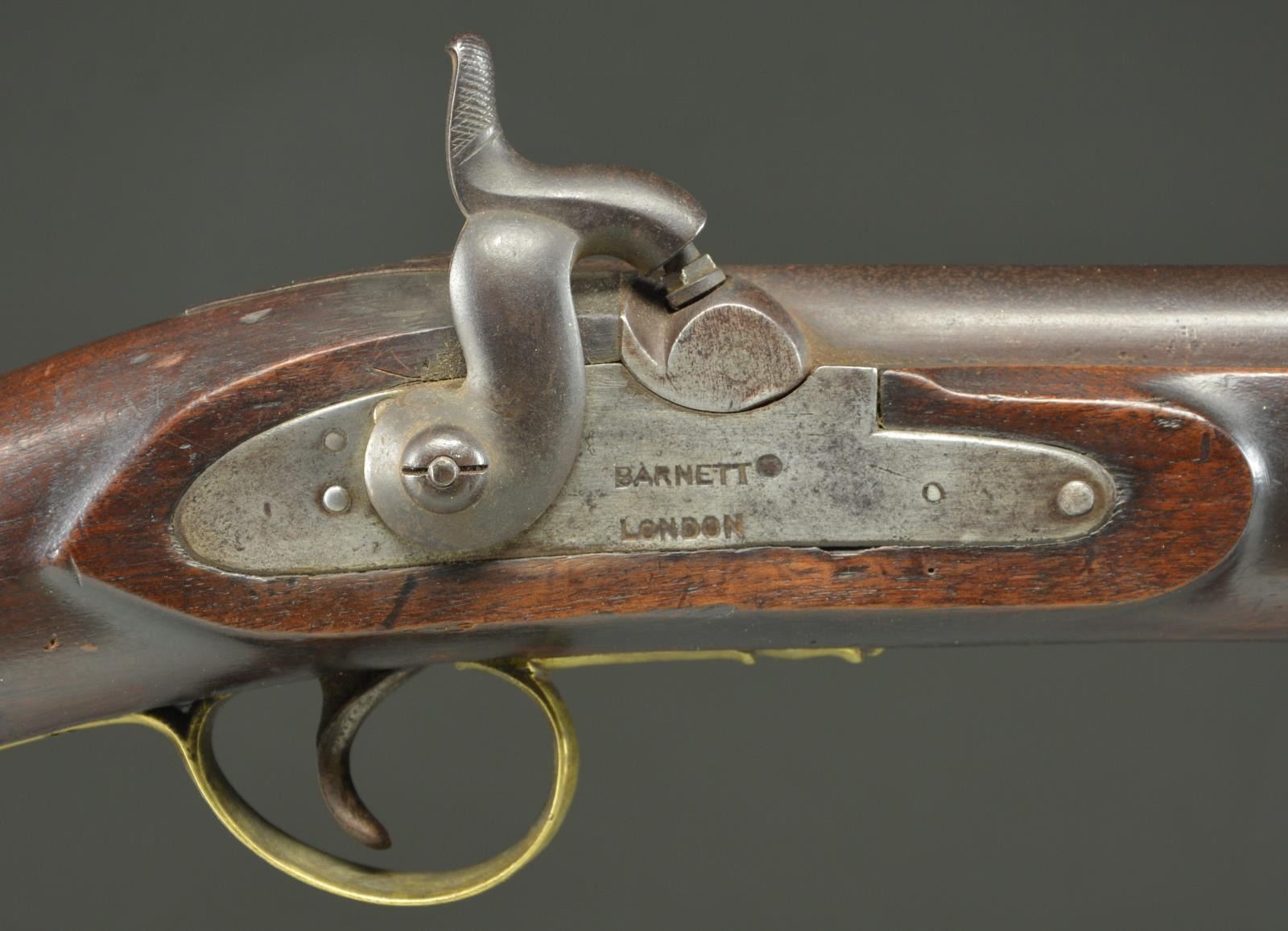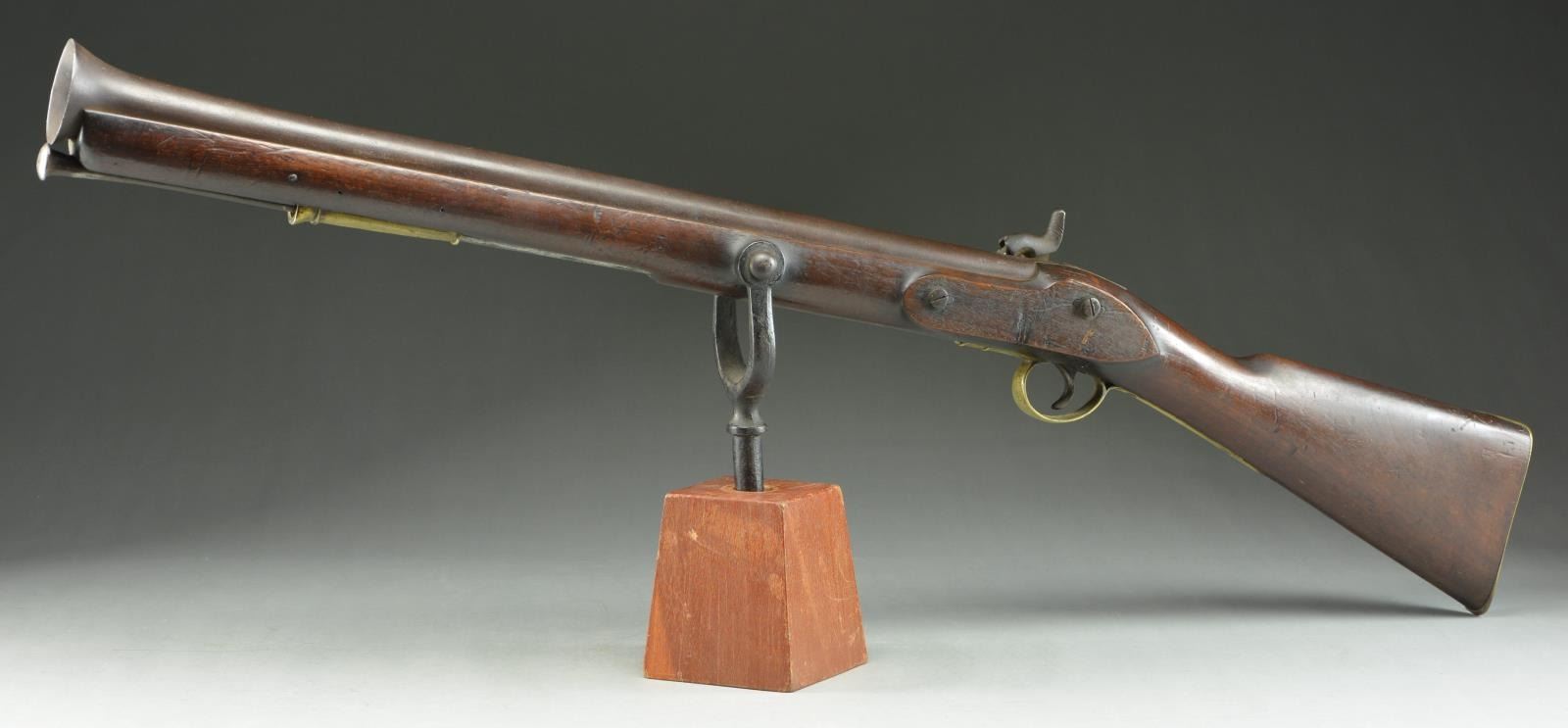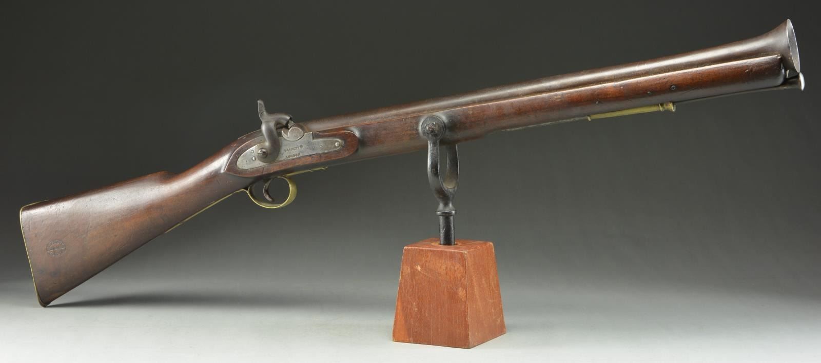 BARNETT. Cal. .90 (flares to 2.4" at muzzle). S# NSN. The 25 3/4" round barrel with London black powder proofs at 1 1/4" wide breech end flares at muzzle for easy loading. Percussion bolster on right side is unvented. Lock with flat plate is fitted with round bodied serpentine hammer and marked "BARNETT" "LONDON". Brass mounted walnut stock extends to muzzle and is pinned to barrel. Stock is fitted with cast iron oarlock type yoke. Right side of buttstock is stamped "BARNETT" "GUNMAKERS" "LONDON" in oval cartouche. Heavy steel ramrod mounts through beaded brass pipe and hole in stock without thimble. Gun comes with oak mounting block. CONDITION: very good. Barrel is even brown pitted patina. Lock shows cleaning to silver gray. Stock retains most of its oil finish with many bumps and marks. Bore is rusted. Lock is good. Brass nicely toned. PROVENANCE: From the Lifelong Collection of Glen E. Mattox. (01-22573/MGM). ANTIQUE. $2,000-3,000.