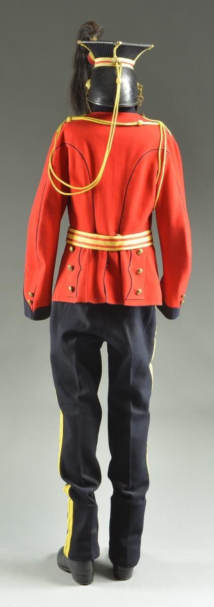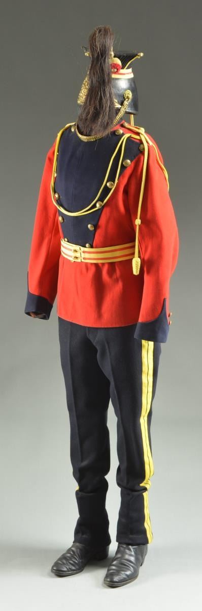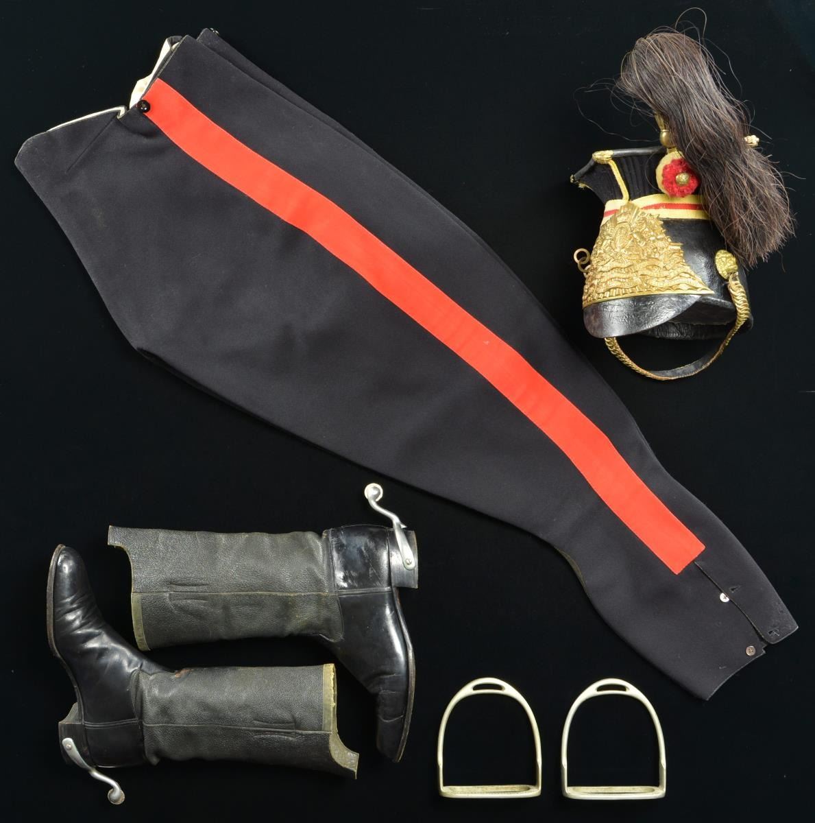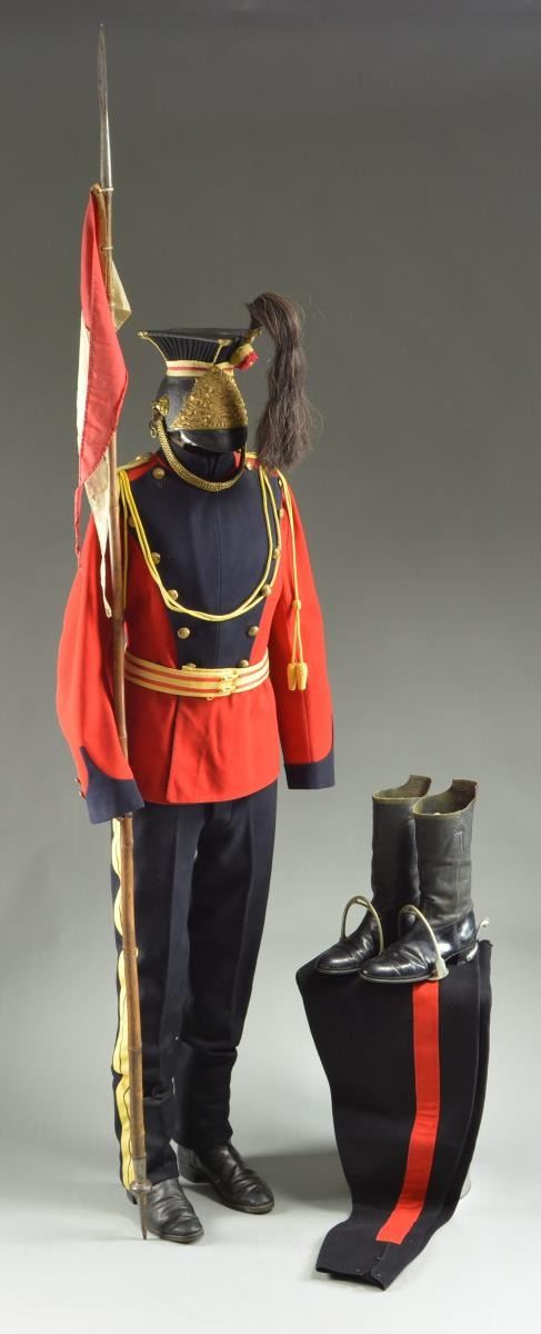 AND EQUIPMENT. The 12th Royal Lancers (Prince of Wales own) formed in 1715 served for many years and in many wars until it was amalgamated with the 9th Lancers to form 9th/12th Royal Lancers, Prince of Wales own in 1960. The grouping consists of a tunic w/ accessories, one pair of wool trousers, the leather helmet, a bamboo lance, 1 pair of leather boots. 1 pair of open nickel stirrups. The 1856 pattern Czapka Helmet has a square flat top referred to as a mortarboard. It is made with black lacquered leather body and visor with black ribbed top, faded yellow trim cord and a faded yellow and red band at the waist. The chin strap is composed of interlocking rings. The helmet has a horse hair plume w/ a red and white cockade and a brass plate w/ the British Royal Coat of Arms & the names of principle battles fought by the regiment, the latest of which is South Africa dated 1900-02, which helps date this helmet as very early 20th Century. The scarlet tunic has a contrasting blue double breasted front and blue cuffs. Yellow cloth belt w/ scarlet stripes. Tunic is adorned w/ yellow cord which serves to retain the helmet. Dark blue trousers w/ yellow stripes and black leather boots. The lance that measures 91" overall. This lance has a pattern 1868 head & shoe. The lance head is triangular in form & measures approx. 11" overall. The metal shoe measures 7 1/4" long & terminates in a pointed configuration. The Bamboo shaft measures approx. 72 1/2" between head & shoe & is made from "male" Bamboo which was the preferred material for lance shafts although it was difficult acquire & subject to insect damage. The lance has a red over white cloth pennon. Open metal stirrup set is marked underneath w/ "B" and "SOLID NICKEL". CONDITION: the uniform is in very good condition w/ bright colors. Buttons have a very light patina. The helmet has a aged appearance w/ light wear & staining. The band at the waist of the helmet has staining, wear & notable spots of insect damage on the left side. The helmet plate & other brass parts have a pleasing patina. Boots have light wear & notable scuffing along the seams & edges. The lance head which is unmarked is turning overall gray & patina. The sheet metal shoe is gray & patina w/ scattered sm. dents & the shoe has an open seam extending nearly halfway around. The lance shaft has moderate wear & staining & several long checks due to age. Stirrups have pleasing aged appearance w/ sm. spots of oxidation. (02-18162/RW). $3,000-4,000.