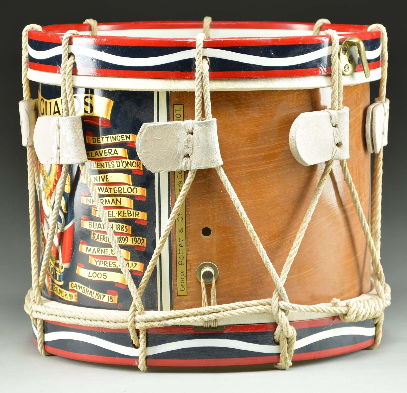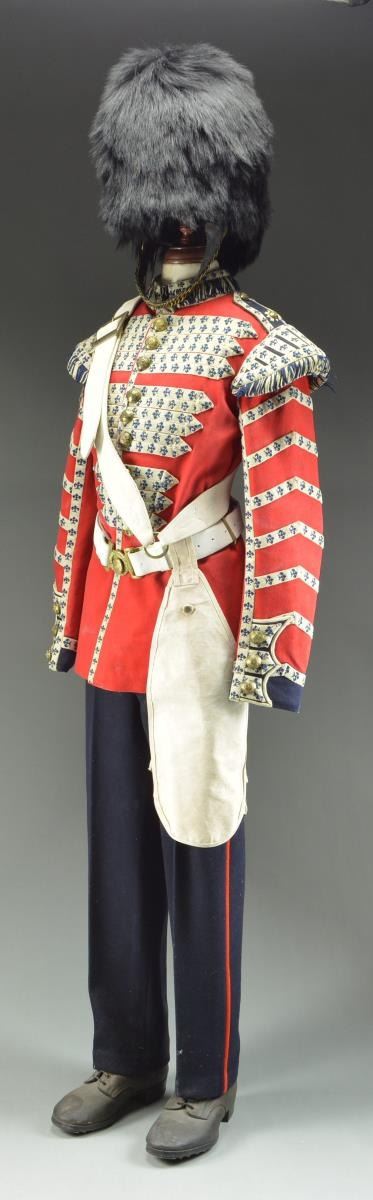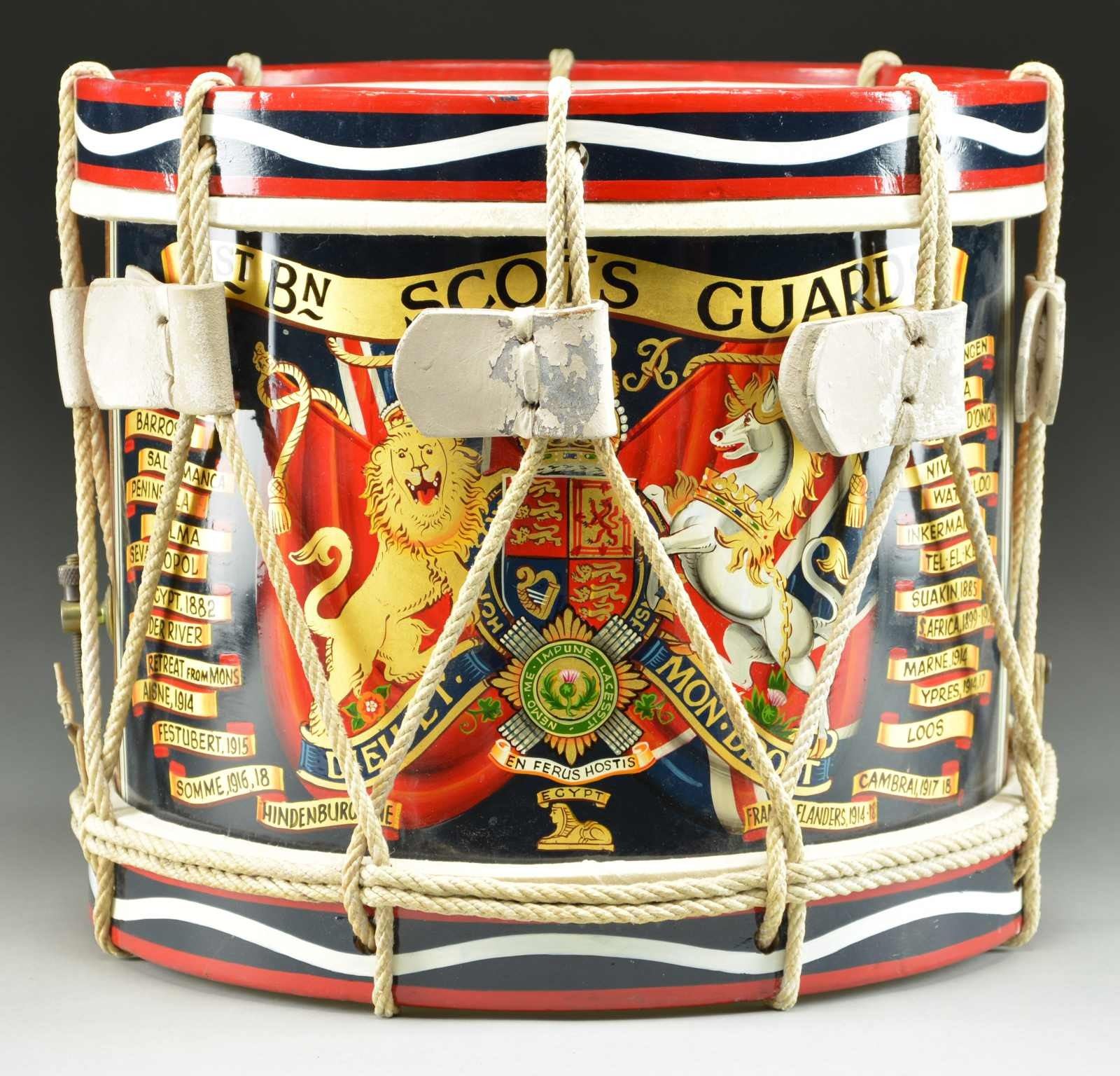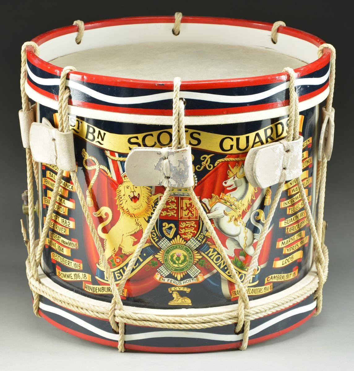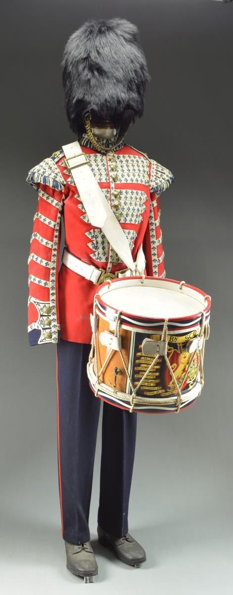 SLING, DRUM AND BUSBY. A very fine uniform group likely dating to the early 20th century. The group includes a Scots Guard’s drummer’s uniform with a red body & blue cuffs showing 3 large buttons on each cuff. The entire face & sleeves of the uniform, along with the back & tails, are decorated with heavy white tape embroidered with what appear to be blue fleur de lis. The blue & white brassards at the shoulders utilize the same blue & white tape decoration with blue & white tassels at the base. The front of the uniform has 8 Scots Guards buttons & 1 plain button under the belt. The back features 8 Scots Guards buttons at the tail with intricate blue & white tape decoration. The bottom of the uniform is raw but has a looped thread edge. The lining appears to be red cotton. The pants are heavy blue wool with thick red piping down the outside of each leg. The white buff belt supports a 2 piece Scots Guards buckle & a white canvas protection pad is suspended from the belt & straps around the left leg. The white buff sling has a large rectangular brass buckle & a brass ring for supporting the drum. The drum measures 13" high &14 3/4" in diameter. It is generally decorated in white, blue & red with numerous gilded highlights. It features the British Arms on the front with a ribbon above that reads “1st BN SCOTS GUARDS”. Surrounding the arms are ribbons with the major battles of the Scots Guards up until 1918. The black bear skin busby has a black leather liner with rattan supports. The busby has a gilded brass linked chinstrap. There is a pair of military boots included with the uniform that have metal heel cleats &hobnails for marching. CONDITION: the uniform is in good solid condition with a few minor stains & moth nips. A few of the blue & white tassels are a bit frayed but present. The white buff belt & sling remain quite strong & undamaged. The drum shows very light wear overall with some flaking to the tugs. Busby is in solid condition. Boots show light wear. (02-18158/BF). $1,750-2,500.