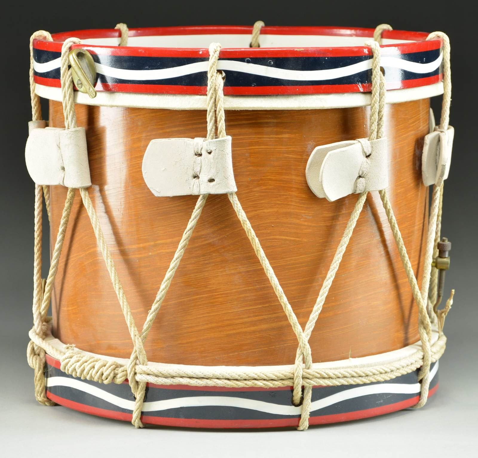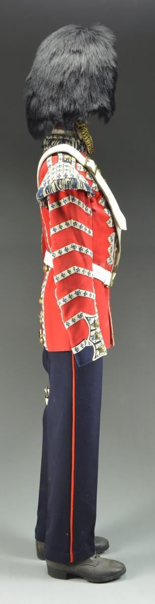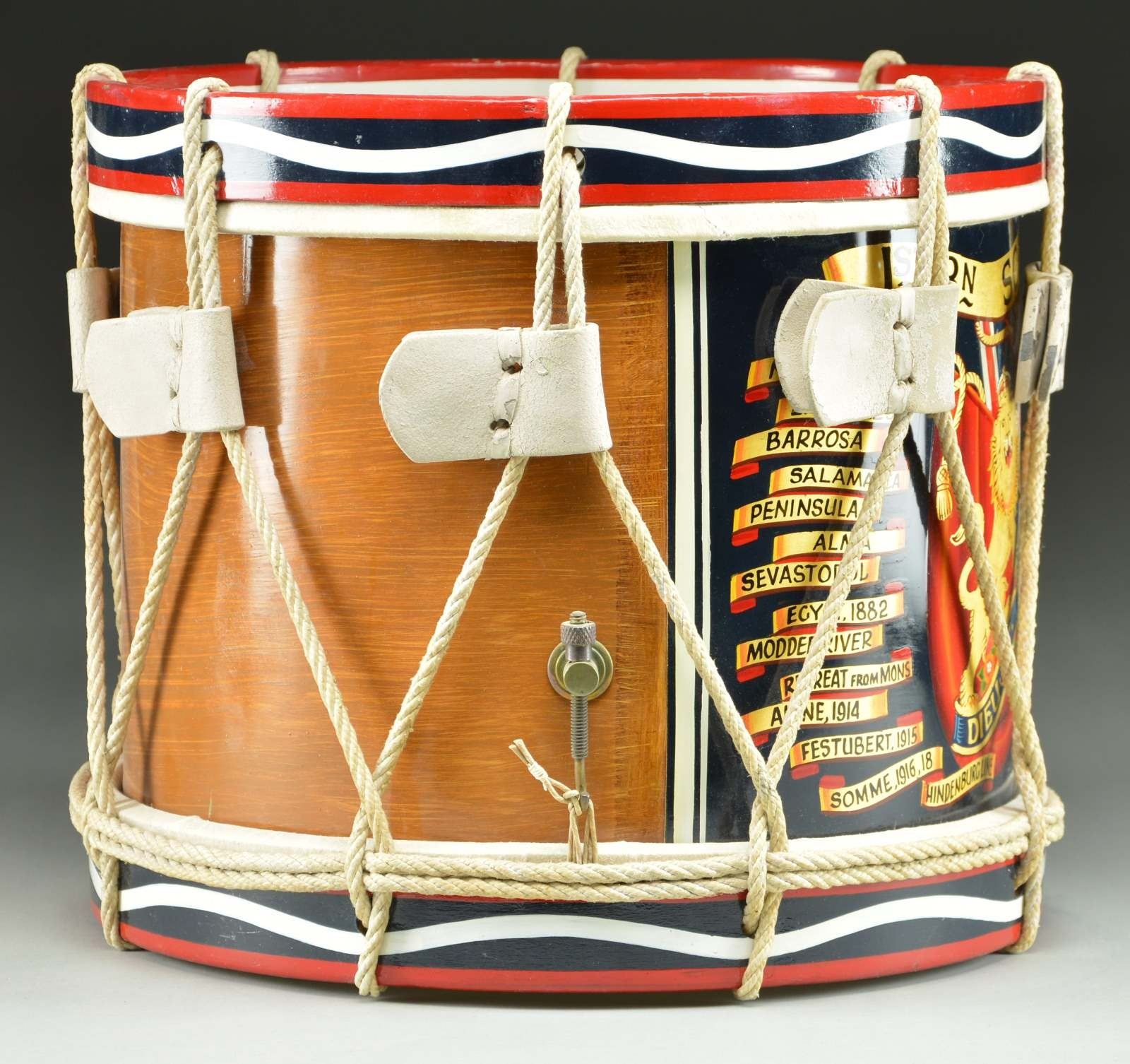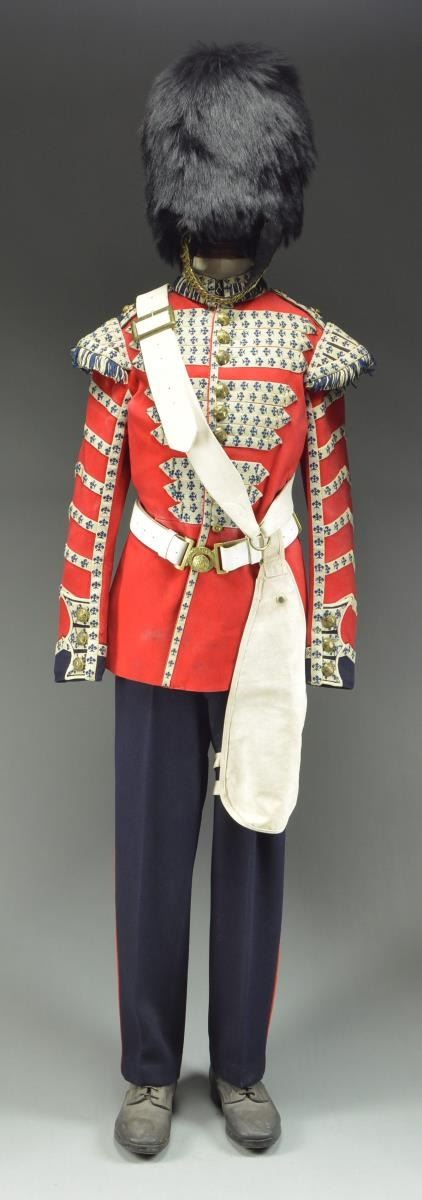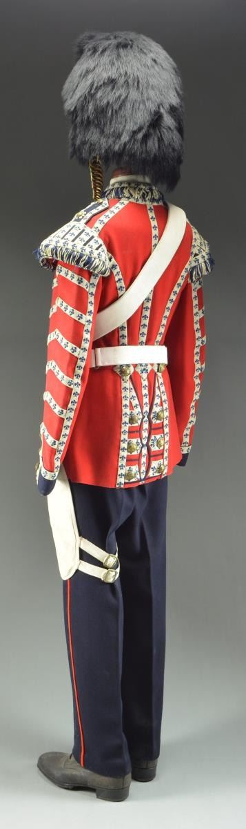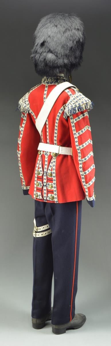 SLING, DRUM AND BUSBY. A very fine uniform group likely dating to the early 20th century. The group includes a Scots Guard’s drummer’s uniform with a red body & blue cuffs showing 3 large buttons on each cuff. The entire face & sleeves of the uniform, along with the back & tails, are decorated with heavy white tape embroidered with what appear to be blue fleur de lis. The blue & white brassards at the shoulders utilize the same blue & white tape decoration with blue & white tassels at the base. The front of the uniform has 8 Scots Guards buttons & 1 plain button under the belt. The back features 8 Scots Guards buttons at the tail with intricate blue & white tape decoration. The bottom of the uniform is raw but has a looped thread edge. The lining appears to be red cotton. The pants are heavy blue wool with thick red piping down the outside of each leg. The white buff belt supports a 2 piece Scots Guards buckle & a white canvas protection pad is suspended from the belt & straps around the left leg. The white buff sling has a large rectangular brass buckle & a brass ring for supporting the drum. The drum measures 13" high &14 3/4" in diameter. It is generally decorated in white, blue & red with numerous gilded highlights. It features the British Arms on the front with a ribbon above that reads “1st BN SCOTS GUARDS”. Surrounding the arms are ribbons with the major battles of the Scots Guards up until 1918. The black bear skin busby has a black leather liner with rattan supports. The busby has a gilded brass linked chinstrap. There is a pair of military boots included with the uniform that have metal heel cleats &hobnails for marching. CONDITION: the uniform is in good solid condition with a few minor stains & moth nips. A few of the blue & white tassels are a bit frayed but present. The white buff belt & sling remain quite strong & undamaged. The drum shows very light wear overall with some flaking to the tugs. Busby is in solid condition. Boots show light wear. (02-18158/BF). $1,750-2,500.