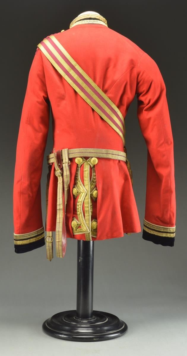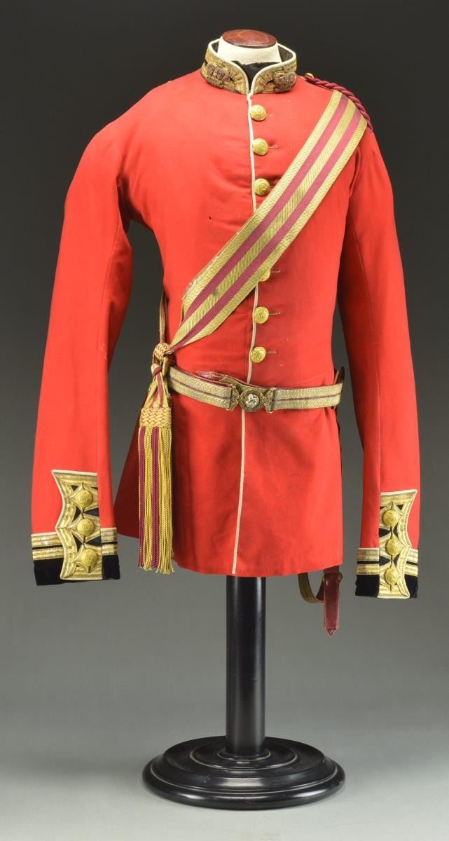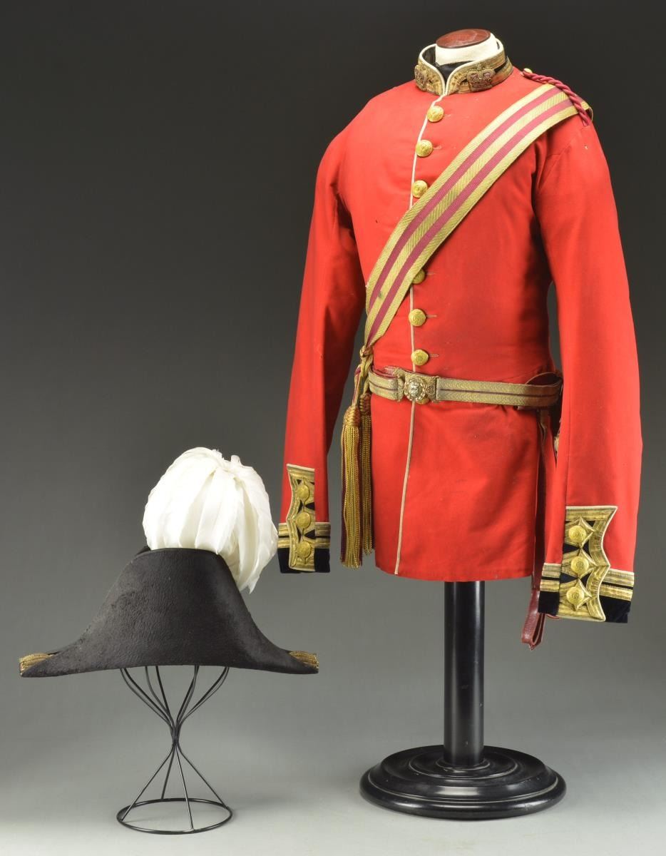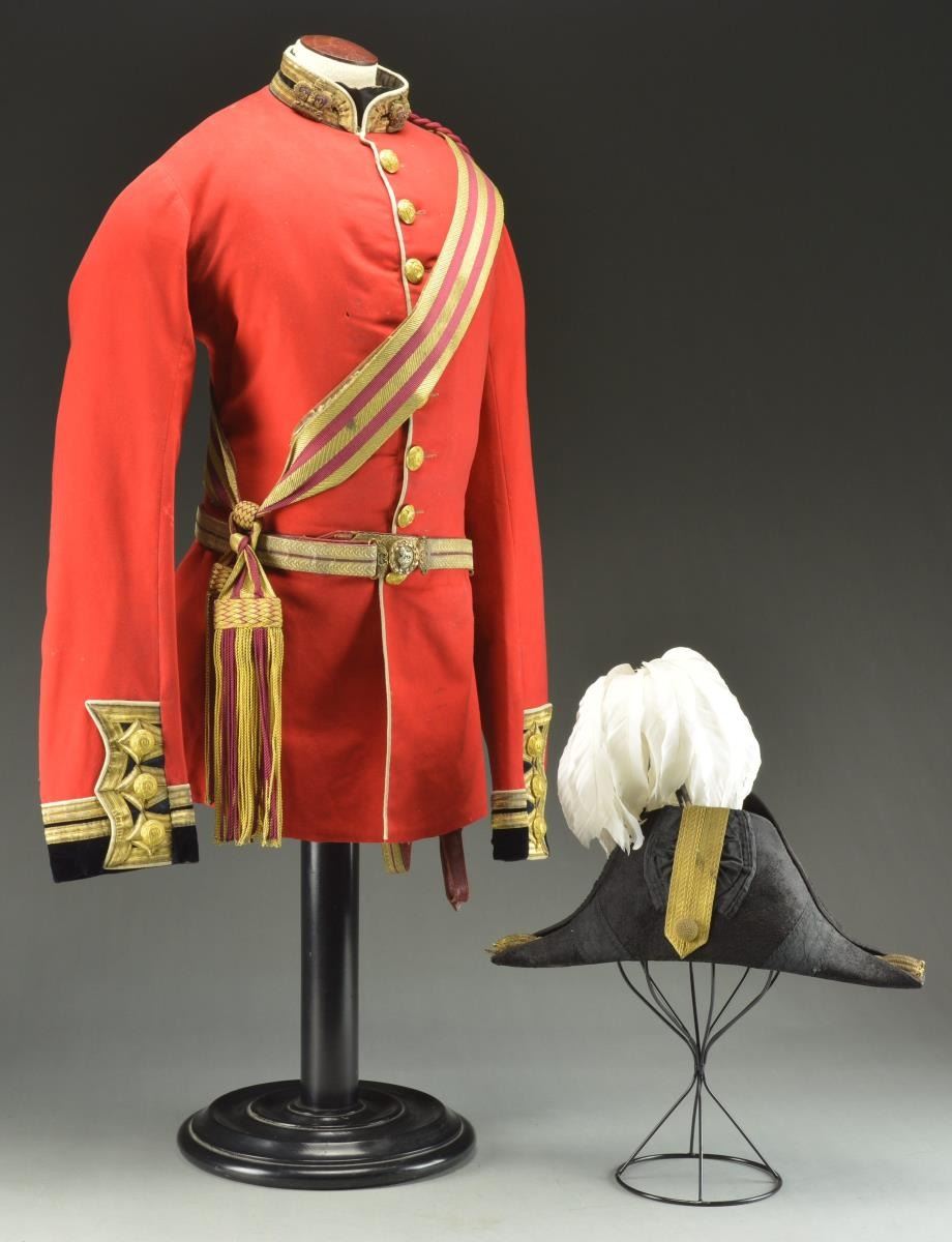 CHAPEAU. The uniform is fine red wool, lined in white & conforms to the regulations of 1856-1868. The collar & cuffs are black velvet edged with 3/4" gold bullion tape. The front of the coat & tails are piped in white. There are 8 large buttons down the front that show a “VR” cipher surrounded by the words “MEDICAL STAFF”. There are an additional 6 buttons on the tail with more 3/4" gold bullion tape. The cuffs each have 3 large buttons with bullion tape & white piping over the black velvet. The collar has 1 large bullion crown on each side of the front. The shoulder strap is twisted crimson cord terminated by a small Medical Staff button. The shoulder sash is gold bullion with 2 crimson stripes ended in 2 large tassels. The belt features gold bullion tape over red Moroccan leather. Both sword straps are present & the interlocking buckle features a central silver lion on crown. The black chapeau has a bullion tassel on each end & a single bullion chevron with button on the side. The chapeau comes with a correct white feather plume. CONDITION: uniform shows a few tiny areas of moth damage but remains solid & immensely visually attractive. The belt & sash show light wear, as does the chapeau. (02-18161/BF). $1,000-1,500.