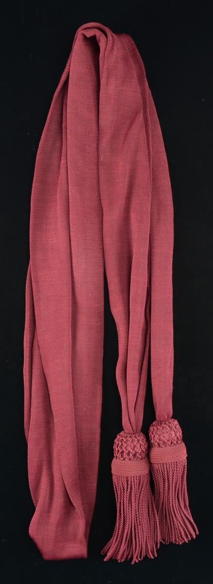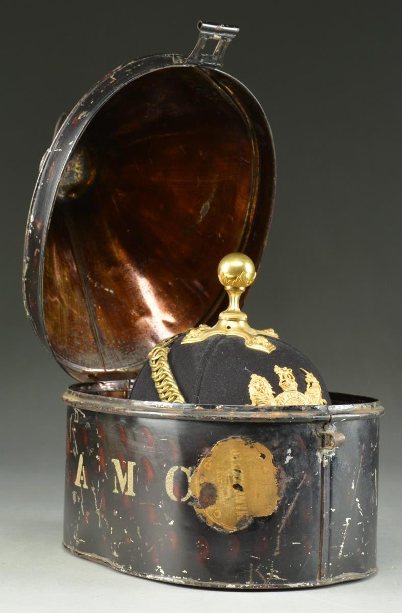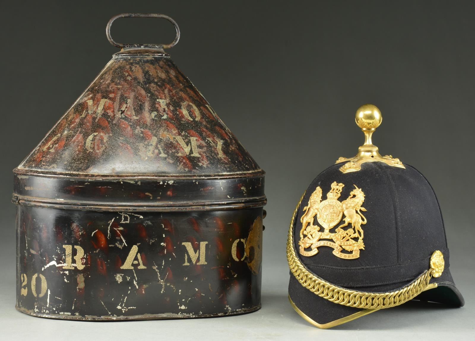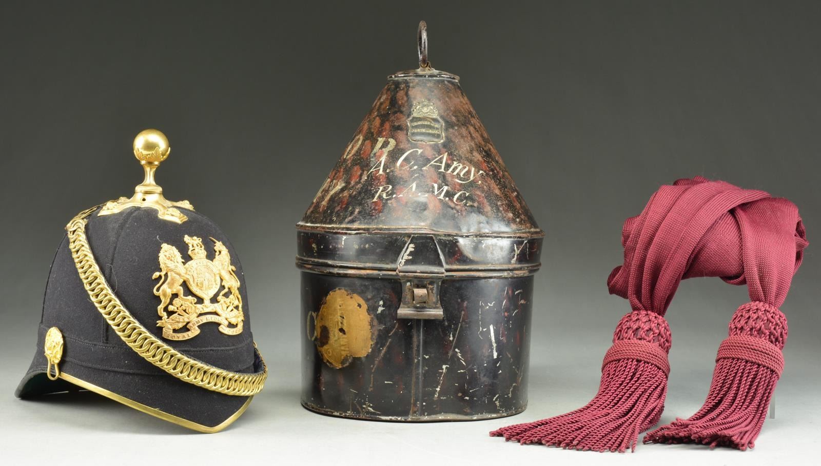 PAINTED TIN CARRIER AND SASH. A truly fine quality British Military dress helmet for an officer in the Medical Corps. The helmet has 4 piece construction with a large heavily gilded ball on the top. The front plate has the British Arms over a ribbon that read “ROYAL ARMY MEDICAL CORPS”. Linked chain chinstrap with Tudor rose side buttons. The interior is marked “TRAYLER & CO OUTFITTERS HIGH STREET PORTMOUTH”. Trayler & Co was a business from 1881 to 1905 at 103 High St. in Portsmouth, England. The tinned iron hat box has a black painted finish with red brush strokes. It has an applied brass label that reads “TRAYLER & CO PORTSMOUTH”. There are a number of markings and stencils on the box. The most prominent of which reads “A.C. Amy. R.A.M.C.”. Included with the helmet is a very well made maroon officers waist sash of high quality wool. CONDITION: the helmet shows very light wear overall. The hat box shows moderate to heavy wear but remains solid. (02-18155/BF). $700-1,200.