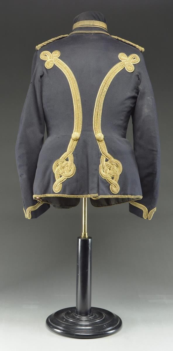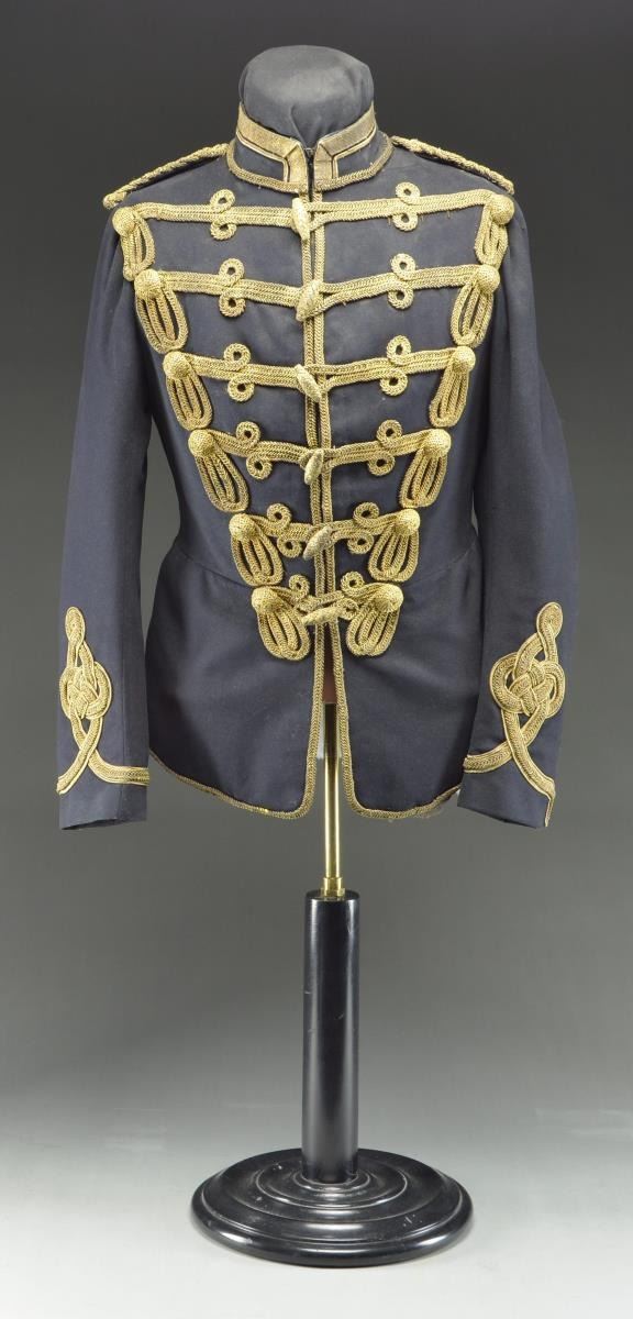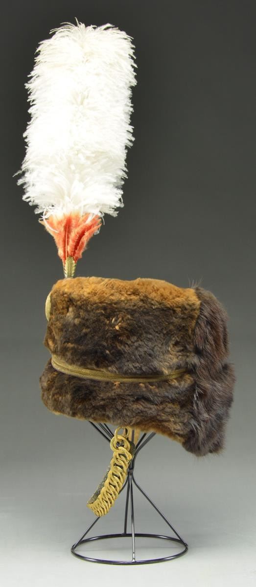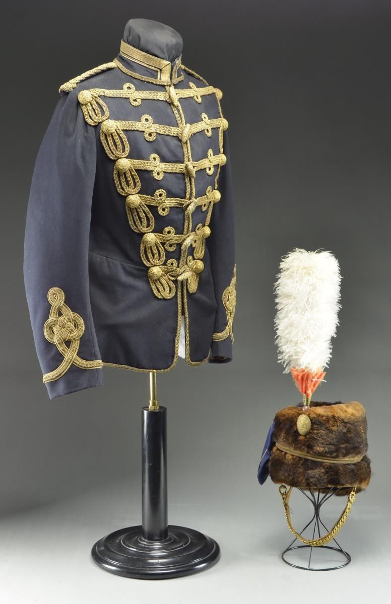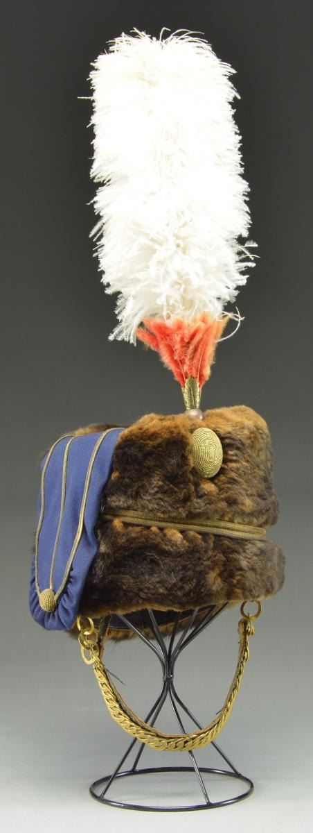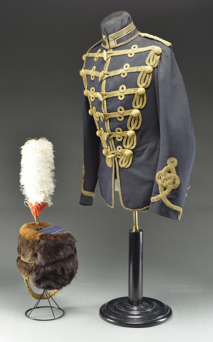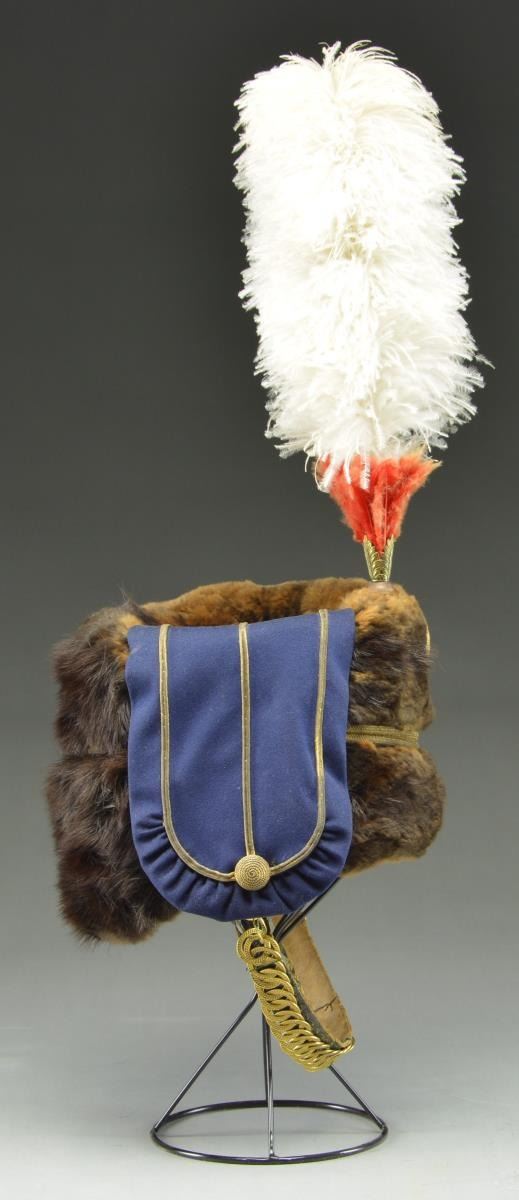 & BUSBY. The 18th Hussars have a lineage going back to their formation in 1759. Through amalgamation they became the Light Dragoons in 1992. The Regimental Colonels in Chief included Queen Mary & Diana, Princess of Wales. The Regimental Colonels include Sir Robert Baden Powell, instrumental in founding the Boy Scouts. The black tunic is adorned w/ gold colored heavy braid and has a standing collar edged in braid. Tunic is mounted on a manikin w/ a circular wooden base. Included is the Busby which is marked inside "JONES CHALK & DAWSON TAYLORS MILITARY OUTFITTERS 6, SACKVILLE ST. LONDON. W." The Busby is covered w/ brown sable fur & a gold colored braided band. It has a blue bag w/ gold colored edging. The feathered plume is correct white over crimson. The back of the boss has a spring socket to hold the stem of the plume. The chin strap consists of brass rings w/ leather liner. CONDITION: the jacket is in good condition w/ very light wear & staining. The right sleeve has added stitching at the rear. There are several scattered spots of insect damage & gold color braid is turning dark w/ a pleasing aged appearance. The Busby has fading prominent on the front & top from a black to a brown sable fur but no significant loss of fur. Leather parts have light wear notably on the lower edge of the headband. Chinstrap liner is detached. Crimson plume feathers have a faded appearance & the white feathers have very lightly aged look. (02-18160/RW). $900-1,200.