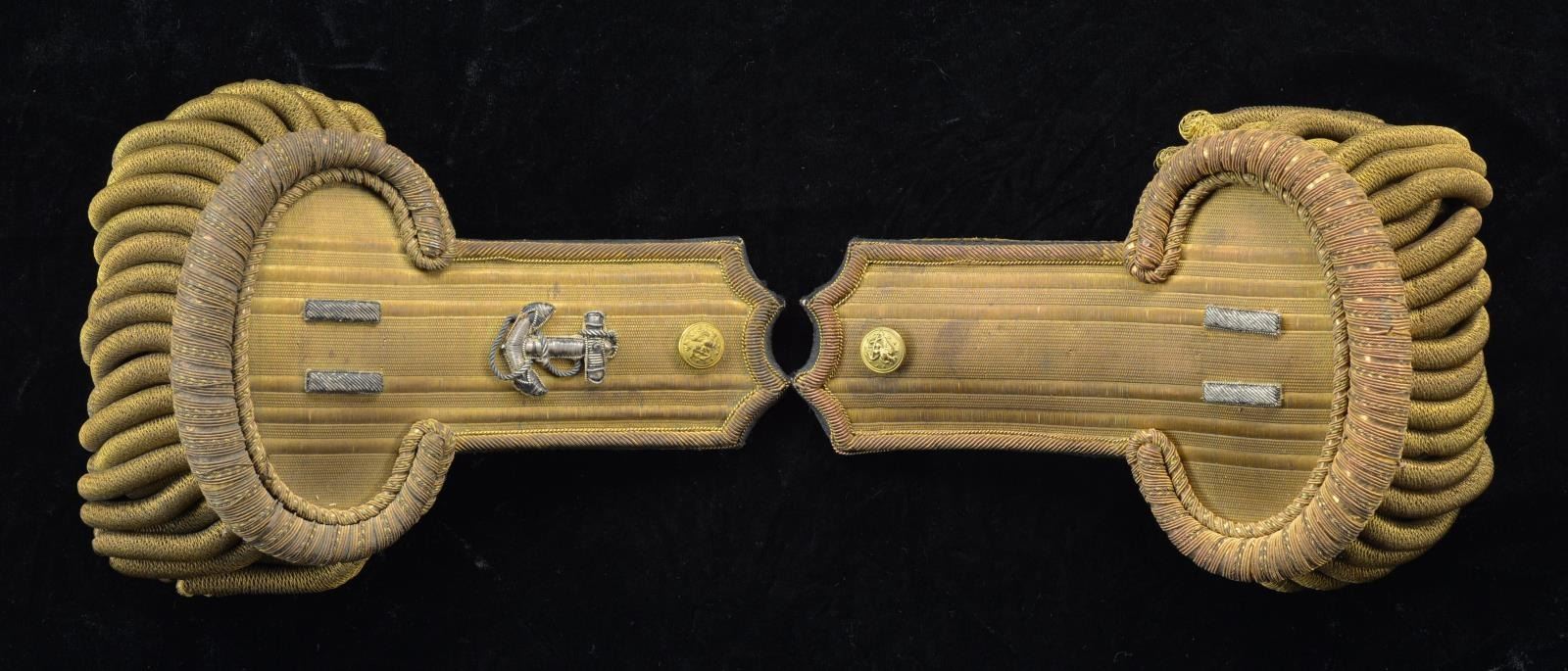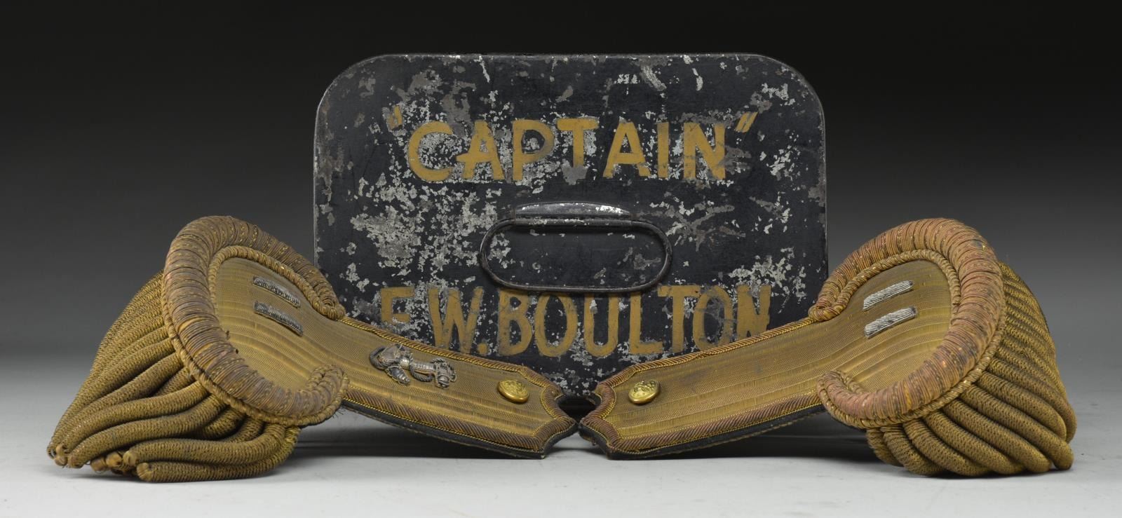 CAPTAIN EDWIN BOULTON. Rectangular Japanned casing painted in gold "CAPTAIN / E W BOULTON". Typical bullion dress epaulets w/ Navy buttons, Captain's insignia & fouled anchor device on 1. CONDITION: good overall. PROVENANCE: Collection of John Montague. (02-16574/JS). $200-300.
