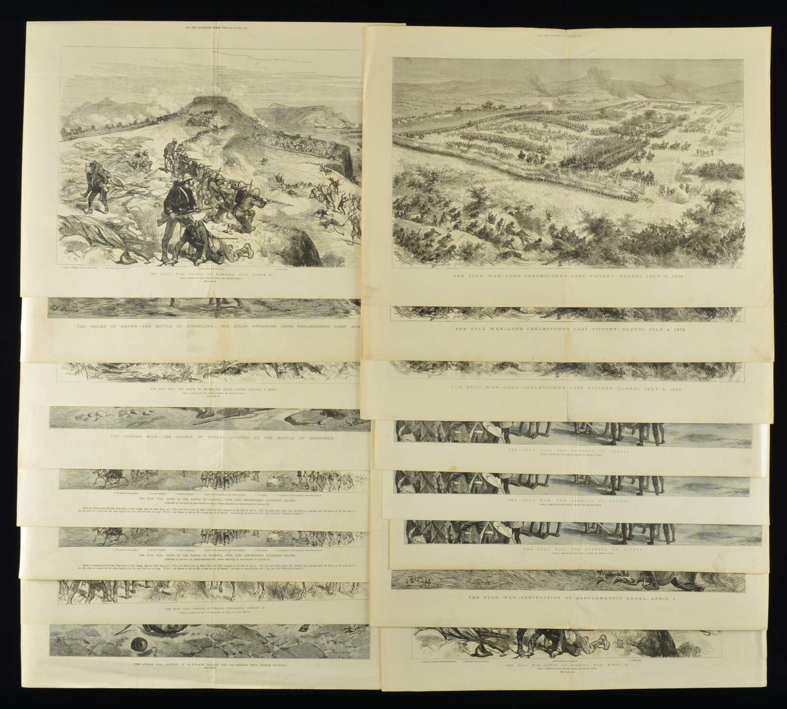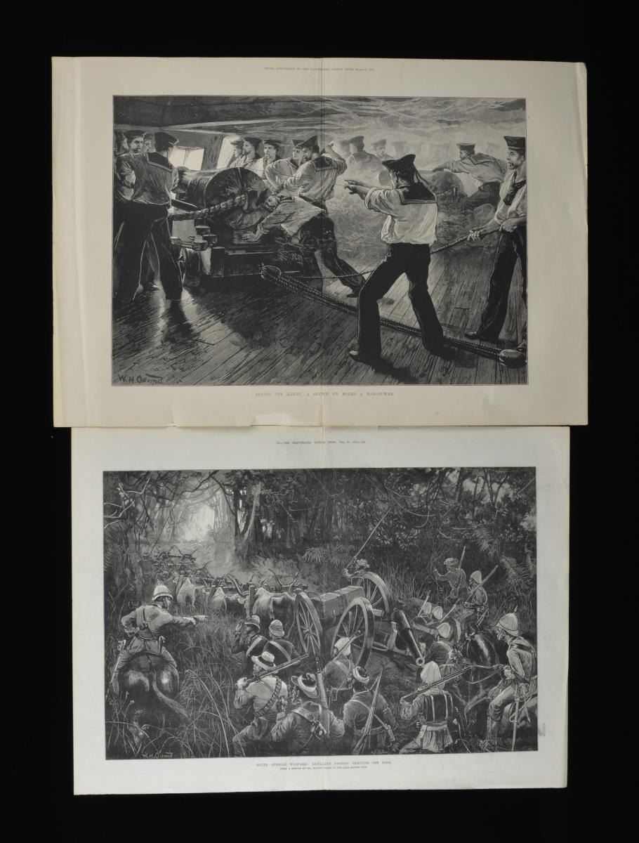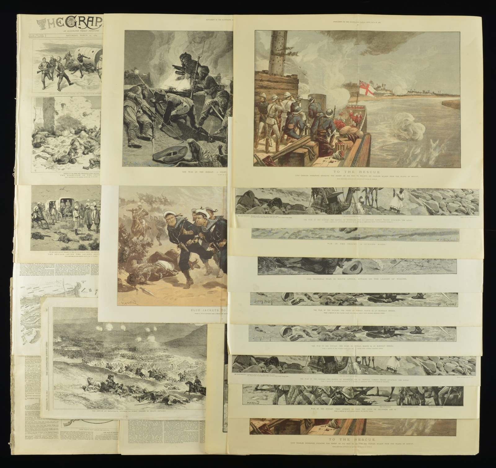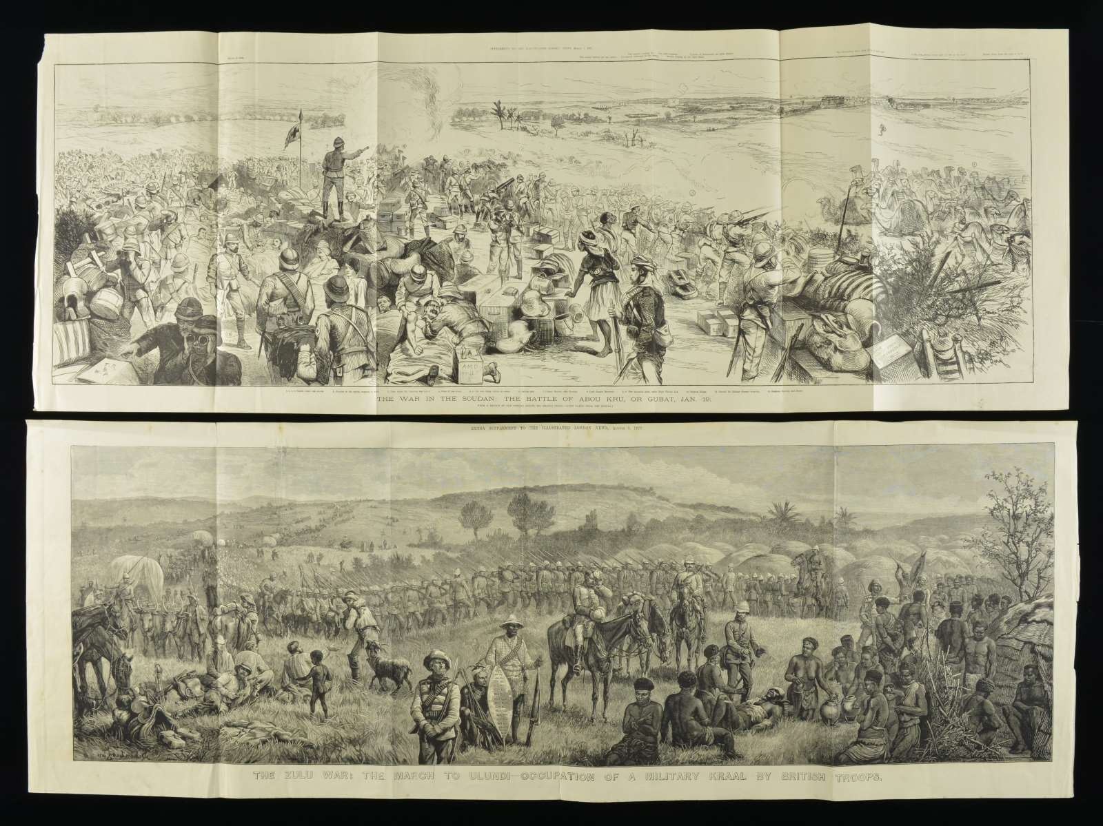 BRITISH MILITARY SCENES THROUGHOUT THE EMPIRE. These wonderful engravings, primarily from the "Illustrated London News” & “The Graphic", are the work of some of the most famous military artists, including Caton Woodvile & Melton Prior. EXTRA LG. SIZE (multiple page) engravings (folded when published) Sudan-“Battle of Tel-el-Kebir”-ILN 9/30/1882 (3 cc) 40"x15". / Sudan- “Battle of Tel-el-Kebir-Over the Trenches” by R. Caton Woodville, ILN 10/7/1882. 4 pages 24 x 31. / War in Soudan: “Battle of Tamasi, Gallant Recapture of the Guns” by W.H. Overread, ILN Extra Supplement 4/12/1881, 5 pages, 16" x 46". / War in Soudan: “Battle of Abou Kru, June 19”: by Melton Prior, ILN Supplement 3/7/1885, 5 pages, (2 copies), 16" x 46". / Zulu War: “March to Ulundi- Occupation of the Military Kraal by British Troops”, ILN 8/9/1879, Extra Supplement, 5 pp, 16" x 45". / Zulu War: “Relief of Ekowe: “Lord Chelmsford’s Column Crossing the Amalkulu River, March 31, 1879”, Graphic Suppl., 5/17/1879, 5 pp., 16" x 47". DOUBLE PAGE SIZE engravings (all about 16" x 21") (11" x 16"- folded size- folded when published): Afghan War: "15th Hussars" and Afghan cavalry battle by R. Caton Woodville, ILN 6/7/1879, (2 copies). / Afghan War: “An Attack in the Khooram Valley” by R. Caton Woodville, ILN 2/8/1879 Extra Supplement. / Afghan War: “The Charge of the Bengal Lancers at the Battle of Dehouruh” by S. Charlton, Graphic 5/24/1979. / Zulu War: “Capture of Sirayos’ Stronghold, January 12”, ILN 3/1/1879. / Zulu War: “Scene of the Battle of Isandula: With Lord Chelmsford’s Advancing Column”, ILN 3/1/1879, (2 copies). / Zulu War: “Retreat of Fugitives’ from Isandlwana Across the Buffalo River” by S. Durand, ILN 3/29/1879 (2 copies). / “The March to Ekowe-Relief Column Crossing a Drift” bay Melton Prior, ILN 5/17/1879. / Zulu War: “Relief of Ekowe, Battle of Ginghilova The Zulus Attacking Lord Chelmsford’s Camp, April 2”, ILN 5/17/1879. / Zulu War: “Battle of Kambula Hill” by Melton Prior, ILN 5/24/1879 (2 cc). / Zulu War: Destruction of Dabulamanzi’s Kraal, April 4” by C.E. Fripp, Graphic 6/7/1879. / Zulu War: “Battle of Ulundi: Inside the Square” by Melton Prior ILN 8/23/1879 (4 copies) (plus article about this scene & artist Melton Prior). / Zulu War: “The Burning of Ulundi” by Melton Prior, ILN 8/23/1879 (3 copies). / Zulu War: “Lord Chelmsford’s Last Victory: Ulundi. July 4, 1879” by S. Durand, Graphic 8/23/1879 (4 copies). / Zulu War: “Advance of the British Troops on Ulundi” by Melton Prior, ILN 8/30/1879, (3 copies). / War in Egypt: “Reconnaissance in Force at Kindji Osman on Aug. 5- Charge of the 60th Rifles” by H. Overend, ILN 8/19/1882. / War in Egypt: “Surrender” by R.Caton Woodville, Extra Suppl. ILN 9/16/1882. / Sudan: “Blue Jackets to the Front” by W. H. Overend, (color tinted, as published), Extra Suppl., ILN 3/29/1884, (3 copies). / Sudan: “To the Rescue” (Royal Navy- Meruat Island) by W. H. Ingram (color tinted, as published), Supplement, ILN 3/21/1885 (2 copies). / War in the Sudan: “First Attempt to Take the Town of Metammeh, Jan. 31” by Melton Prior, ILN 3/7/1885. / War in the Sudan: “The Battle of Kerbekan, Feb. 10: Gen. Earle’s Troops Attacking the Enemy” ILN 3/21/1885, (2 copies). / WAR IN THE SOUDAN: “A Night Attack at the Camp at Souakin” by R. Caton Woodville, Supplement, ILN 4/4/1885. / War in the Sudan: “The Fight of Sunday, March 22 at McNeill’s Zereba” by R. Taylor, ILN 4/18/1885, (2 copies). / Sudan: “Trying the Range: A Sketch on Board a Man-of-War” by W. H. Overend, ILN Extra Supplement 3/8/1884. / South African Warfare- artillery, ILN 2/22/1879. / Matabili War in S. Africa: “Attack on the Laager of Wagons” by R. Caton Woodville, ILN 12/9/1893. / War in the Desert: “A Running Fight” by R. Caton Woodville, ILN 2/7/1885. ZULU and SUDAN WARS - Single page size (all 11" x 16"): End of the Zulu War: “Mounted Infantry Skirmishing with Zulus”, ILN 10/4/1879, (2 copies). / War in the Soudan: 2 scenes before battles of Tamanieb and Tamasi- sketches by Melton Prior, ILN 4/19/1884. / War in the Soudan: “Stampede of Baker Pasha’s Army from the Battlefield to the Shore at Trinkitat February 4”, ILN 3/1/1884. / War in the Soudan: "Battle of El Teb", 2 sketches by Melton Prior, ILN cover 3/22/1884. / War in the Soudan: “Battle of El Teb, Feb. 29: Storming of First Fort by the Gordon Highlanders”, sketch by Melton Prior, ILN 3/22/1884. / War in the Soudan: “Battle of El Teb, Feb 29: Naval Brigade in Action”, sketch by Melton Prior, ILN 3/22/1884. / War in the Soudan: “The Cavalry Charge at the Battle of El Teb, Feb, 29”, sketch by Melton Prior, ILN 3/22/1884. CRIMEAN WAR - 1854-Single page size (all 11" x 16"): “Plan of the Battle of the Alma”, ILN 10/28/1854 (2 scenes on page). / “The Seige of Sebastropol: General View”, ILN 11/18/1854. / “The Action at Balaclava: October 21 First Charge of Heavy Cavalry”, ILN 11/18/1854, (2 copies). / Multi Page Sections of “The Graphic” newspaper (all 11" x 16"- folded size) (folded when published): 2/16/1878 (8 page section of newspaper), including H.M.Stanley’s Anglo- American African Expedition (double page illustration- 16 x 22). / 3/1/1884 (22 page section of newspaper) incl. Defeat of Baker Pasha at Teb in Attempt to Relieve Tokar“ (Sudan-5 pg. illustration-approx.16 x 46). / 3/22/1884 (23 page section of newspaper) incl. Soudan War: Second Battle of El Teb, (double page illustration, 16 x 22) and other military illustrations, plus 2 pg. illus. of the Expulsion of the Quakers from MA,1660. / 3/29/1884 (23 page section of newspaper), incl. Soudan War: “19th Hussars Charge at El Teb, February 29”, (double page illustration, 16 x 22) and other military illustrations. / 2/23/1878 (79 page section of newspaper) incl. 2 double page (16" x 22") illustrations of scenes of Mr. H.M. Stanley