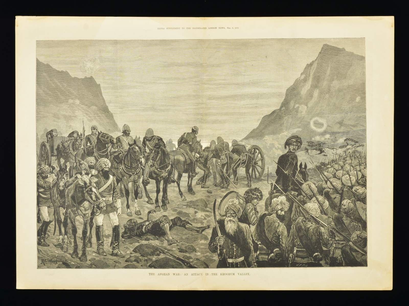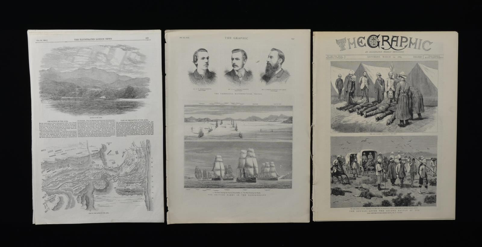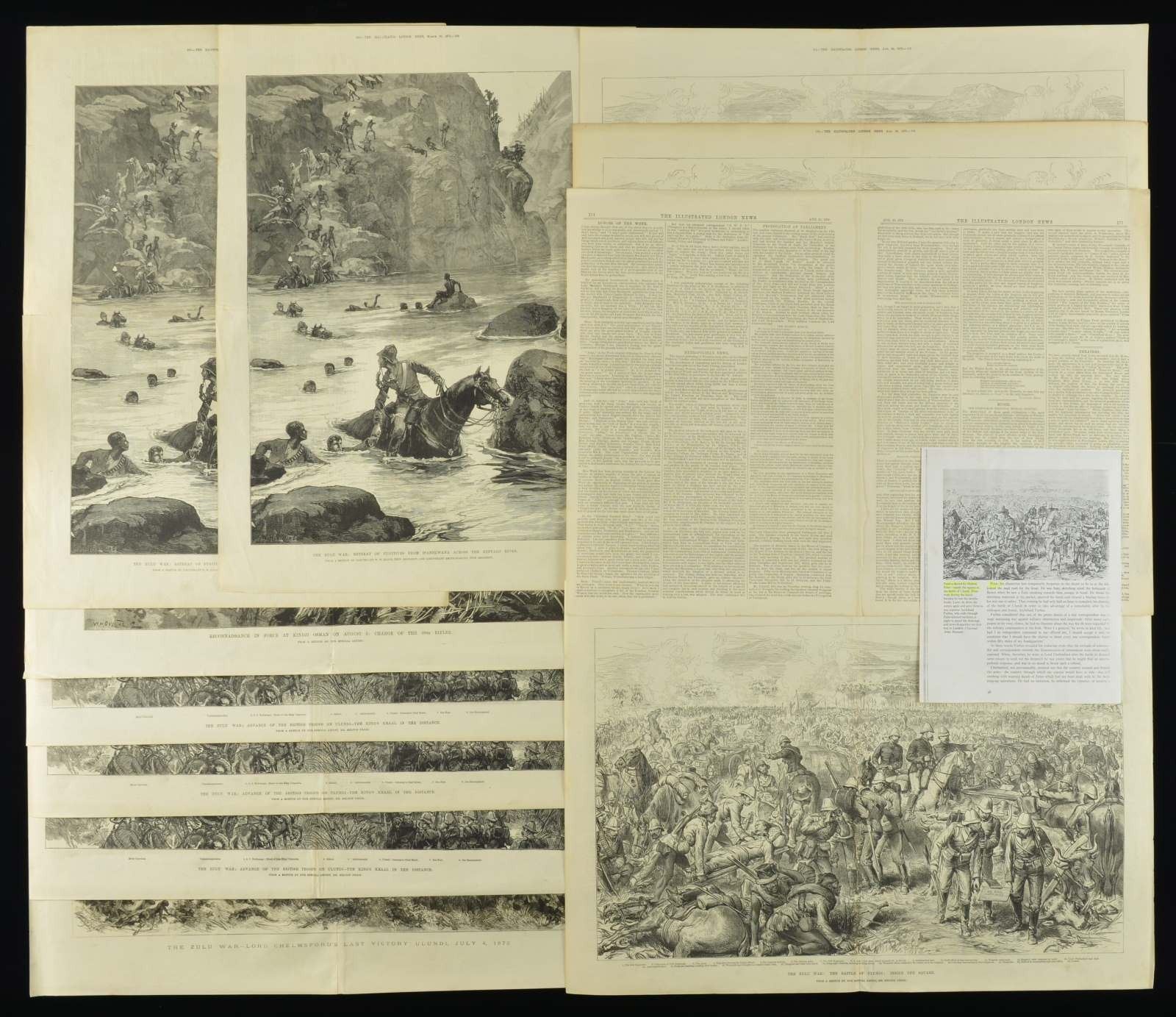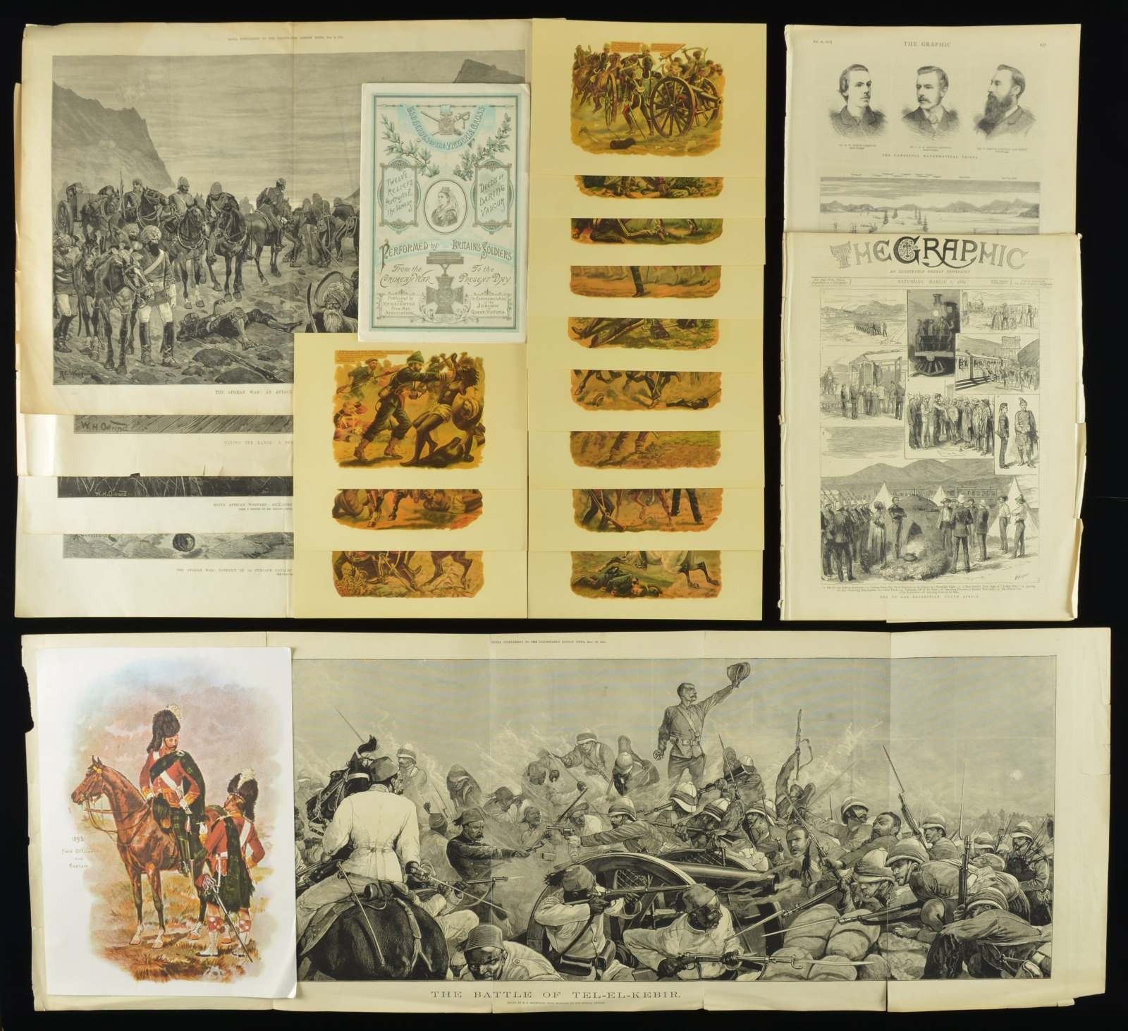 BRITISH MILITARY SCENES THROUGHOUT THE EMPIRE. These wonderful engravings, primarily from the "Illustrated London News” & “The Graphic", are the work of some of the most famous military artists, including Caton Woodvile & Melton Prior. EXTRA LG. SIZE (multiple page) engravings (folded when published) Sudan-“Battle of Tel-el-Kebir”-ILN 9/30/1882 (3 cc) 40"x15". / Sudan- “Battle of Tel-el-Kebir-Over the Trenches” by R. Caton Woodville, ILN 10/7/1882. 4 pages 24 x 31. / War in Soudan: “Battle of Tamasi, Gallant Recapture of the Guns” by W.H. Overread, ILN Extra Supplement 4/12/1881, 5 pages, 16" x 46". / War in Soudan: “Battle of Abou Kru, June 19”: by Melton Prior, ILN Supplement 3/7/1885, 5 pages, (2 copies), 16" x 46". / Zulu War: “March to Ulundi- Occupation of the Military Kraal by British Troops”, ILN 8/9/1879, Extra Supplement, 5 pp, 16" x 45". / Zulu War: “Relief of Ekowe: “Lord Chelmsford’s Column Crossing the Amalkulu River, March 31, 1879”, Graphic Suppl., 5/17/1879, 5 pp., 16" x 47". DOUBLE PAGE SIZE engravings (all about 16" x 21") (11" x 16"- folded size- folded when published): Afghan War: "15th Hussars" and Afghan cavalry battle by R. Caton Woodville, ILN 6/7/1879, (2 copies). / Afghan War: “An Attack in the Khooram Valley” by R. Caton Woodville, ILN 2/8/1879 Extra Supplement. / Afghan War: “The Charge of the Bengal Lancers at the Battle of Dehouruh” by S. Charlton, Graphic 5/24/1979. / Zulu War: “Capture of Sirayos’ Stronghold, January 12”, ILN 3/1/1879. / Zulu War: “Scene of the Battle of Isandula: With Lord Chelmsford’s Advancing Column”, ILN 3/1/1879, (2 copies). / Zulu War: “Retreat of Fugitives’ from Isandlwana Across the Buffalo River” by S. Durand, ILN 3/29/1879 (2 copies). / “The March to Ekowe-Relief Column Crossing a Drift” bay Melton Prior, ILN 5/17/1879. / Zulu War: “Relief of Ekowe, Battle of Ginghilova The Zulus Attacking Lord Chelmsford’s Camp, April 2”, ILN 5/17/1879. / Zulu War: “Battle of Kambula Hill” by Melton Prior, ILN 5/24/1879 (2 cc). / Zulu War: Destruction of Dabulamanzi’s Kraal, April 4” by C.E. Fripp, Graphic 6/7/1879. / Zulu War: “Battle of Ulundi: Inside the Square” by Melton Prior ILN 8/23/1879 (4 copies) (plus article about this scene & artist Melton Prior). / Zulu War: “The Burning of Ulundi” by Melton Prior, ILN 8/23/1879 (3 copies). / Zulu War: “Lord Chelmsford’s Last Victory: Ulundi. July 4, 1879” by S. Durand, Graphic 8/23/1879 (4 copies). / Zulu War: “Advance of the British Troops on Ulundi” by Melton Prior, ILN 8/30/1879, (3 copies). / War in Egypt: “Reconnaissance in Force at Kindji Osman on Aug. 5- Charge of the 60th Rifles” by H. Overend, ILN 8/19/1882. / War in Egypt: “Surrender” by R.Caton Woodville, Extra Suppl. ILN 9/16/1882. / Sudan: “Blue Jackets to the Front” by W. H. Overend, (color tinted, as published), Extra Suppl., ILN 3/29/1884, (3 copies). / Sudan: “To the Rescue” (Royal Navy- Meruat Island) by W. H. Ingram (color tinted, as published), Supplement, ILN 3/21/1885 (2 copies). / War in the Sudan: “First Attempt to Take the Town of Metammeh, Jan. 31” by Melton Prior, ILN 3/7/1885. / War in the Sudan: “The Battle of Kerbekan, Feb. 10: Gen. Earle’s Troops Attacking the Enemy” ILN 3/21/1885, (2 copies). / WAR IN THE SOUDAN: “A Night Attack at the Camp at Souakin” by R. Caton Woodville, Supplement, ILN 4/4/1885. / War in the Sudan: “The Fight of Sunday, March 22 at McNeill’s Zereba” by R. Taylor, ILN 4/18/1885, (2 copies). / Sudan: “Trying the Range: A Sketch on Board a Man-of-War” by W. H. Overend, ILN Extra Supplement 3/8/1884. / South African Warfare- artillery, ILN 2/22/1879. / Matabili War in S. Africa: “Attack on the Laager of Wagons” by R. Caton Woodville, ILN 12/9/1893. / War in the Desert: “A Running Fight” by R. Caton Woodville, ILN 2/7/1885. ZULU and SUDAN WARS - Single page size (all 11" x 16"): End of the Zulu War: “Mounted Infantry Skirmishing with Zulus”, ILN 10/4/1879, (2 copies). / War in the Soudan: 2 scenes before battles of Tamanieb and Tamasi- sketches by Melton Prior, ILN 4/19/1884. / War in the Soudan: “Stampede of Baker Pasha’s Army from the Battlefield to the Shore at Trinkitat February 4”, ILN 3/1/1884. / War in the Soudan: "Battle of El Teb", 2 sketches by Melton Prior, ILN cover 3/22/1884. / War in the Soudan: “Battle of El Teb, Feb. 29: Storming of First Fort by the Gordon Highlanders”, sketch by Melton Prior, ILN 3/22/1884. / War in the Soudan: “Battle of El Teb, Feb 29: Naval Brigade in Action”, sketch by Melton Prior, ILN 3/22/1884. / War in the Soudan: “The Cavalry Charge at the Battle of El Teb, Feb, 29”, sketch by Melton Prior, ILN 3/22/1884. CRIMEAN WAR - 1854-Single page size (all 11" x 16"): “Plan of the Battle of the Alma”, ILN 10/28/1854 (2 scenes on page). / “The Seige of Sebastropol: General View”, ILN 11/18/1854. / “The Action at Balaclava: October 21 First Charge of Heavy Cavalry”, ILN 11/18/1854, (2 copies). / Multi Page Sections of “The Graphic” newspaper (all 11" x 16"- folded size) (folded when published): 2/16/1878 (8 page section of newspaper), including H.M.Stanley’s Anglo- American African Expedition (double page illustration- 16 x 22). / 3/1/1884 (22 page section of newspaper) incl. Defeat of Baker Pasha at Teb in Attempt to Relieve Tokar“ (Sudan-5 pg. illustration-approx.16 x 46). / 3/22/1884 (23 page section of newspaper) incl. Soudan War: Second Battle of El Teb, (double page illustration, 16 x 22) and other military illustrations, plus 2 pg. illus. of the Expulsion of the Quakers from MA,1660. / 3/29/1884 (23 page section of newspaper), incl. Soudan War: “19th Hussars Charge at El Teb, February 29”, (double page illustration, 16 x 22) and other military illustrations. / 2/23/1878 (79 page section of newspaper) incl. 2 double page (16" x 22") illustrations of scenes of Mr. H.M. Stanley