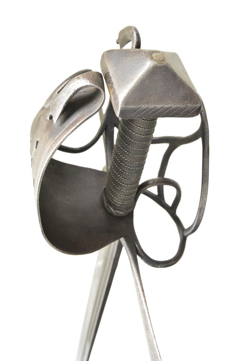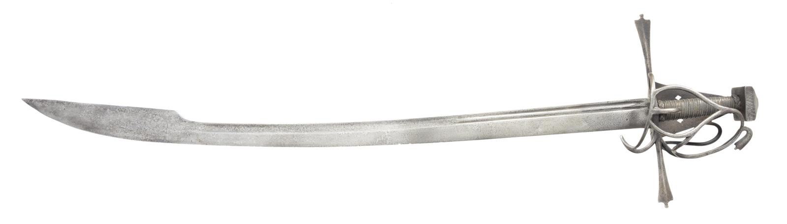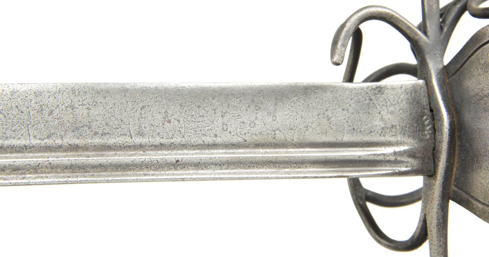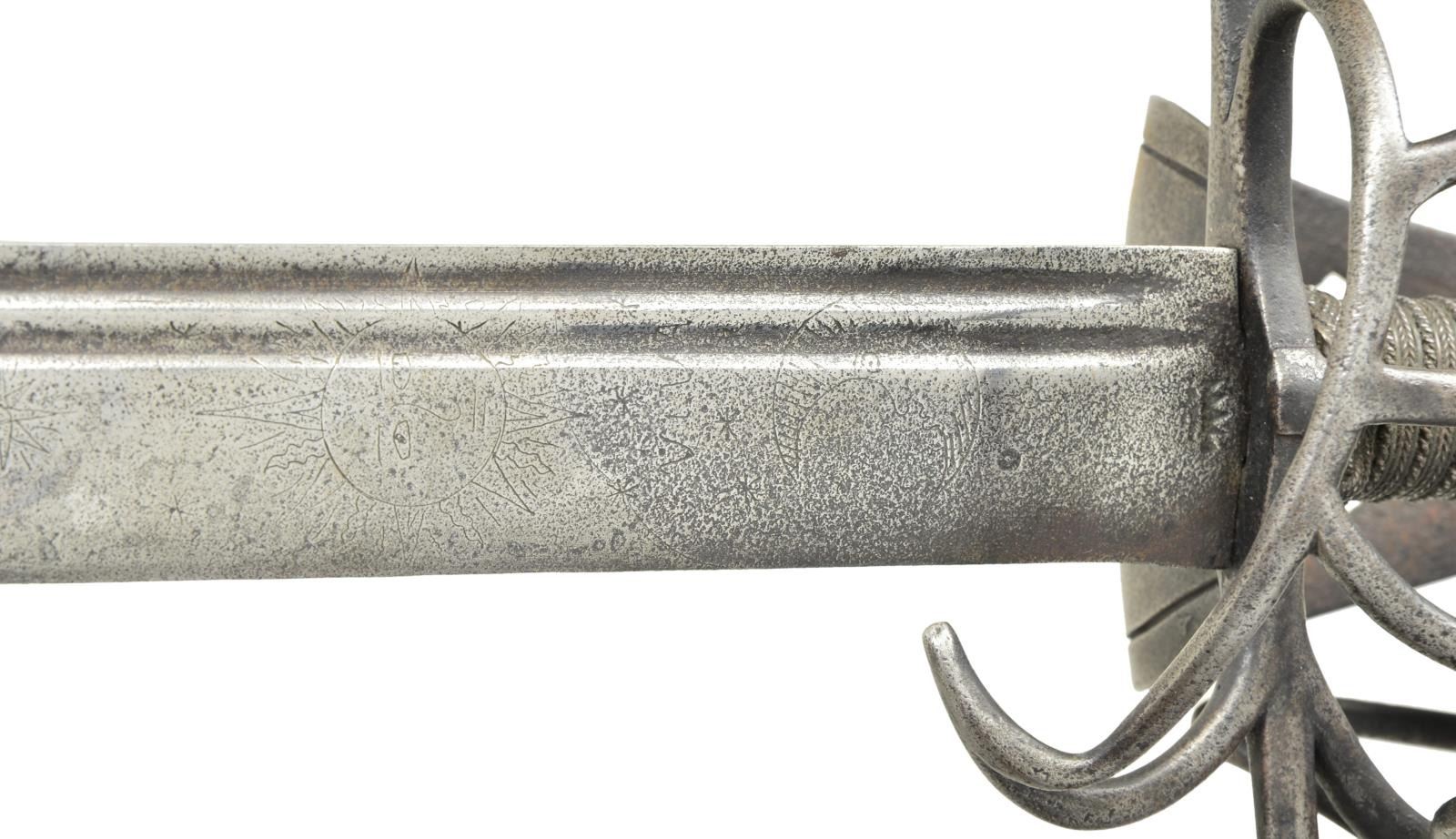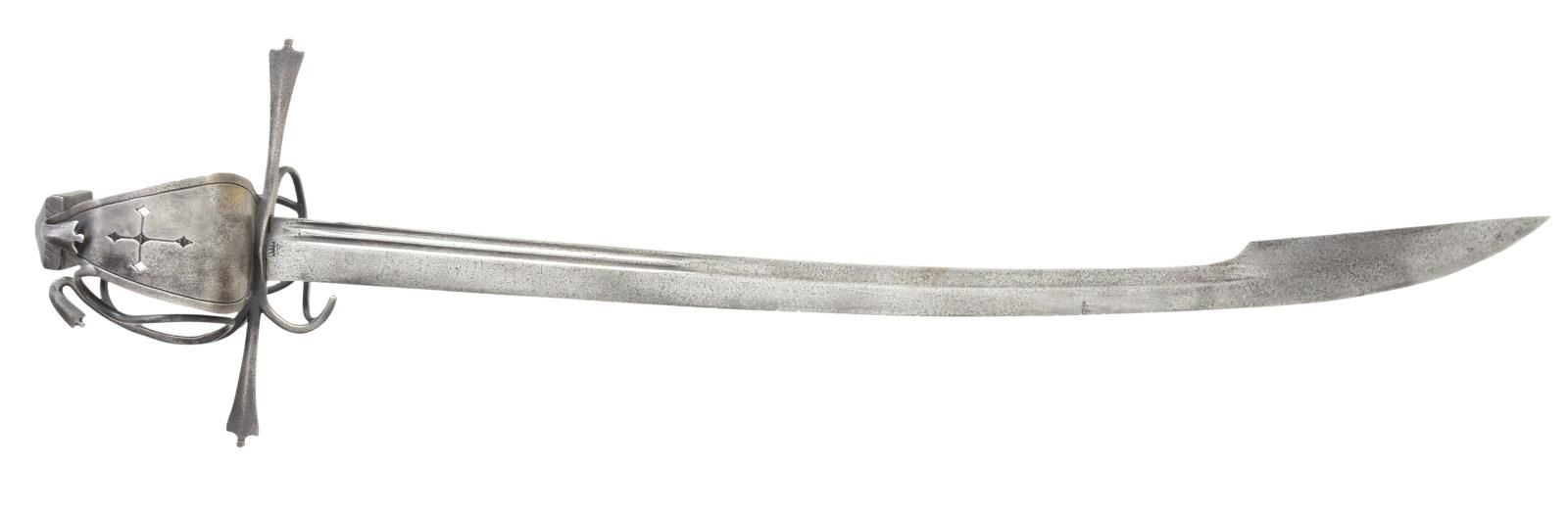 37” overall, 31.5” two fullered blade with large flared tip, etched sun & moon designs with indiscernible proof at ricasso. 9.5” cross guard, branched hilt, Latin cross pierced in basket, wrapped silvered wire grip, 1.75” squared pyramidal pommel. CONDITION: appears all original, unmolested, cleaned iron patina, very good overall. (02-19331/JS). $6,000-8,000.