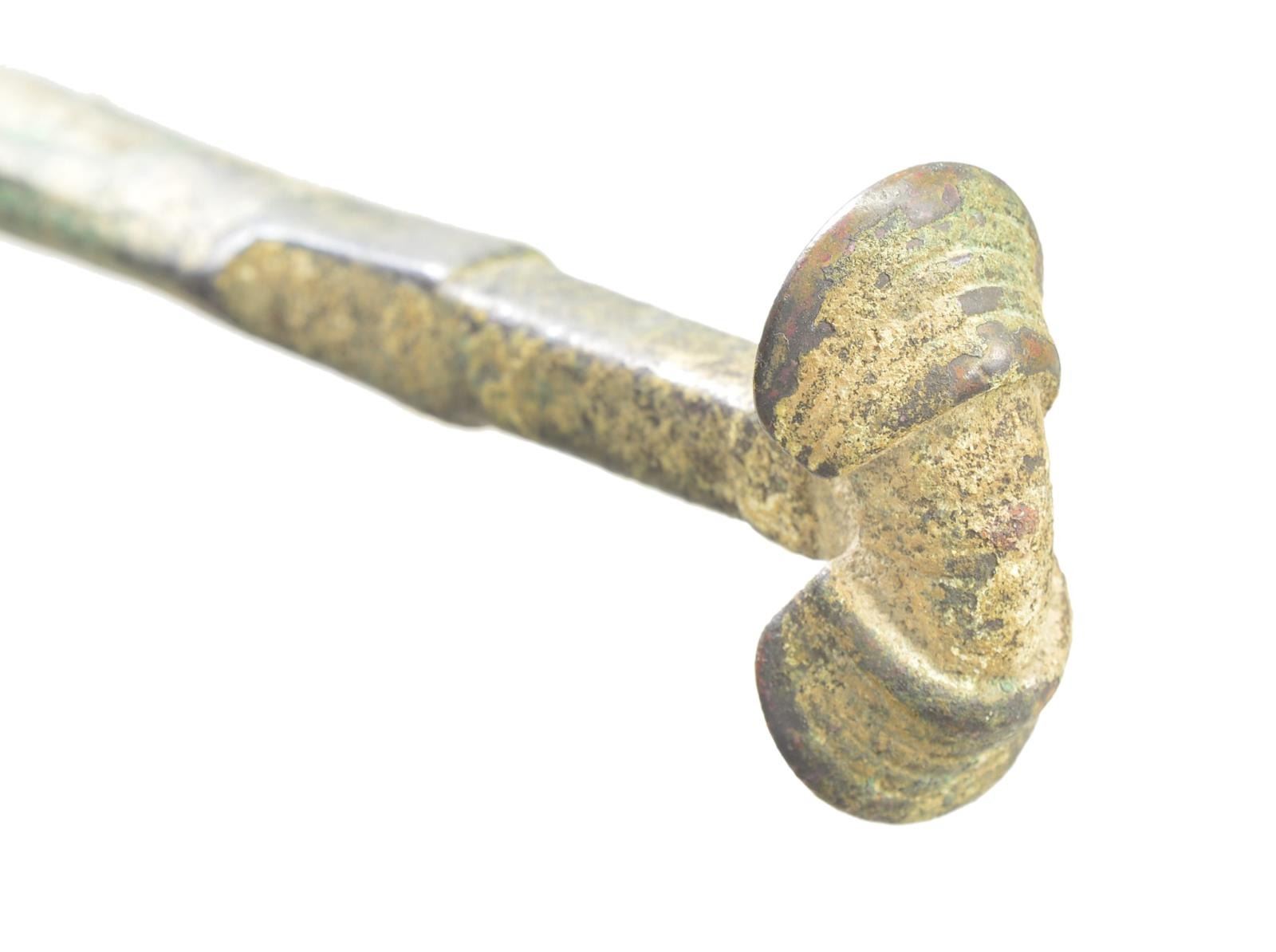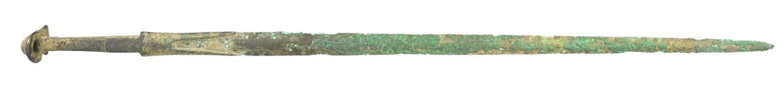 Overall length 34 3/8”. Blade length is approx. 28”. This is an exceptionally long ancient sword from the Province of Luristan dating from aprrox. 1400-800BC. The excavated sword appears to be totally made of bronze or a very similar alloy. All wooden, leather or cord ornaments have long since disintegrated. The blade appears to be elliptical in cross section. The pommel resembles a pair of horse’s hooves. CONDITION: the blade has various shades of green verdigris with the hilt having a darker less green patina. Sword is exceptionally stable for its age. PROVENANCE: From the Lifelong Collection of Glen E. Mattox. (02-18967/BF). $1,200-1,800.
