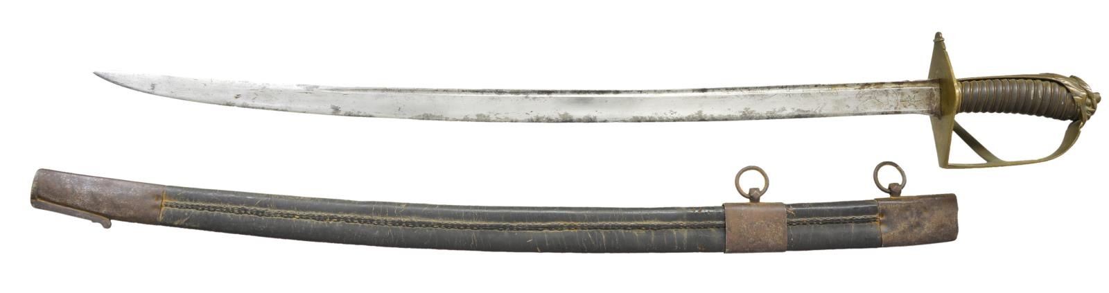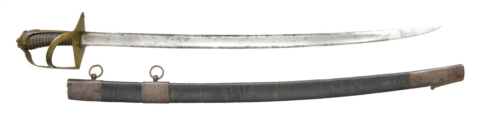 This saber has a stylized eagle pommel that was popular in the early years of the United States, but was also used by many European countries. This sword is quite likely Provincial French or possibly Italian. Overall length 35 3/4". Blade length 27 3/4". Blade has a single wide fuller and a single narrow fuller near the spine. The first 1/3 of the blade is decorated with various talismans, including the sun, moon & various stars. Brass hilt with an interesting diamond shaped guard & plain knuckle bow with a single interconnecting branch. The backstrap is also plain and is topped by a well-executed eagle’s head. Grip appears to be horn but may be a rare figured wood. The wire wrapping is single strand copper. Scabbard is iron mounted black leather. CONDITION: blade shows wear to the etching and has a medium gray mottled patina. The hilt & grip are quite solid and the brass has a deep original mustard patina. Scabbard body shows flexing but is quite solid. The iron mounts have a dark oxidized patina. (02-19476/BF). $1,000-1,400.