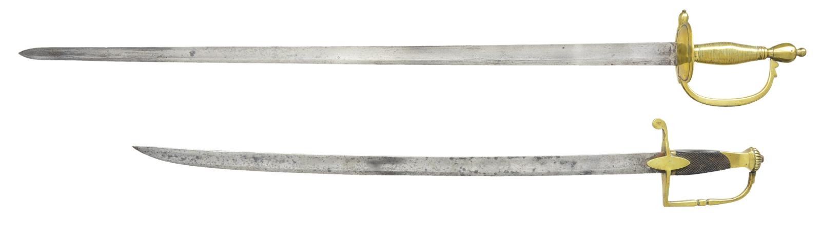 1) GERMAN\ENGLISH. Overall length 39 3/4". Blade length 32 3/4". An interesting sword that greatly resembles the British M1796 Infantry Officers sword. This example is of decidedly earlier manufacturer likely dating from the 1760’s. These predecessors to the M1796 were popular both in England & Germany with most of the earlier examples being made in Germany. Plain blade with a single wide fuller. Solid brass hilt with a double kidney guard and protruding quillon. Plain knuckle bow ends in a faceted pommel. Brass wire wrap grip. No scabbard. CONDITION: blade has a light gray cleaned somewhat mottled appearance. The hilt has a pleasing mustard patina.