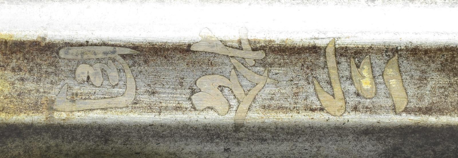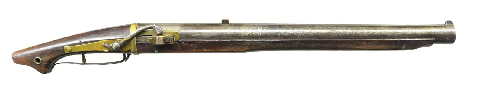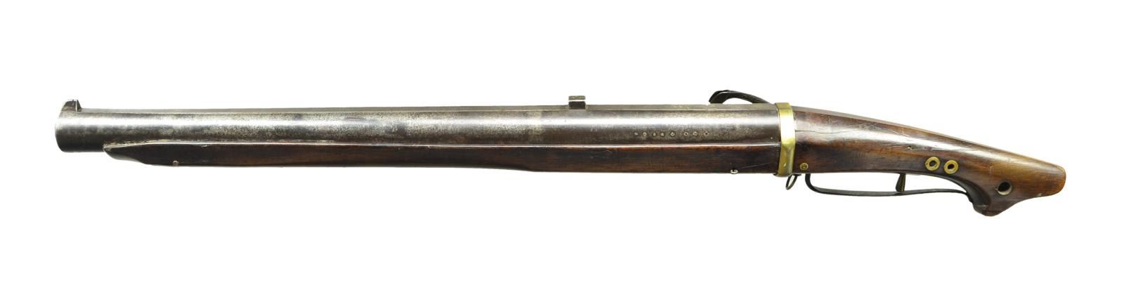 CHUC-ZUTZU. Cal. 1.09". NSN. These very large caliber guns are essentially hand cannons and were probably best used when rested on some support. This well used gun has very heavy 27 1/2" ovate barrel measuring around 2 1/4" at breech end. Barrel tapers toward muzzle and ends with a small flare. Traditional sights are fitted. Breech section is inlaid with three Japanese characters. Eight more are stamped on left side at a later date. Breech is also fitted with brass flash guard and hinged pan cover. Boss is stamped with some Japanese letters. Lock is brass and has iron serpentine inlaid with brass and silver flowers. Similar inlay is on iron trigger guard. Stock is of evergreen oak and is traditionally shaped; front portion with flats on bottom. CONDITION: good. Barrel showing considerable cleaning to bright highlights over brown pitted patina. Brass cleaned and lacquered is toning. Stock with old oil refinish shows considerable wear. Lock is good. Bore is dark with considerable pits. PROVENANCE: From the Lifelong Collection of Glen E. Mattox. (01-22457/MGM). ANTIQUE. $4,000-6,000.