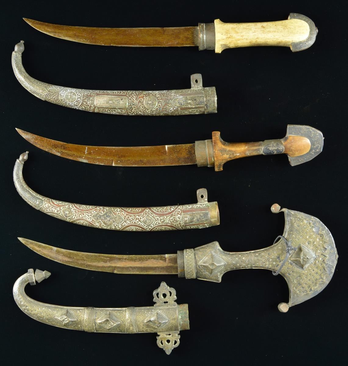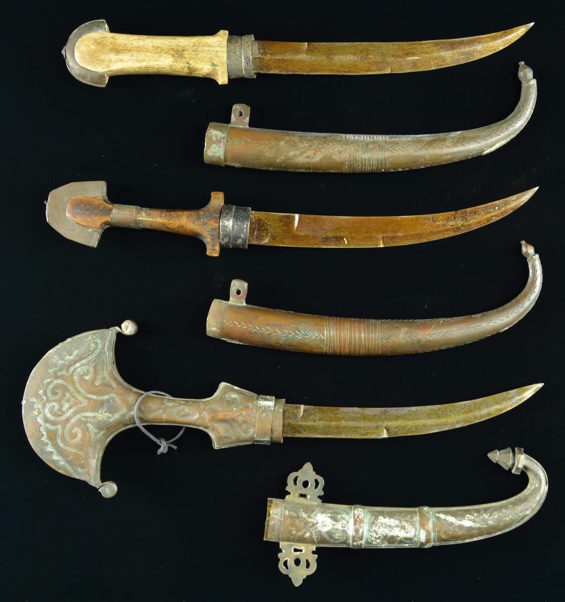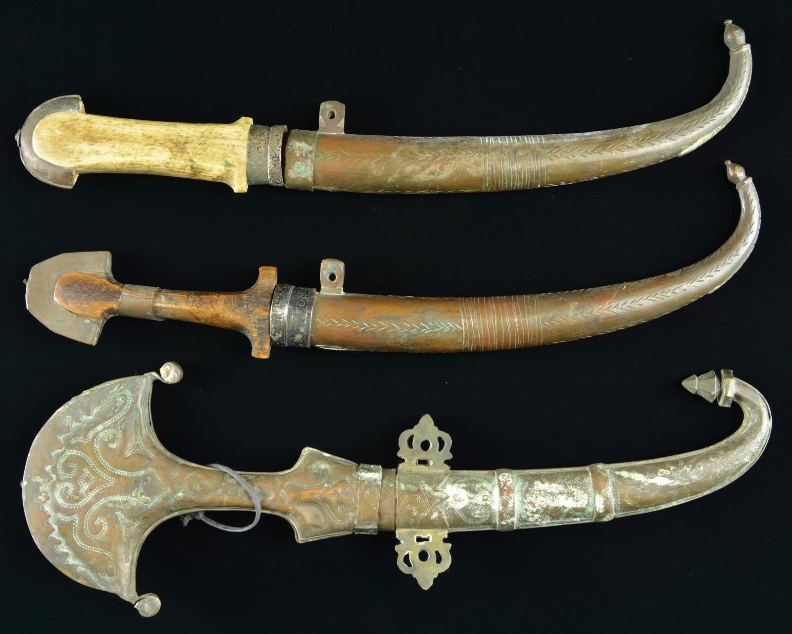 2) Overall length: 16”. Blade length: 9". Plain curved blade with silvered brass ferrule and top comb. The grip is carved bone with a silver inlaid metal band at the top. The sheath is decorated brass with silver inlays. CONDITION: light to moderate overall wear.