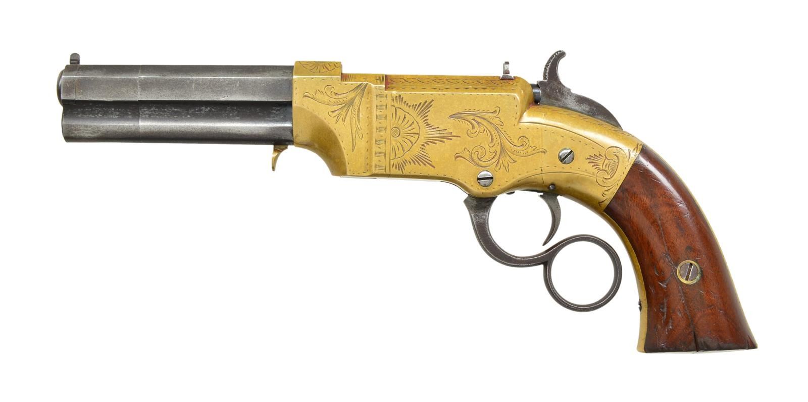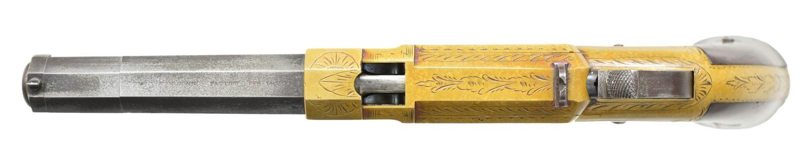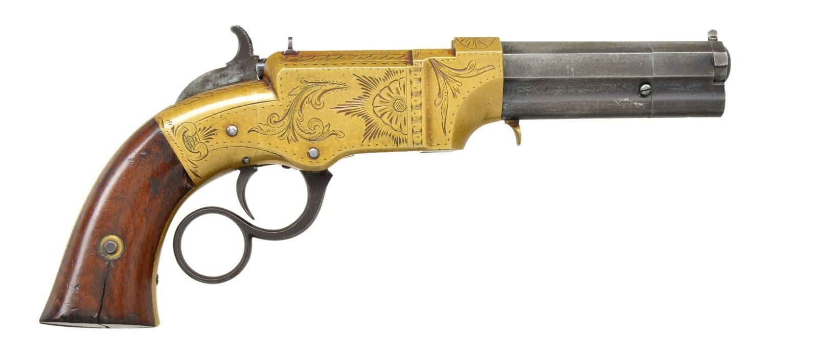 Cal. 31 Volcanic. S# 902. Bbl. 3 1/2” octagon w/ integral mag. Shroud at muzzle rotates for loading. Top flat is marked “NEW HAVEN CONN. PATENT FEB 14 1854”. Brass frame w/ factory engraving. Open pattern engraving consists of sunbursts & floral patterns w/ foliate highlights & fancy borders. Blade front sight w/ fixed V notch rear sight. 2 piece walnut grips are numbered to the gun on the inside. Reorganized as the New Haven Arms Co. in April 1857 production continued until 1860. Estimated production of the New Haven Volcanics is about 3,300. CONDITION: very good. Brass shows a pleasing mild patina. Bbl. & mag. tube retain 40% dull fading blue. Right side of bbl. shroud shows a small dent. Original grip finish shows wear w/ handling mark & dents having large cracks extending from the bottom of both panels. Bore retains intact rifling. Hammer fails to hold in cock position & follows when action is cycled. (01-22618/DS). ANTIQUE. $7,000-11,000.