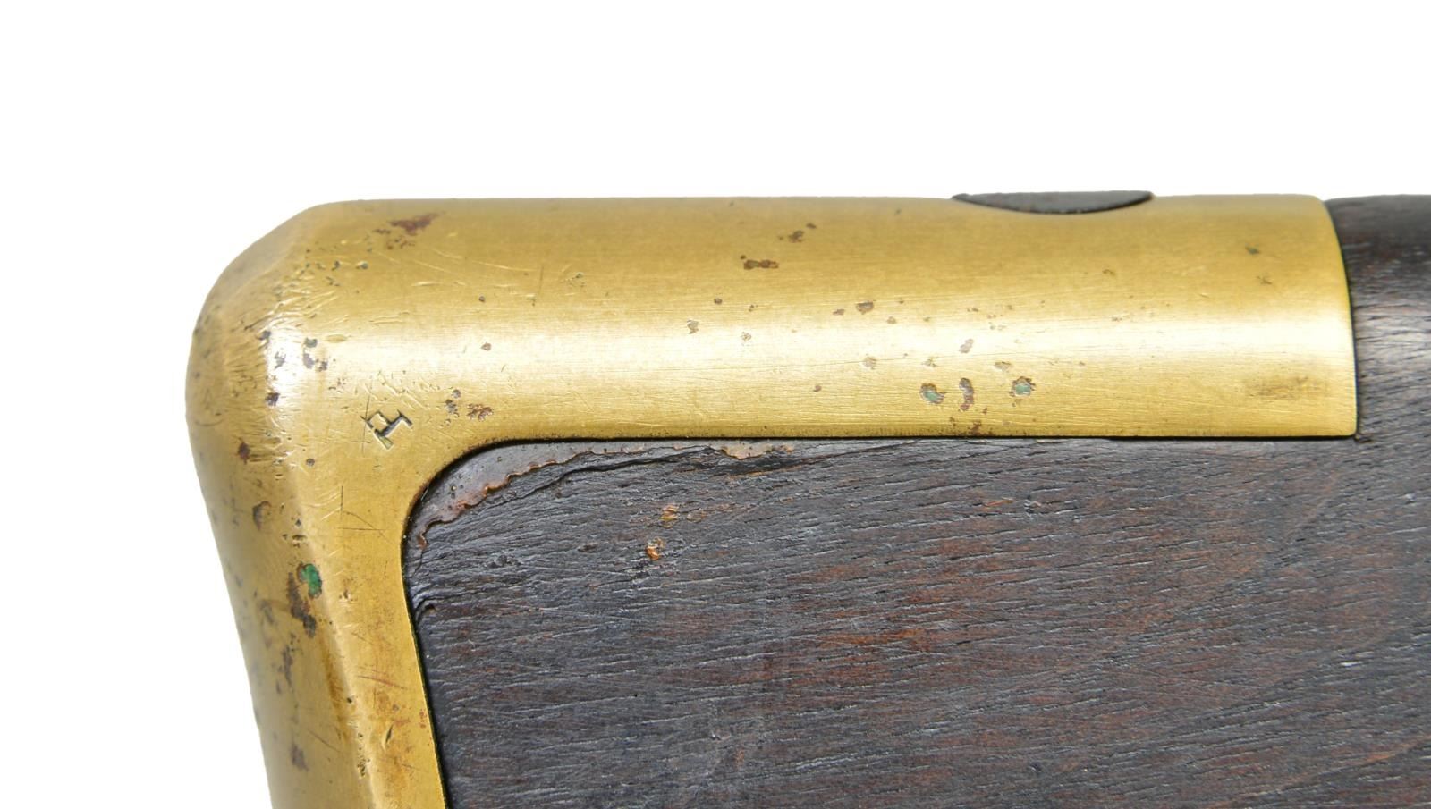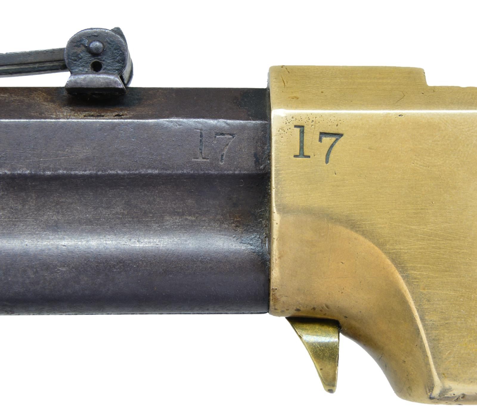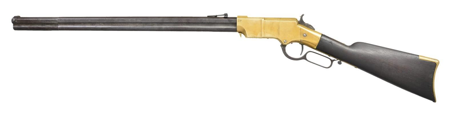 DISTRICT OF COLUMBIA CAVALRY. Cal. 44 rim fire. S# 3071. Bbl. 23 1/4”. The Henry rifle was designed by B. Tyler Henry and was developed from the Volcanic lever action carbine. The Henry was a fundamental advancement in firepower during the Civil War. It allowed 15 consecutive shots to be fired before requiring a reload. This advanced armament was devastating to opposing Infantry troops armed with single shot percussion muskets. The Federal Government purchased 1,731 Henry rifles between 1862 & 1865. Nearly all rifles between the serial numbers 3000 & 4200 were issued to the 1st District of Columbia Cavalry regiments. Over 200 of the DC Cavalry Henry rifles were captured in September of 1864 during the infamous “Beefsteak Raid” by forces under the command of Confederate Major General Wade Hampton. These rifles saw subsequent issue to the 7th, 11th & 35th Virginia Cavalry. The unusual markings of the number “17” on the rear left side of the barrel and in the front left of the frame, coupled with the carved “A” at the left wrist, may indicate use and inventory by Confederate forces. This particular rifle has an octagonal barrel with a front sight and a 900 yard rear sight. The loading tube below holds 15 rounds of 44 caliber rim fire ammunition. The top of the barrel is marked “HENRY’S PATENT. OCT. 16, 1860 MANUFACT’D BY THE NEWHAVEN ARMS. CO. NEWHAVEN, CT.”. Between the rear sight and the frame the serial number “3071” can easily be seen. The right flat of the barrel bears the clear inspector’s mark “C.G.C.” for Charles G. Chapman. Under the Chapman mark is the sub-inspection letter “H”. The brass frame has another small “H” stamped approx. 3/8” back from the barrel just below the curve. Serial number “3071” may also be seen on the lower receiver tang that is concealed by the buttstock. All screws on the frame are original. The brass buttplate has a clear “H” stamped on the right-side top near the bend. The buttplate is also serial numbered on the inside “3071”, and the cleaning rod door is present, but there is no rod within the stock. The oil stained walnut stock has an “A” carved into the wood just below the frame tang. As stated above, it is important to note that the atypical marks of “17” at the rear of the barrel and in front of the frame, combined with the “A” carved into the stock, may indicate capture & reissue to Confederate Virginia Cavalry. UNATTACHED ACCESSORIES: a looseleaf binder containing information about Henry rifles in general, this particular Henry, and the 1st District of Columbia Cavalry. There is also information relating to the “Beefsteak Raid” orchestrated by Confederate General Wade Hampton. And a copy of the book “Spies, Traitors & Conspirators” by General Lafayette C. Baker with detailed information about the “Beefsteak Raid”. CONDITION: all iron parts have a pleasing dark patina with ample vestiges of the blued finish remaining. The brass frame & buttplate have a very attractive mellow patina. The cleaning rod cover in the buttplate is tight and functions freely. The stock has 2 tight, short cracks behind the receiver, as commonly seen. As expected, the barrel, frame & stock have numerous superficial bumps, scrapes & abrasions. However, the condition of this historic Henry rifle can be considered outstanding in comparison to most martially marked Henrys and particularly those associated with the 1st District of Columbia Cavalry. The mechanics operate correctly & smoothly with no observable problems. The bore shows use, but retains strong rifling. (01-23202/BF). $30,000-40,000.
