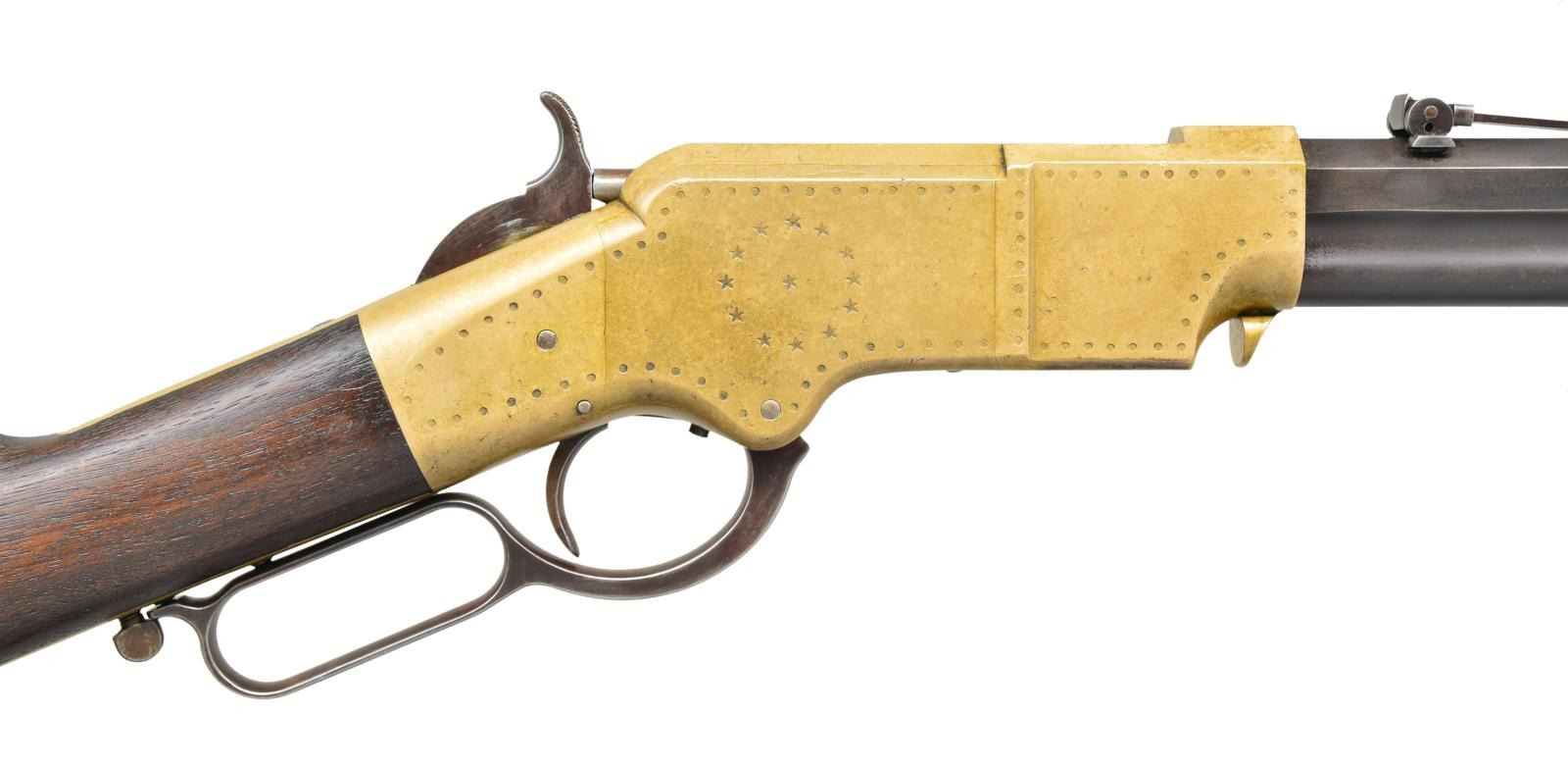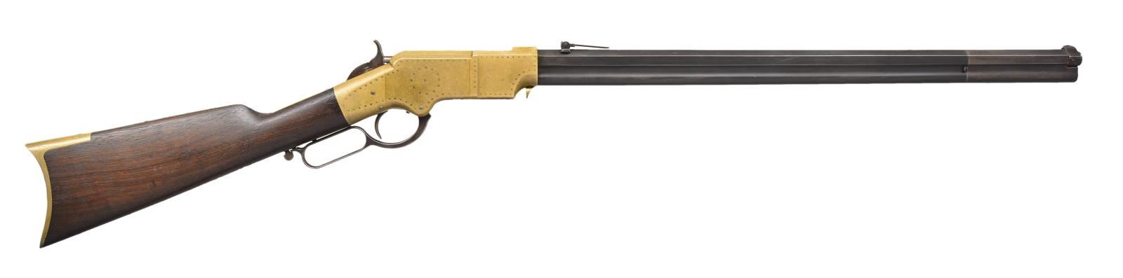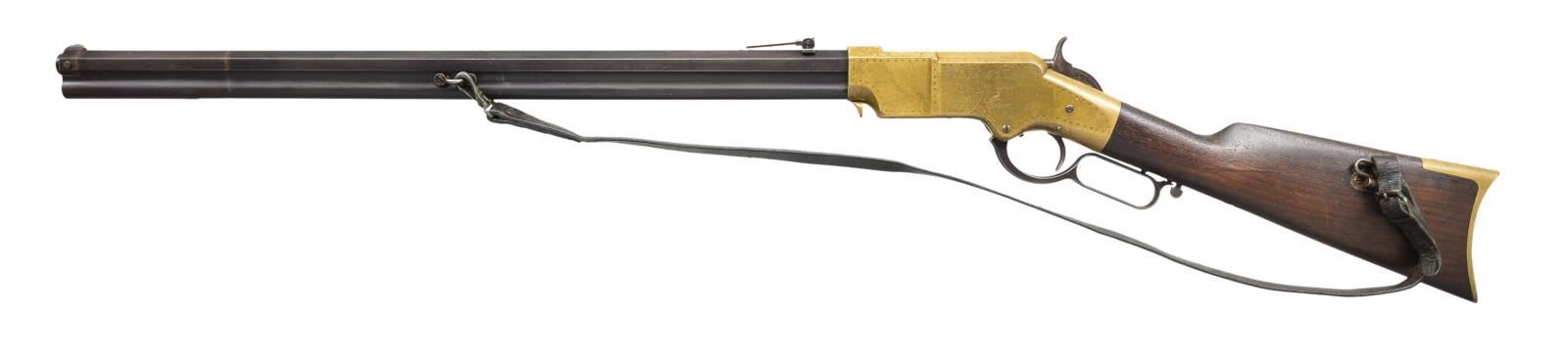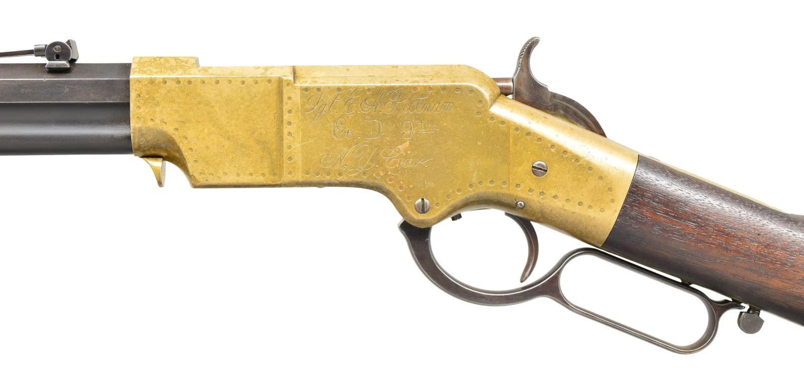 COMMEMORATIVE PRESENTATION). Cal. 44 Henry RF. S# 5228. Bbl. 24" octagon with sharp late style barrel markings. Integral magazine, rotates for loading. Brass blade front sight with 900 yard graduated leaf rear sight. Brass action has post-war inscription and decoration. Left sideplate engraved “Sgt. E.A. Putnam / Co. D. 9th / N.Y. Cav.”. Right sideplate is decorated with a circle of 12 stars having the 13th star in the center. Borders of receiver sides have stamped dot decoration. Top of front receiver ring stamped with 3 stars. Left inside of lower tang, inside toe of buttplate and top tang channel of stock have matching numbers. Walnut replacement stock fitted with original pointed toe brass buttplate with original swing swivel on left side. 5/8" leather sling has a dark worn appearance with an incorrect steel snap. UNATTACHED ACCESSORIES: 4 piece Iron cleaning rod held in stock compartment. CONDITION: bbl. & magazine tube have a rebrowned finish showing edge wear. Action has a mild dark tarnish. Stock shows scattered scratches & marks. Bore retains largely intact worn rifling showing scattered spots of deep pitting. (01-21711/DS). ANTIQUE. $10,000-15,000.