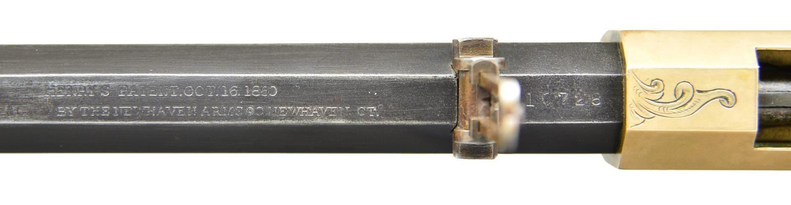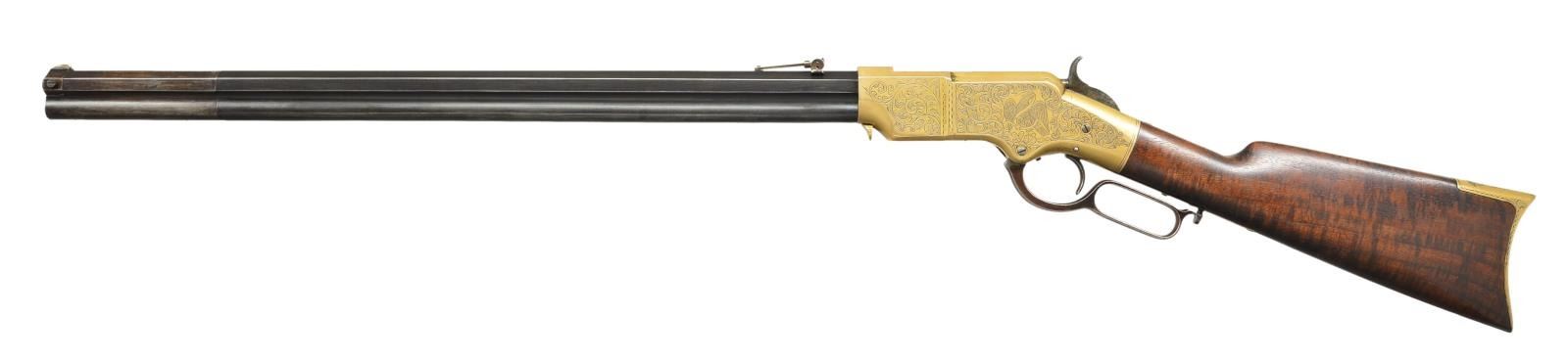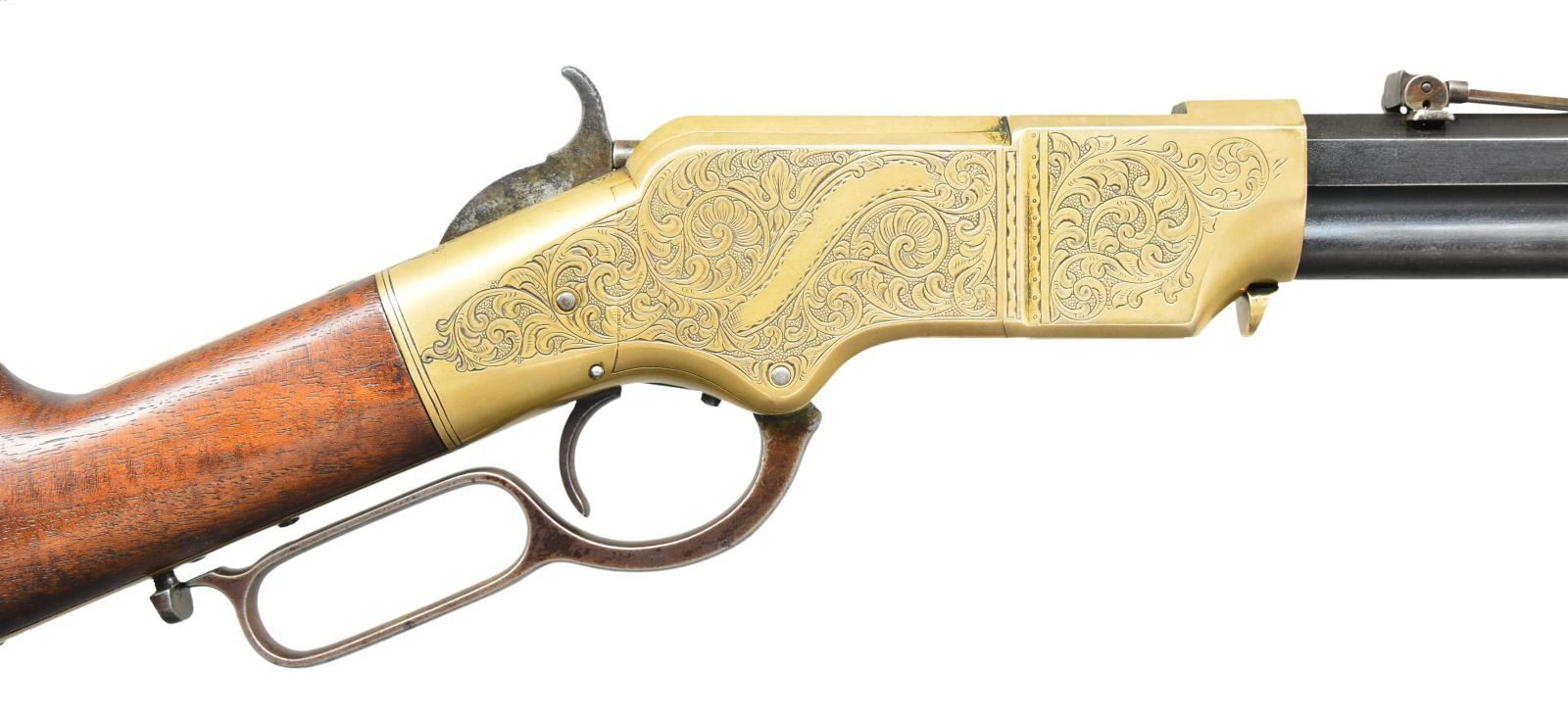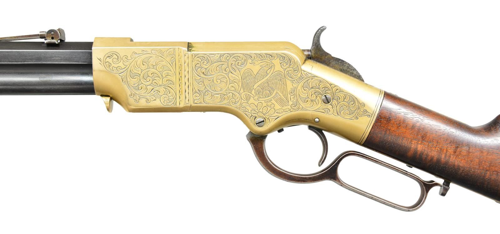 RIFLE. Cal. 44 Henry RF. S# 10728. Bbl. 24" octagon, possible replacement with deeply stamped barrel markings. Integral magazine, shroud rotates for loading. Thinned German silver blade front sight with a 900 yard adjustable leaf rear sight having the smaller V notch in the sight bar. Brass action has generous coverage Mexican style hand engraving of undetermined age. Left sideplate features an eagle and serpent over cactus leaves. Right sideplate has an open banner for possible inscription. These motifs are surrounded by vine type foliate scroll with punch dot backgrounds that cover the majority of the receiver sides. Complimenting engraving and straight line borders extend to upper and lower receiver areas as well as tangs. Barrel, left side of lower tang and toe of buttplate have matching numbers. Lower tang behind lever latch has inspector’s mark “W” indicating inspection by Oliver F. Winchester. Custom stock of fancy fiddle grained walnut with pointed toe buttplate engraved to match action. UNATTACHED ACCESSORIES: 4 piece Iron cleaning rod held in stock compartment. CONDITION: nicely enhanced rifle. Barrel amd magazine tube show rounding on edges with a dull brown gray finish showing edge wear and fading on shroud. Receiver shows a mild applied tarnish. Stock has good finish showing small marks with indention at right of comb. Bore is generally bright with sharp rifling. (01-21724/DS). ANTIQUE. $10,000-15,000.