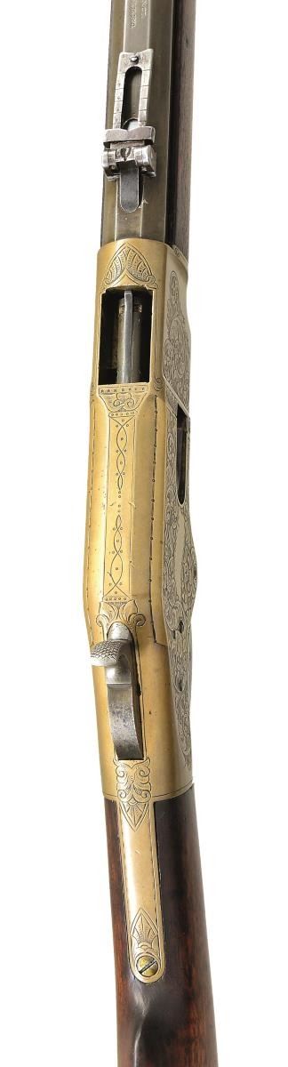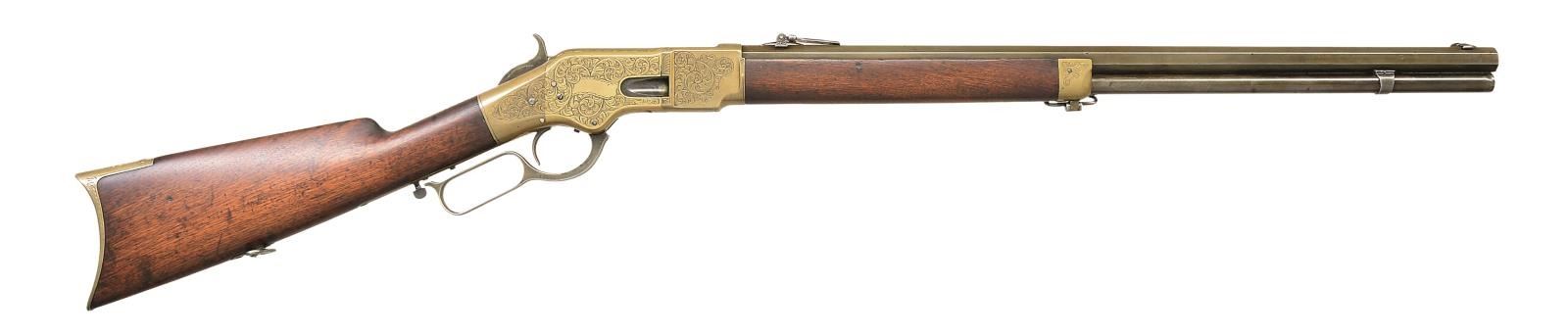 Cal. 44 Henry RF. S# 121449. Louis Daniel Nimschke (July 1832-April 9, 1904) was a German born immigrant who is considered one of the leading firearms engravers of his time. This elegant rifle has American style engraving consisting of flowing foliate scroll w/ punch dot backgrounds on receiver sides. Right side has open banner for personalization. Left side depicts a running bull elk. Complimenting engraving extends to receiver, top & bottom as well as forearm cap & brass crescent trap door buttplate. Bottom of frame has typical “LDN” signature. Bbl. 24” octagon w/ 2 line King’s-Improvement address. German silver blade rocky mountain style front sight w/ graduated leaf rear sight. Walnut forearm & straight grip stock w. sling swivels. Left inside of lower tang is stamped “R”. Top tang channel of stock is stamped w/ last four digits of S#. Lower tang bears inspection marks “F”, “S” & “R”. S# indicates 1874 mfg. CONDITION: brass shows a pleasing mild patina. Right sideplate has a slightly brighter appearance. Bbl. & mag. tube have a light gray brown appearance indicating touch up in the past. Sanded & refinished wood shows numerous scratches, marks & dark bruises. Stock has large chip missing left of lower tang. Forearm has full length repaired cracks along the center w/ added wood repair & long gouge on forward left side. Sound action. Bore retains sound rifling showing spotted light pitting. (01-22807/DS). ANTIQUE. $25,000-35,000.